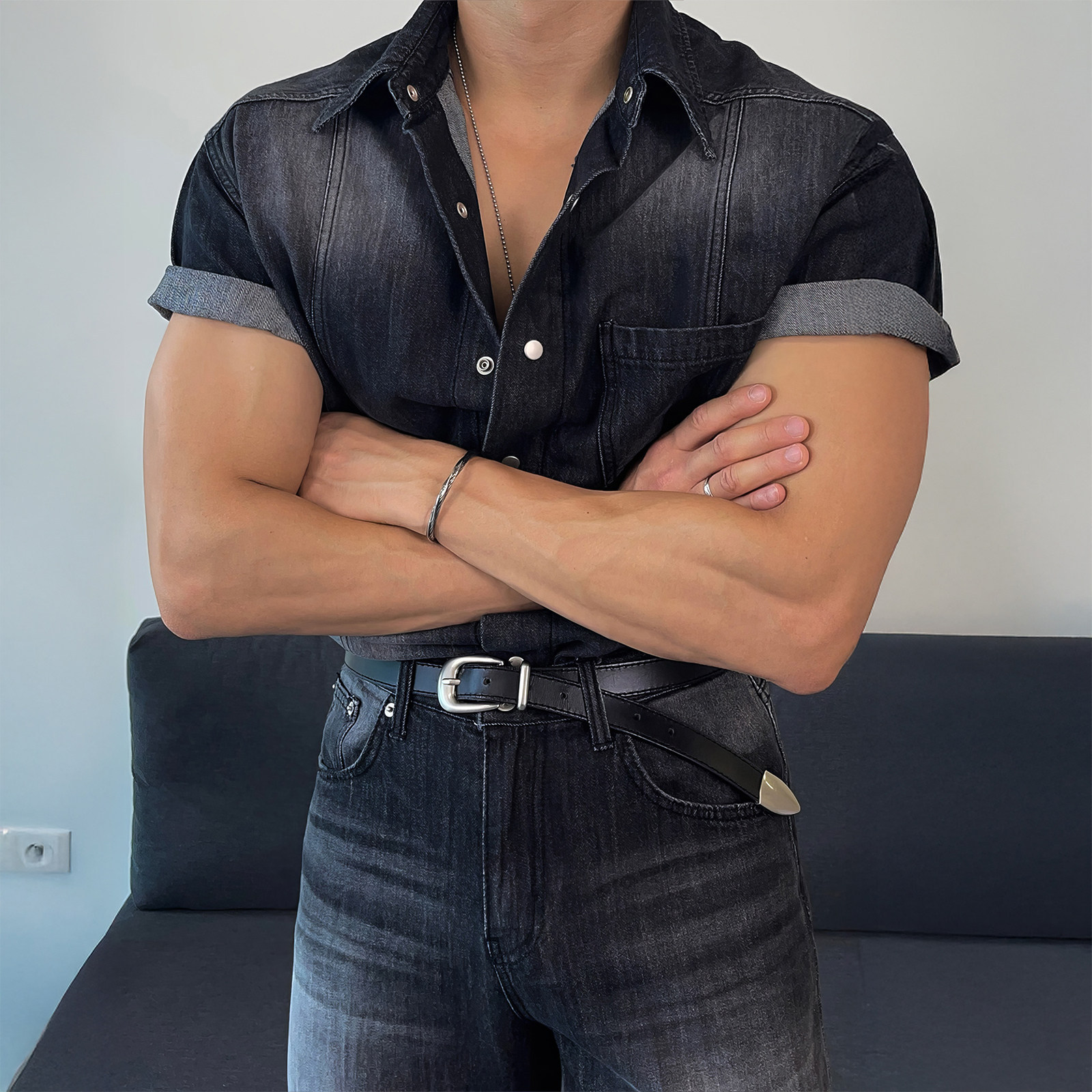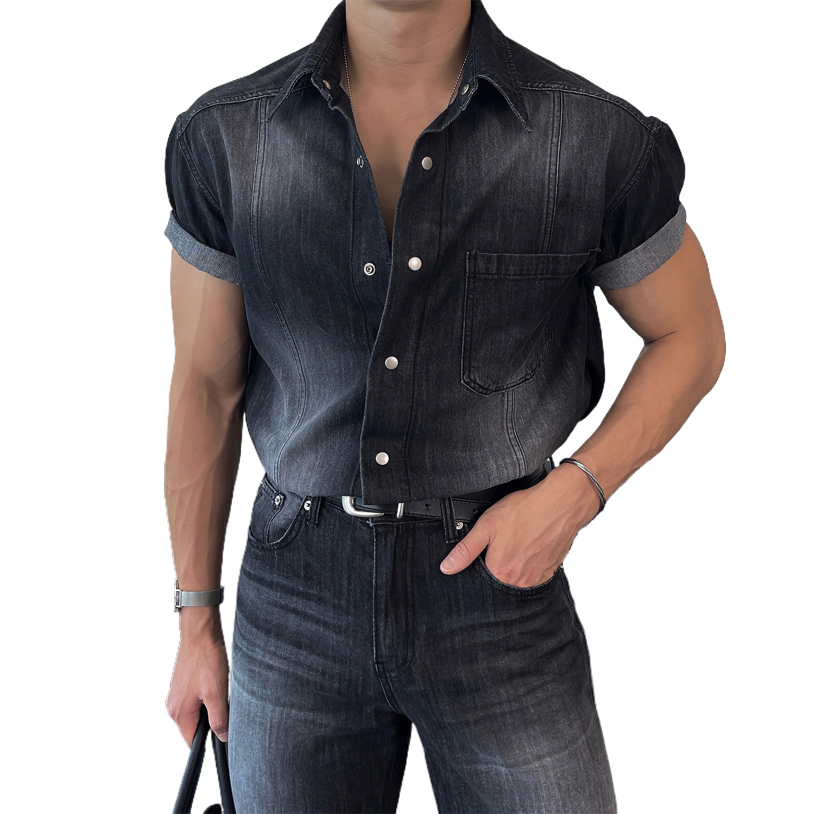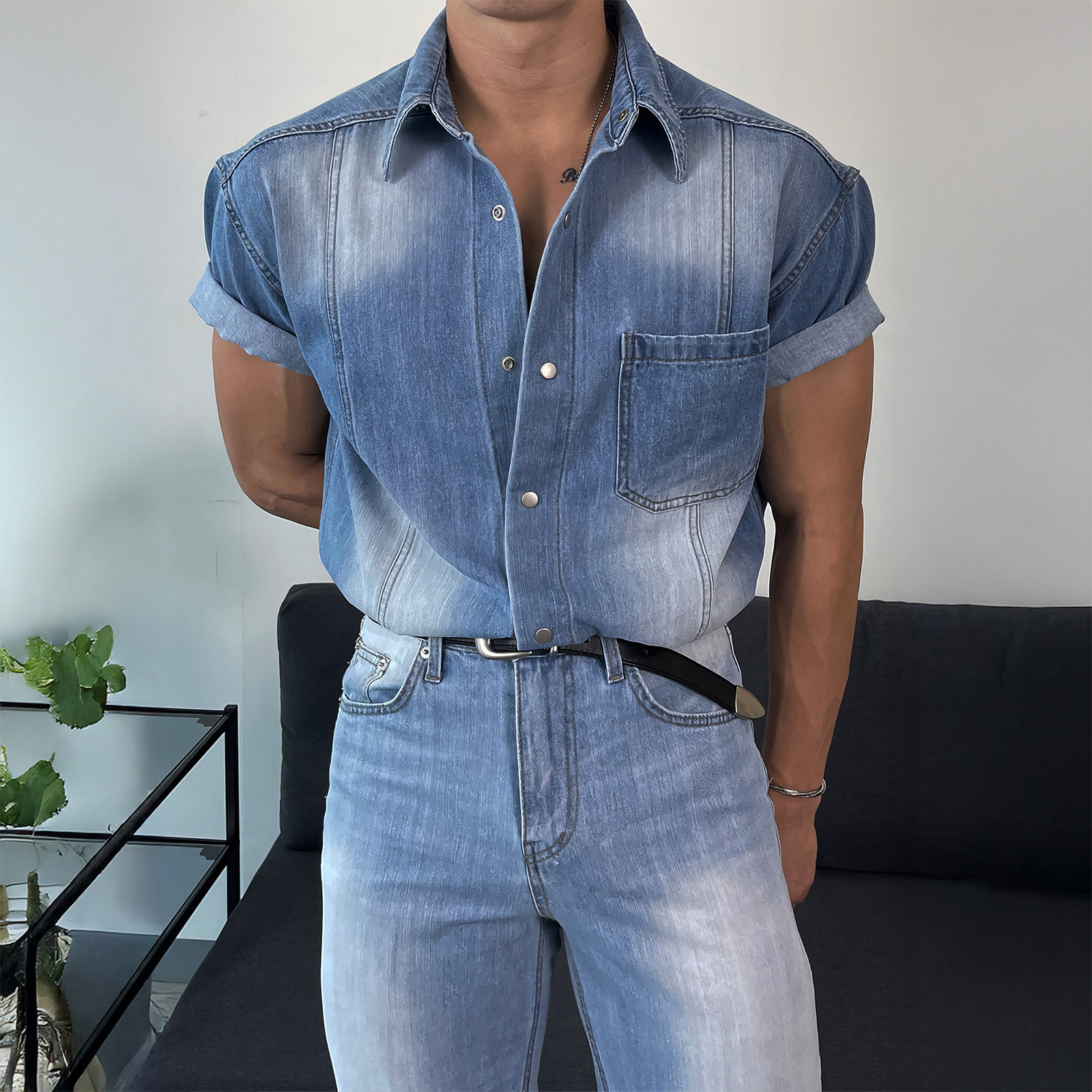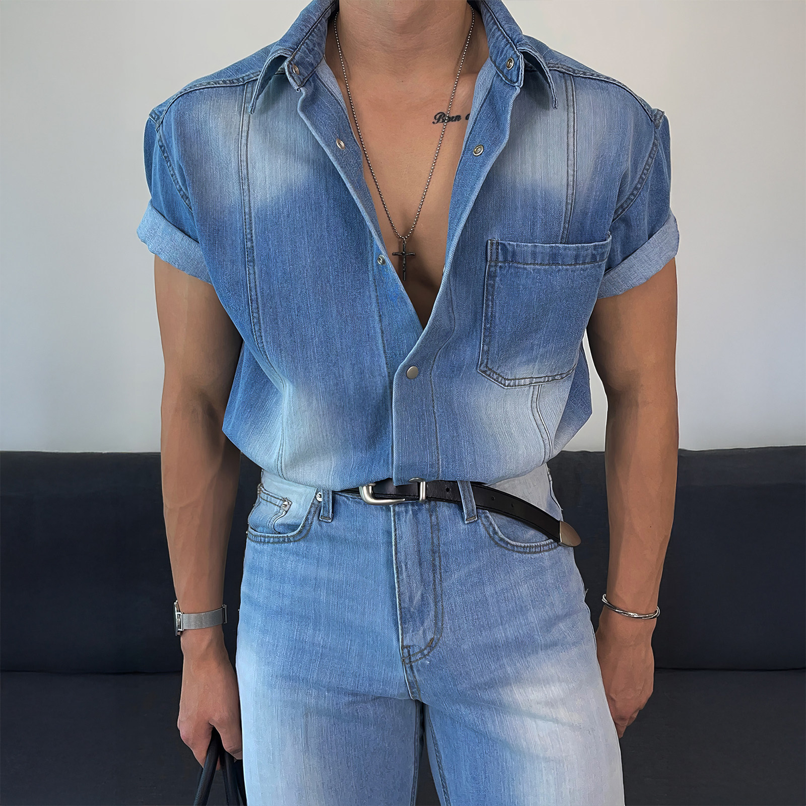 davidme牛仔风水洗短袖衬衫男夏季美式复古做旧衬衣翻领拼接上衣