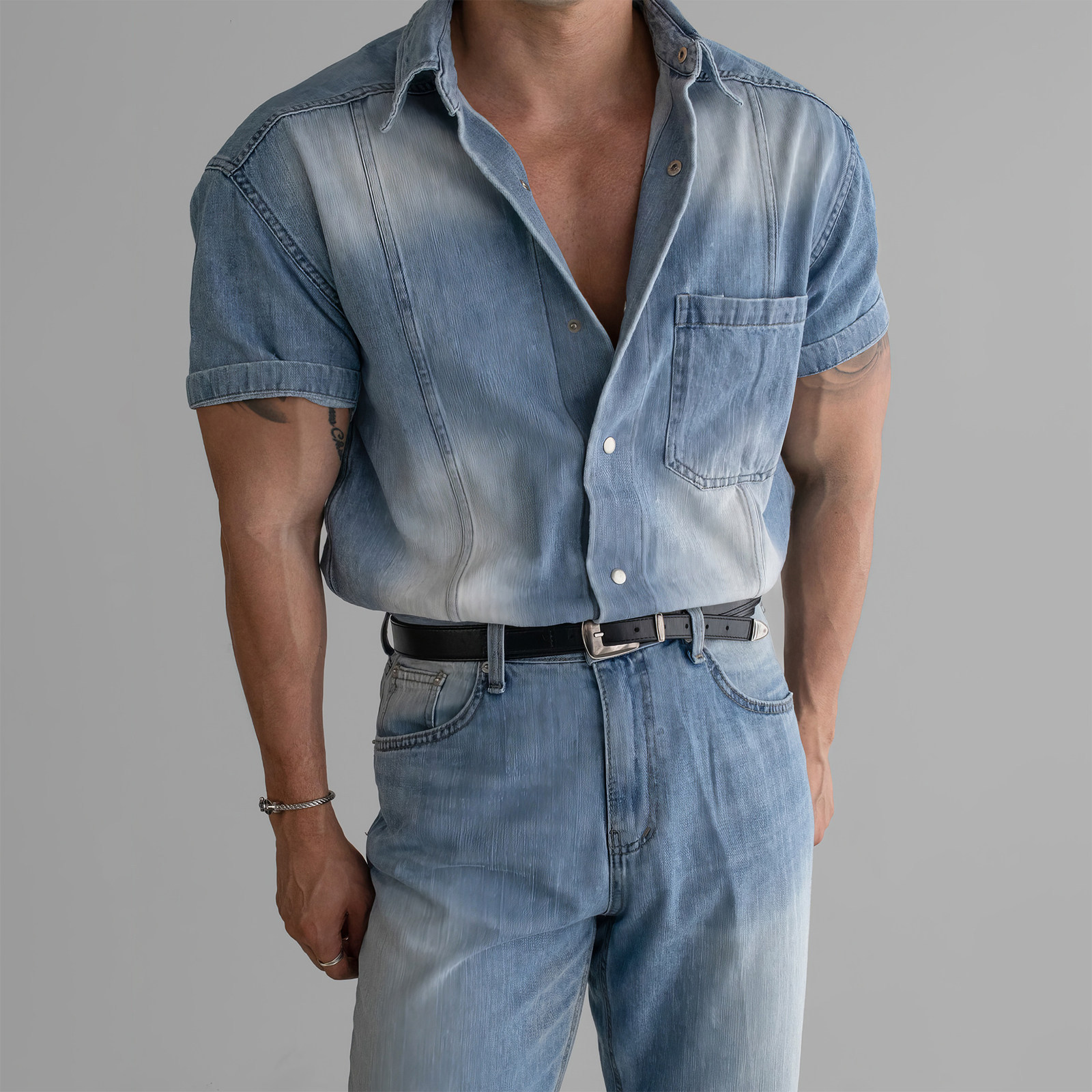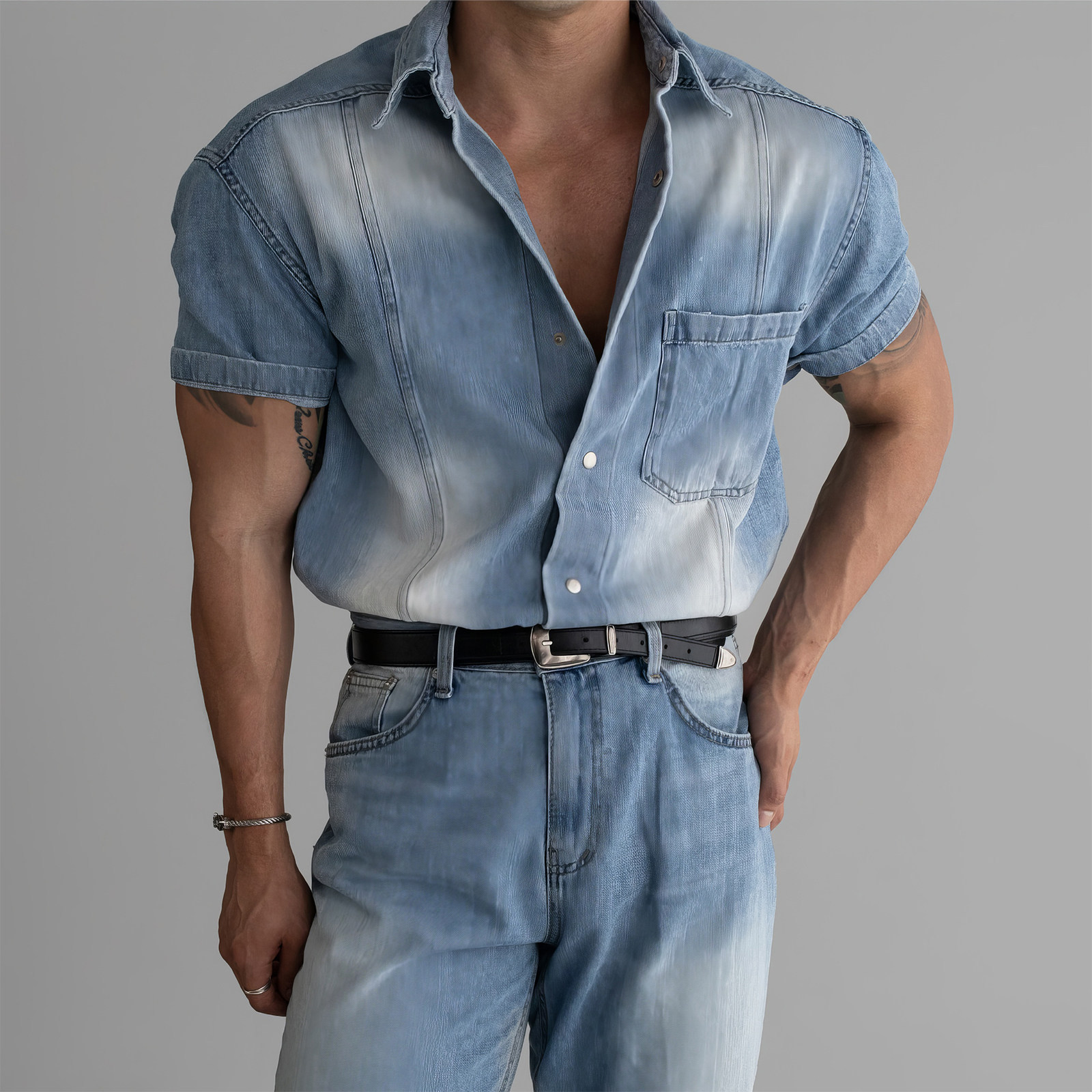 798 Design蓝色复古水洗做旧短袖牛仔衬衫男款小众老钱风设计衬衣