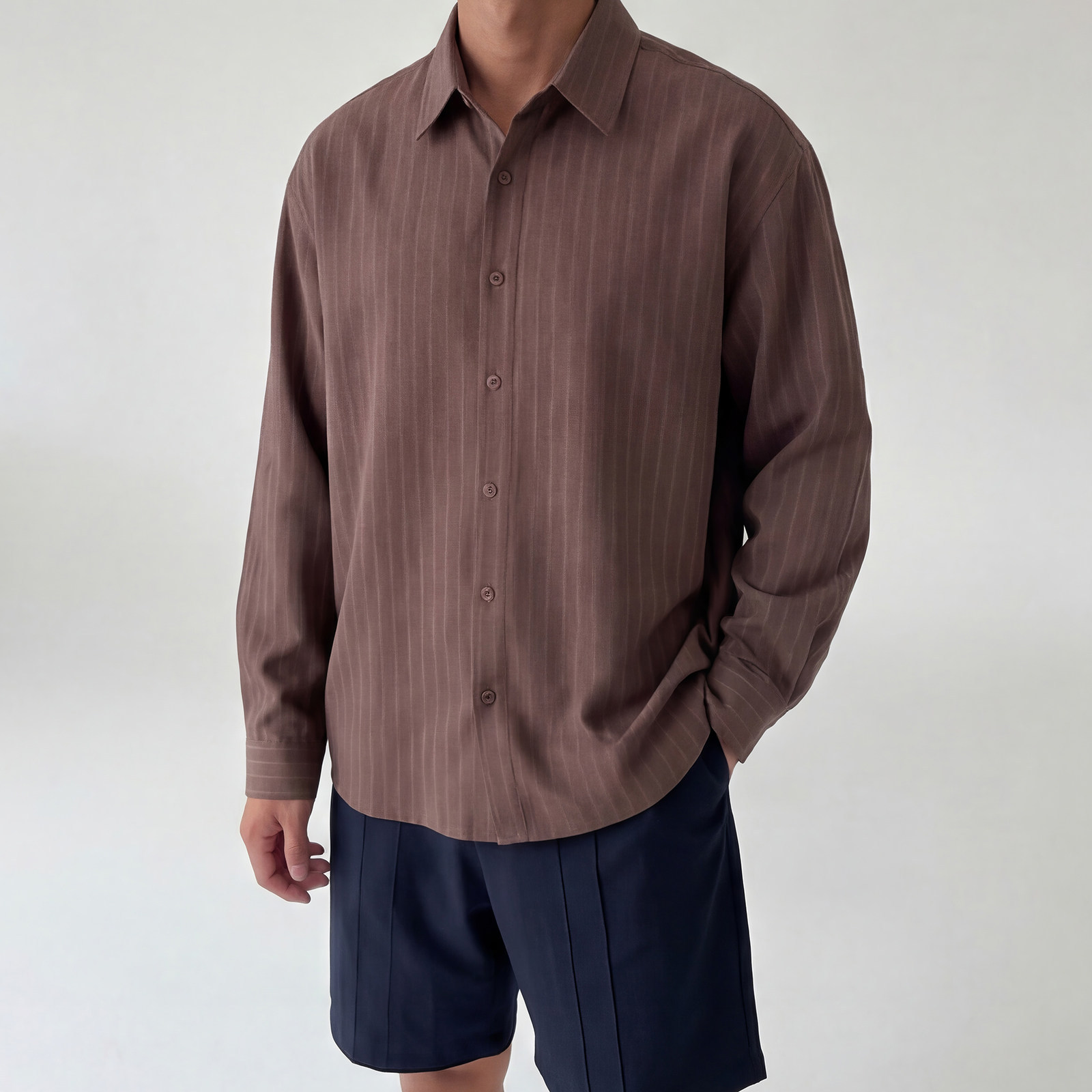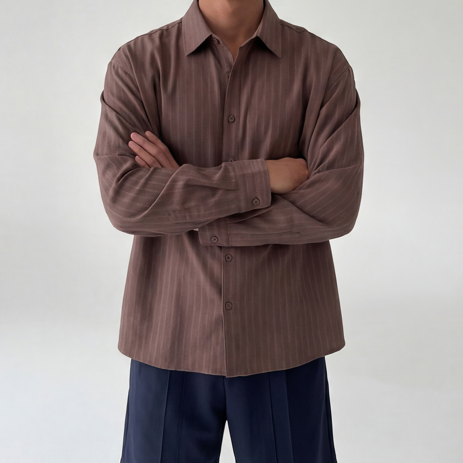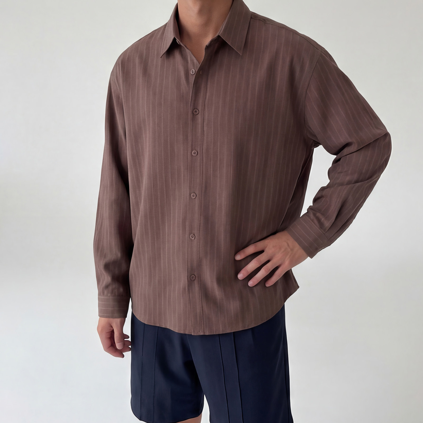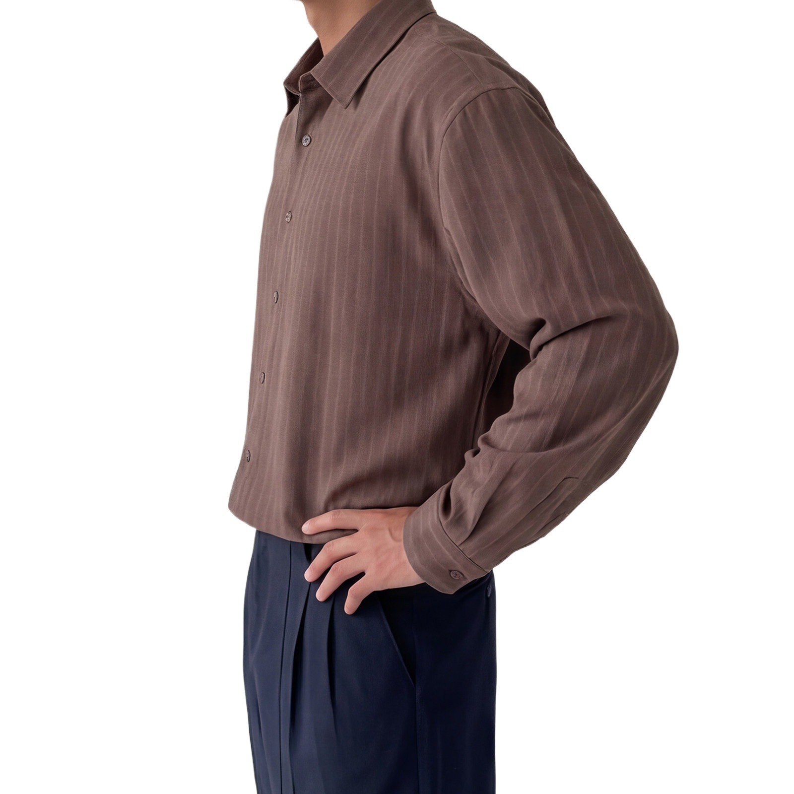 davidme棕色条纹长袖衬衫男春秋老钱风休闲宽松免烫透气翻领衬衣