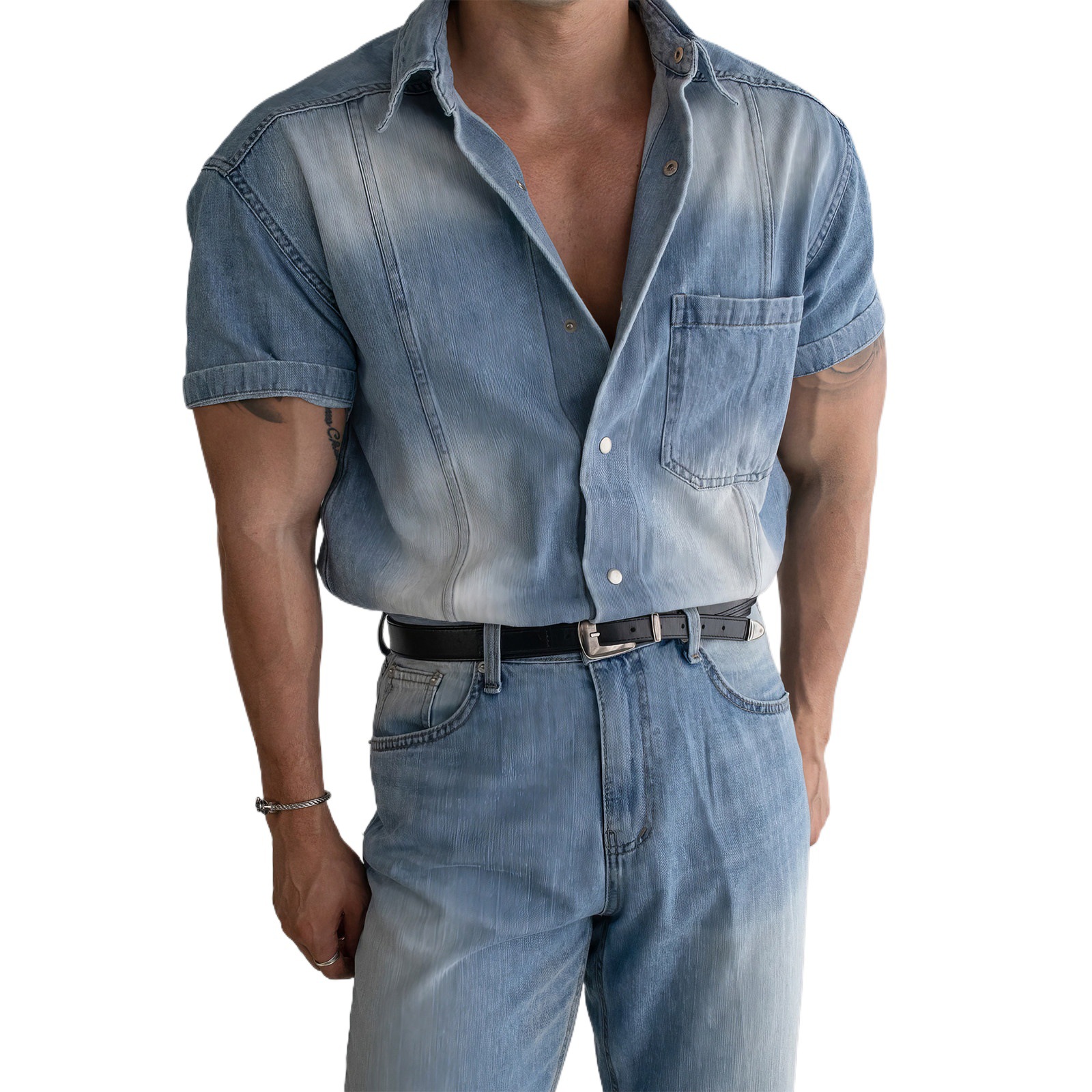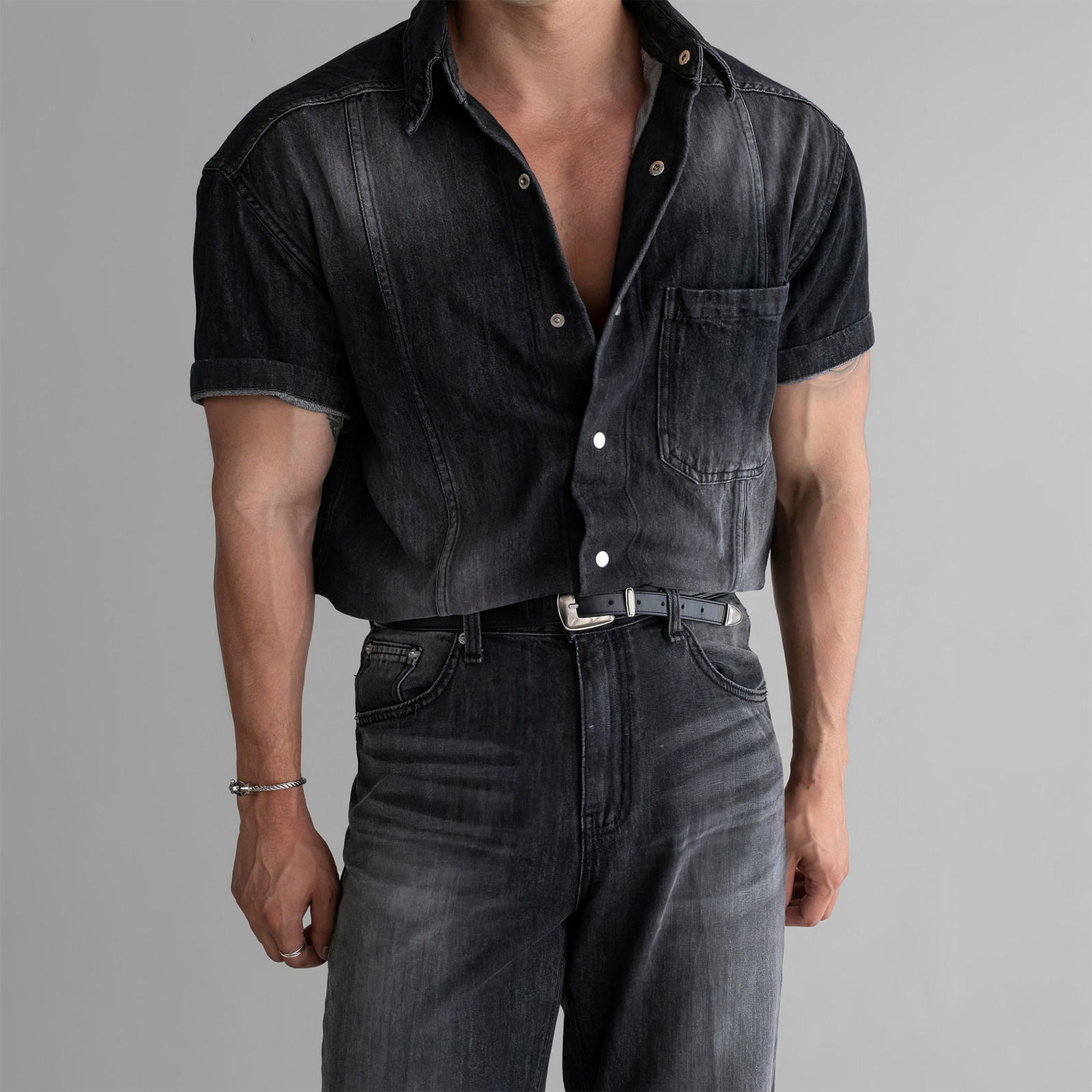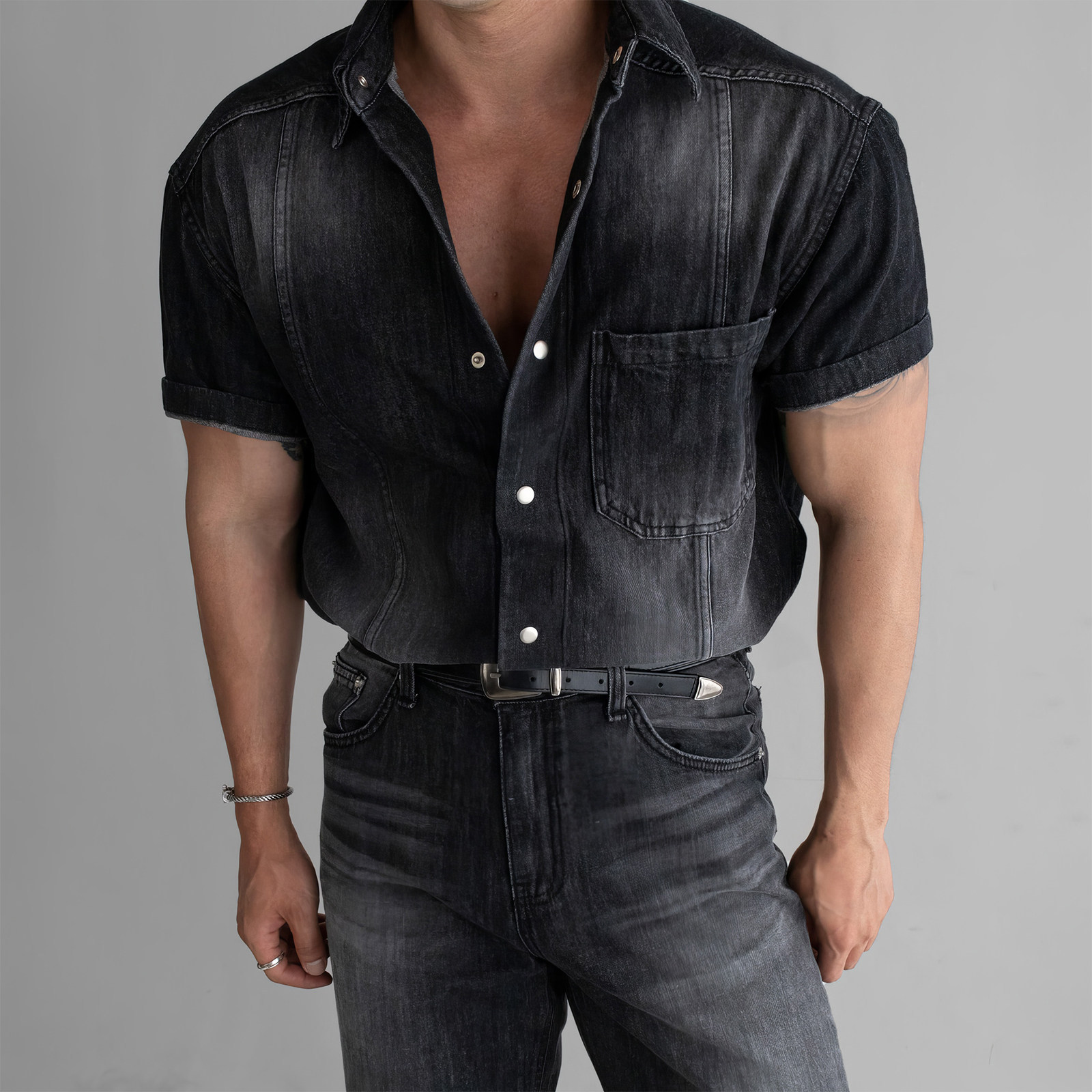 798 Design黑色美式牛仔短款衬衫男夏季潮流渐变水洗做旧小众衬衣