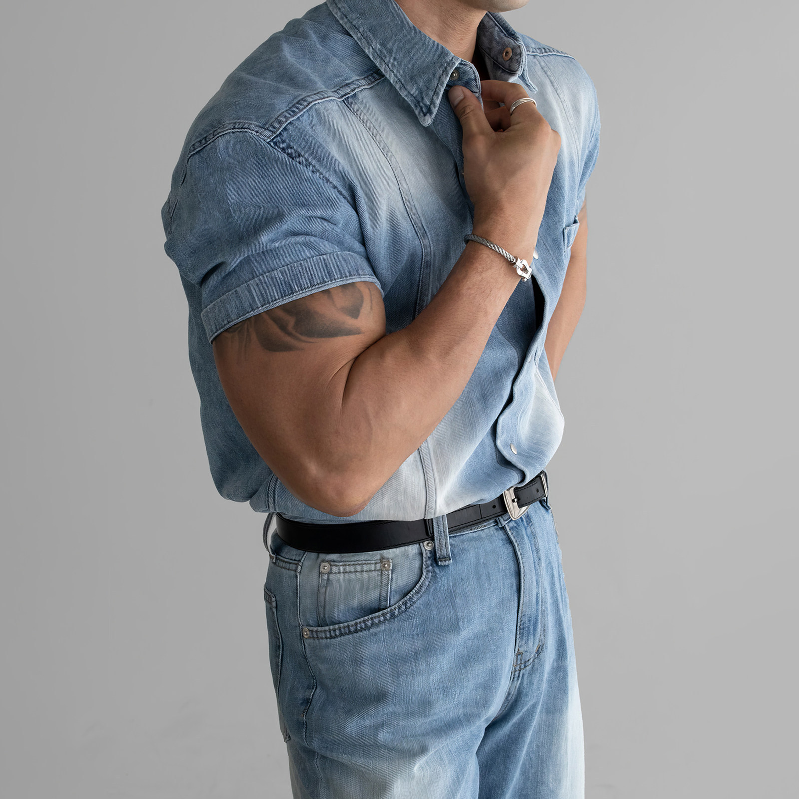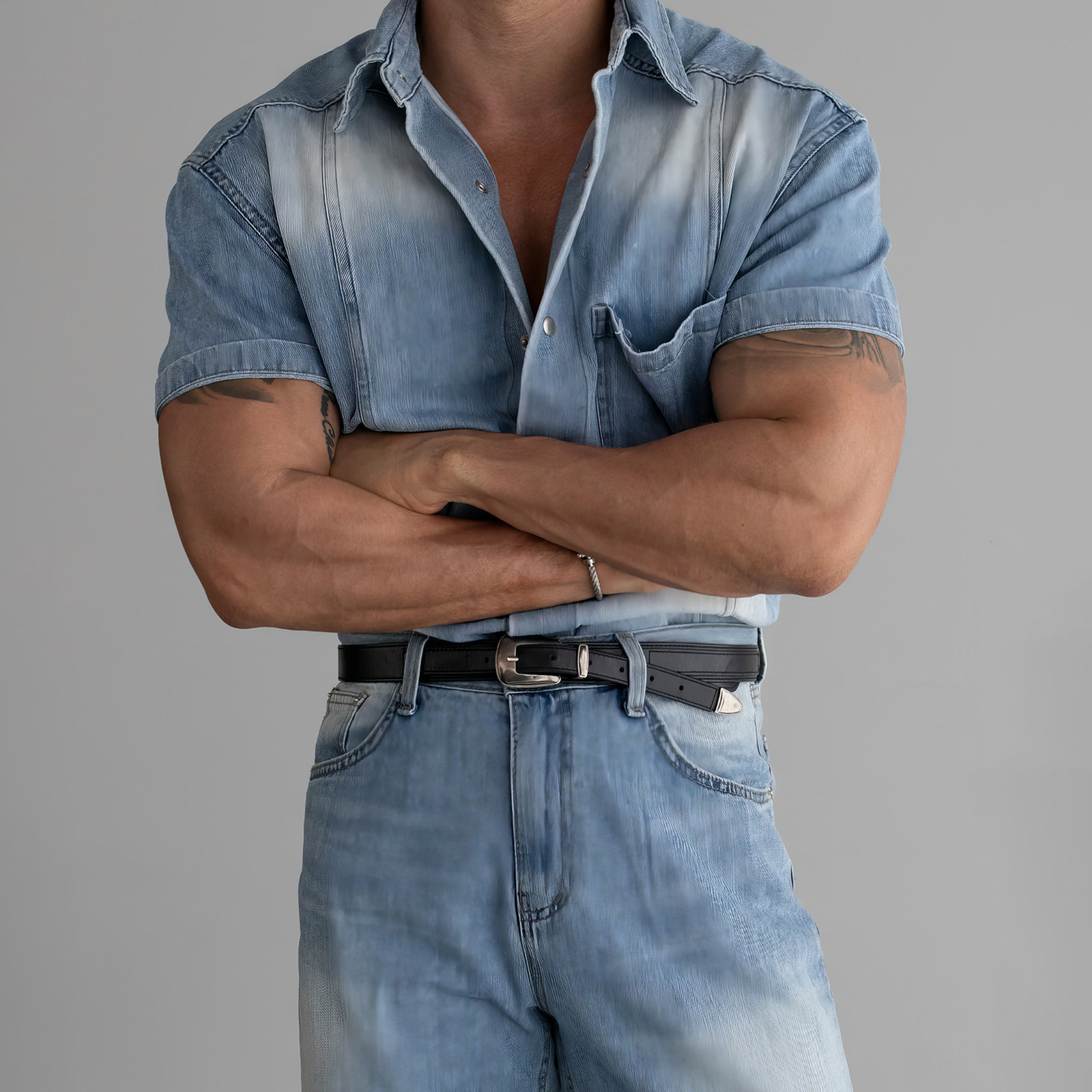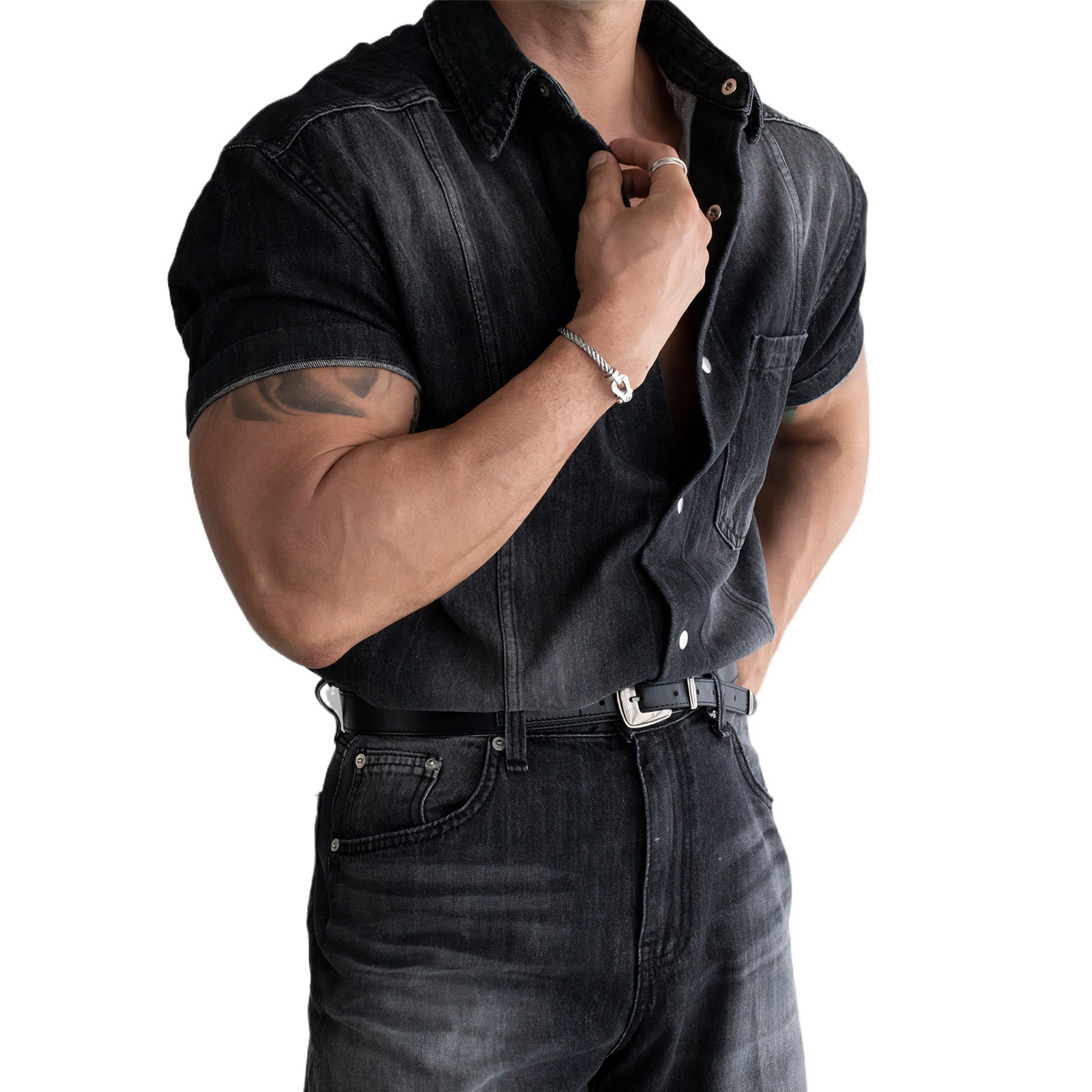 davidme水洗蓝色牛仔短袖衬衫男夏高级感痞帅风工装休闲衬衣上衣