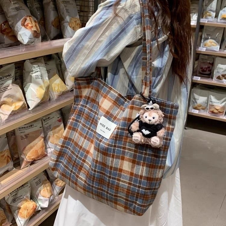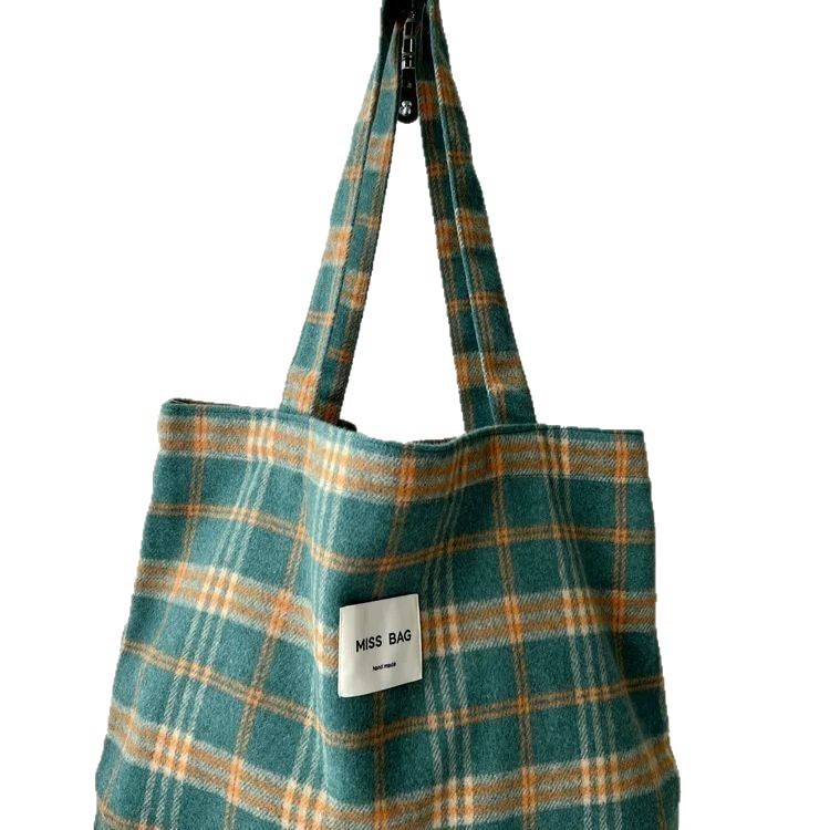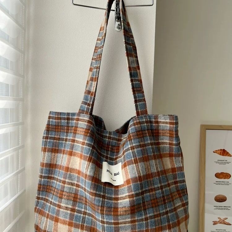大容量帆布包慵懒风秋冬手提包毛呢通勤格子单肩ins托特新款学生