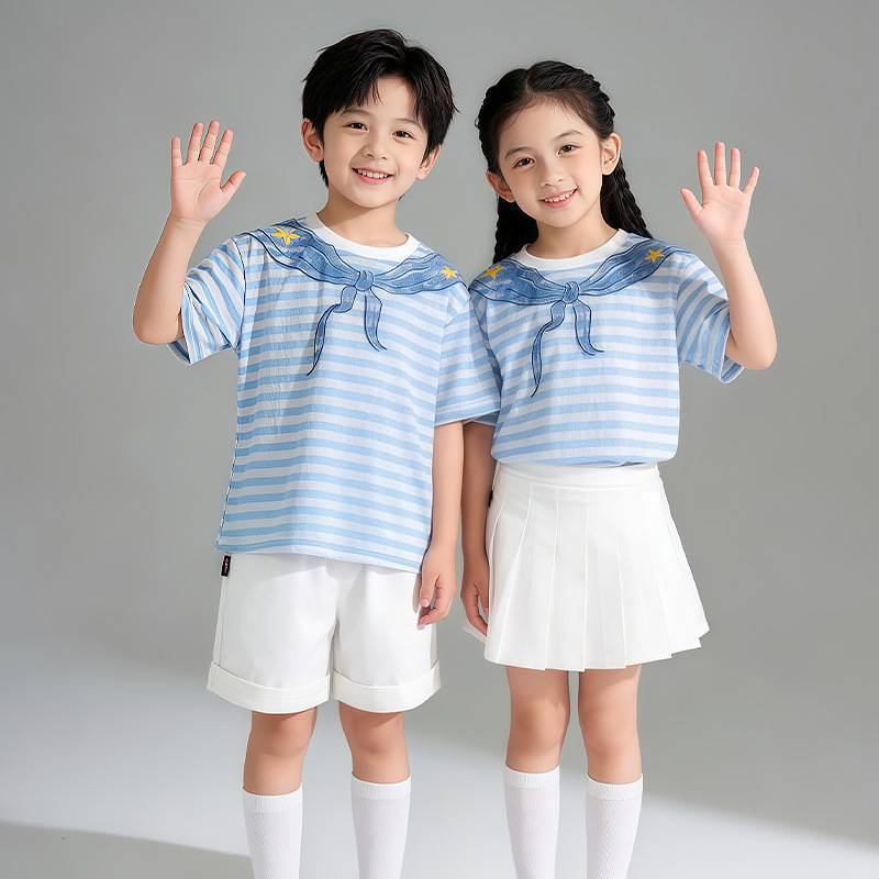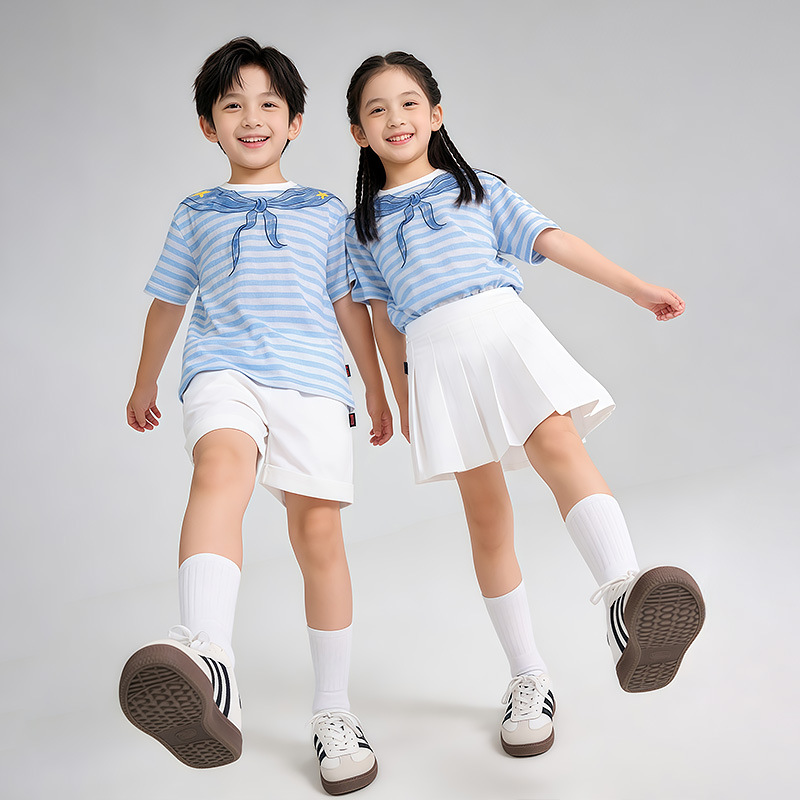 | 颜色 | 条纹配白裙(女款) | 颜色 | 条纹配蓝裤(男款) |