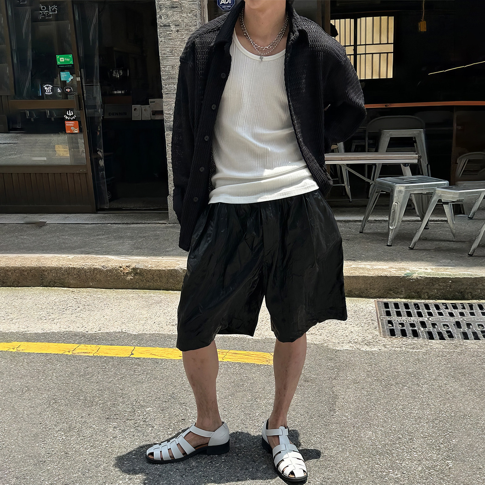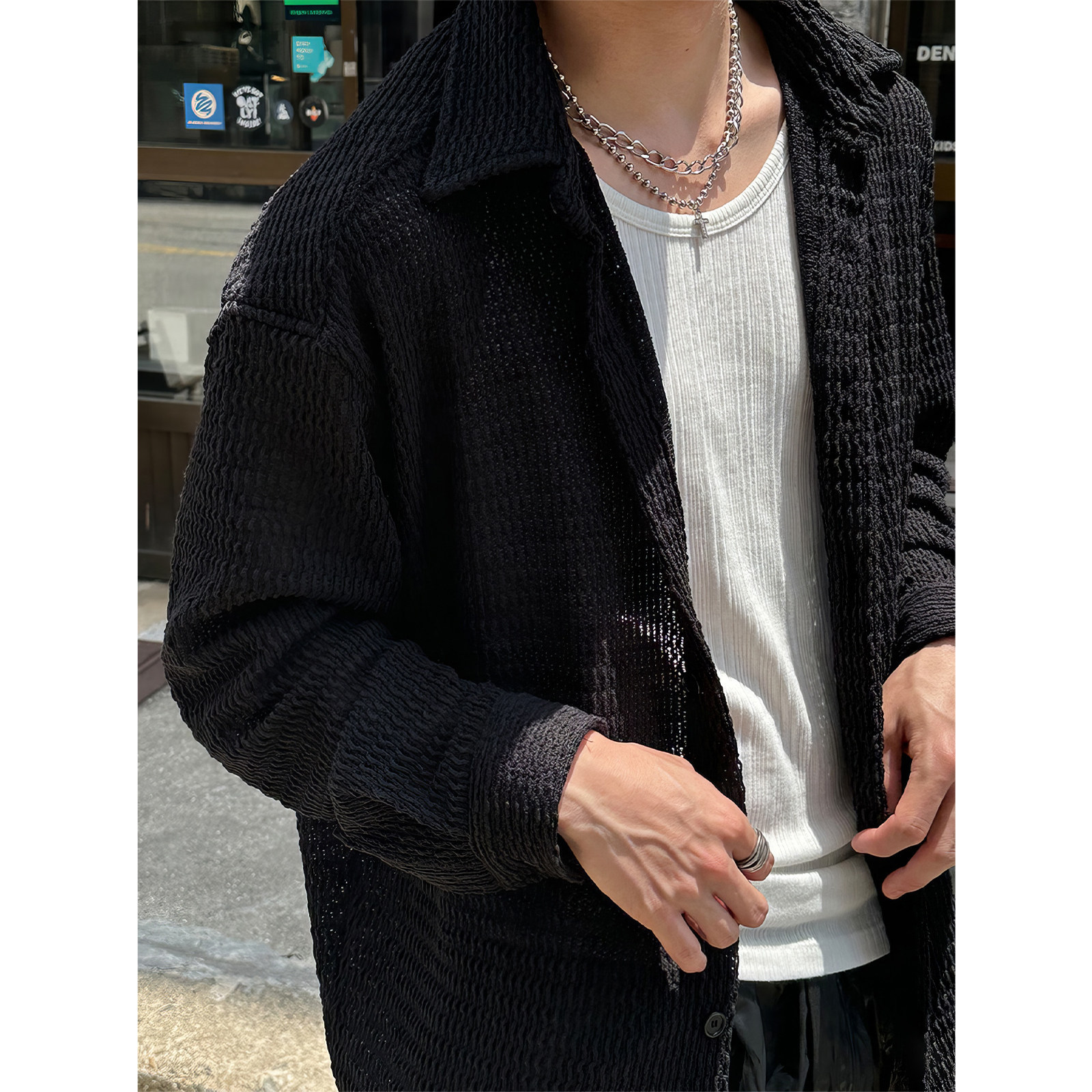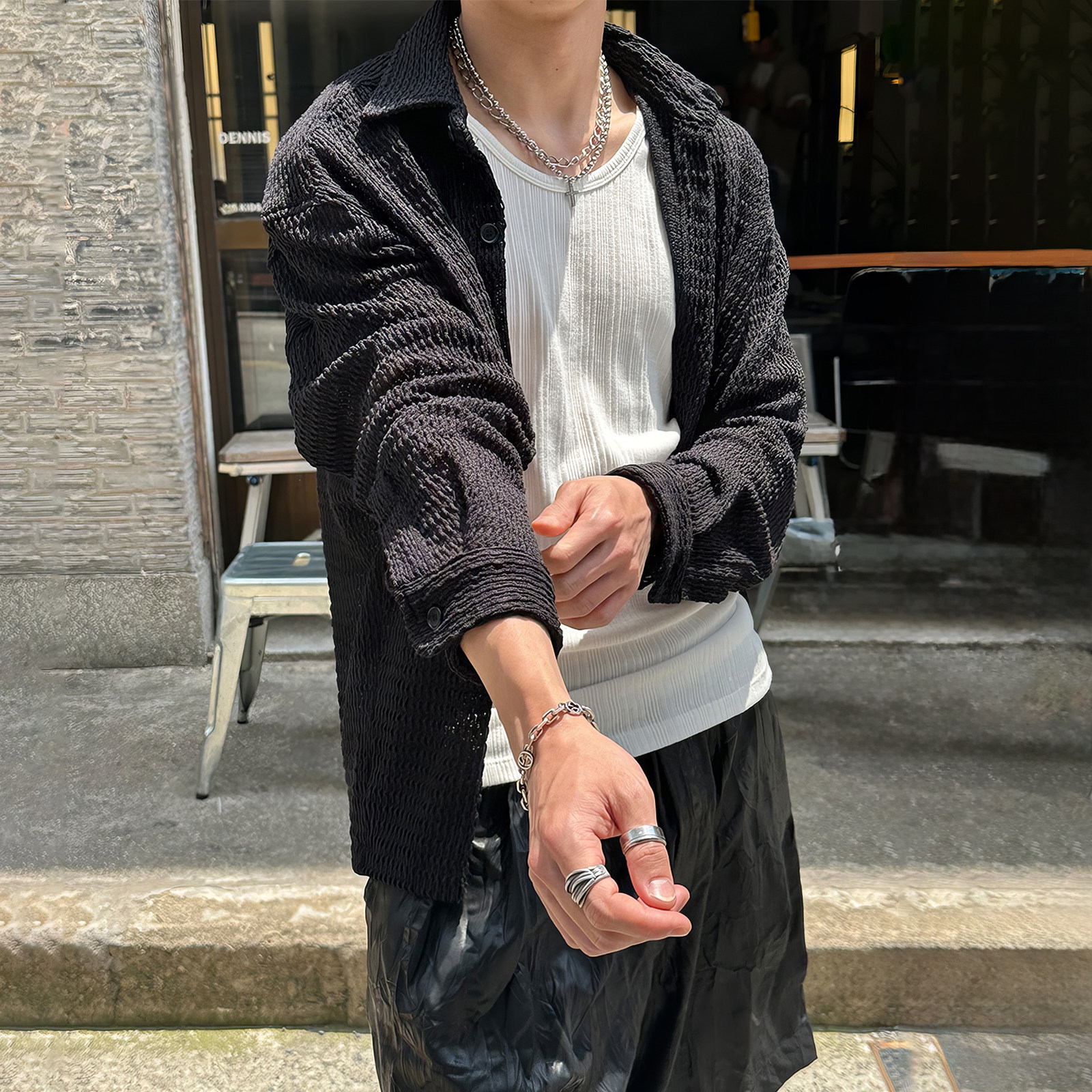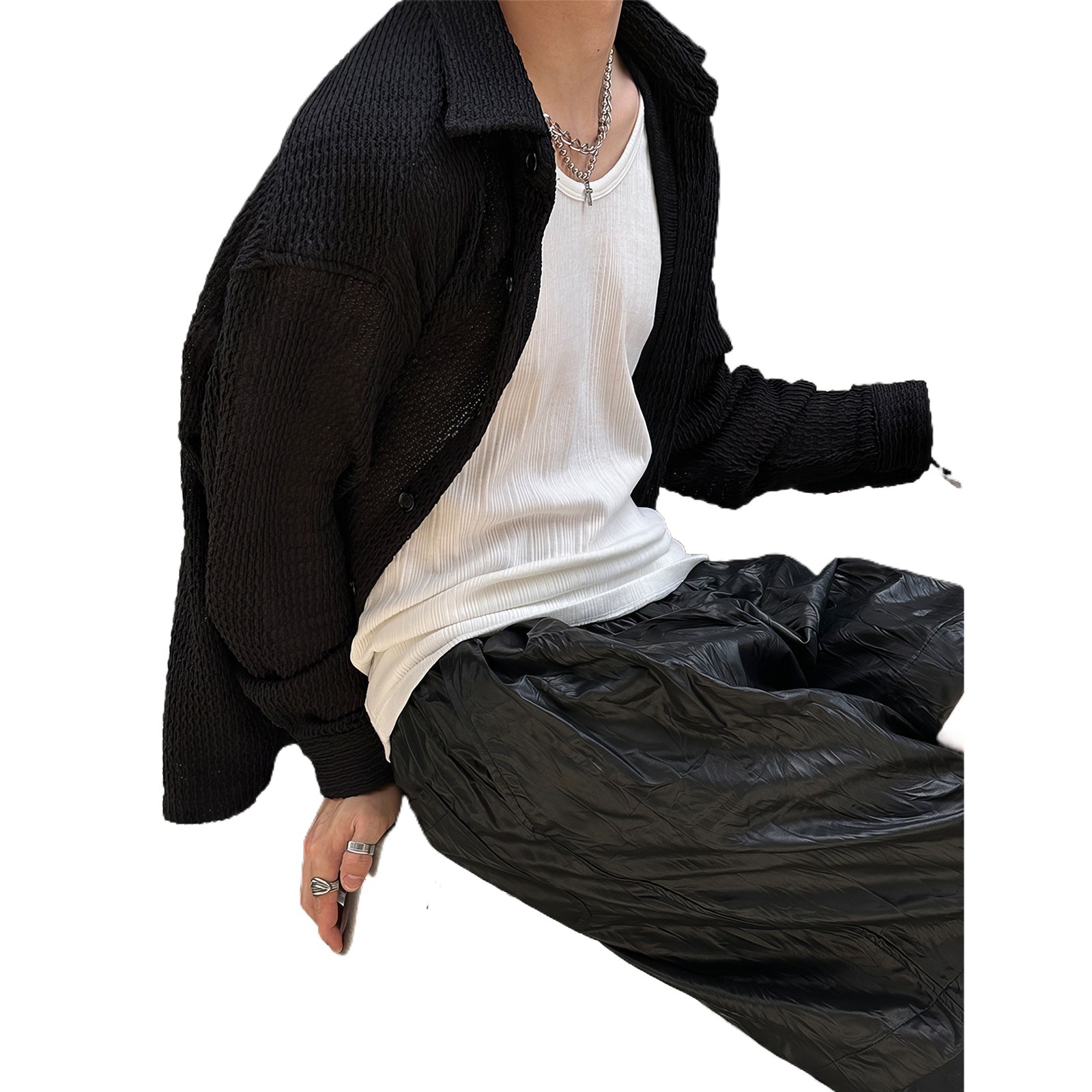 黑色镂空长袖针织衬衫外套男款韩国东大门春季时尚华夫格防晒衬衣