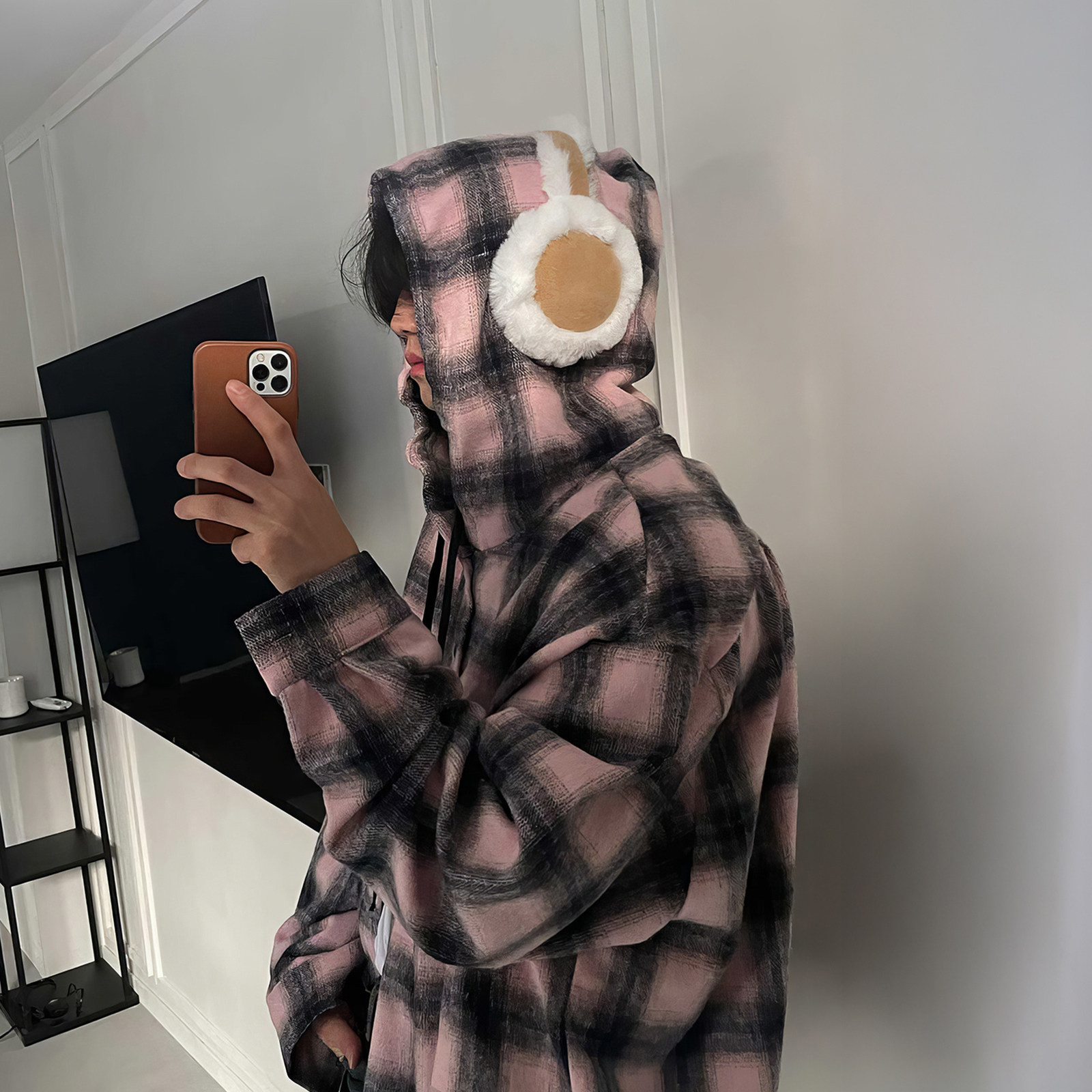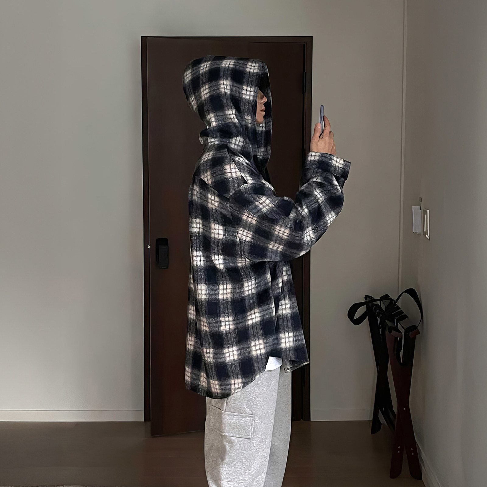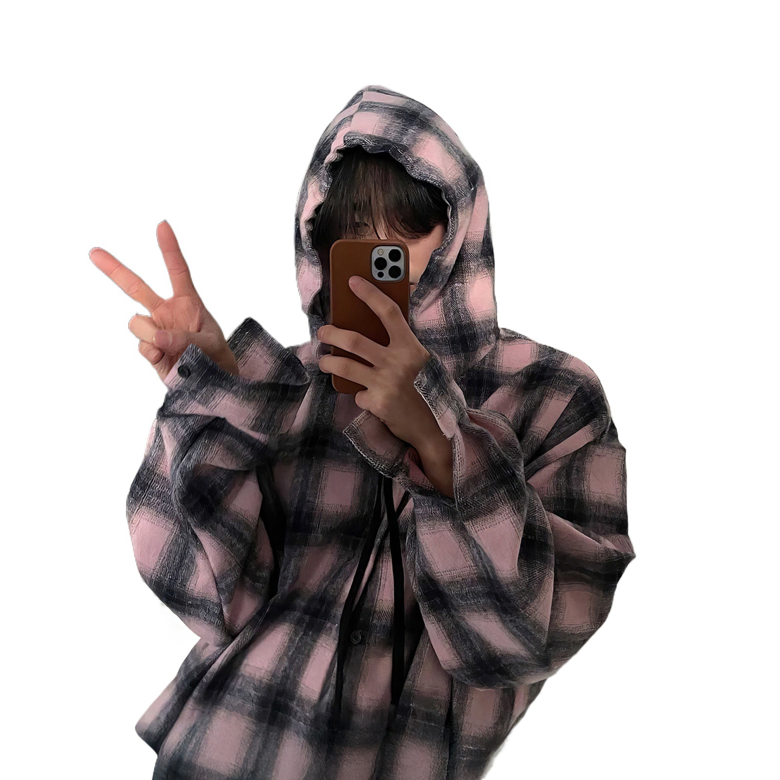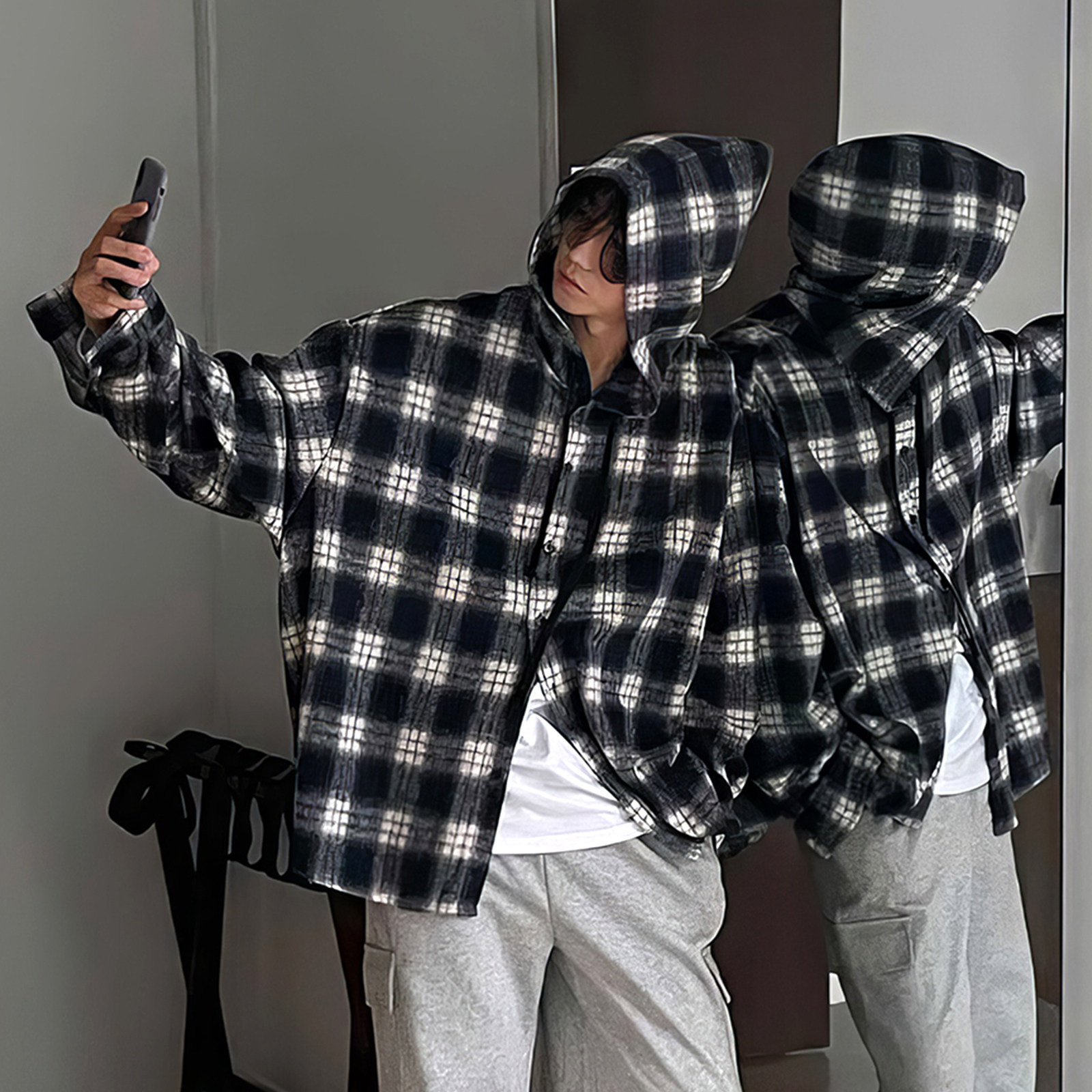 798 Design连帽格子衬衫男春秋磨毛加厚港风休闲宽松长袖衬衣外套