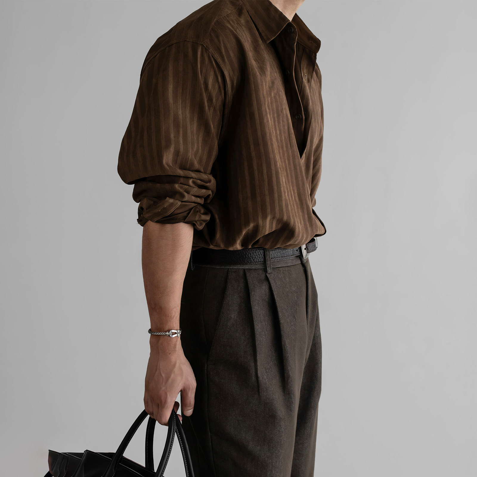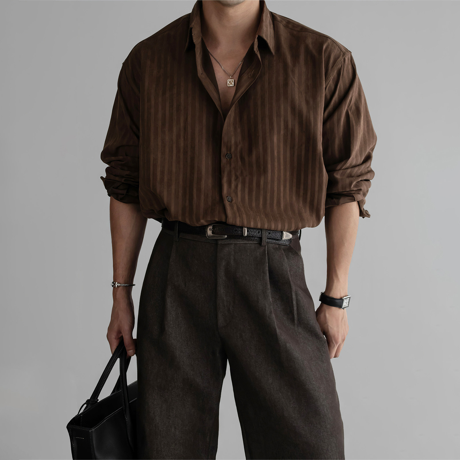 798 Design棕色条纹休闲长袖衬衫男春季复古人夫感穿搭美拉德衬衣