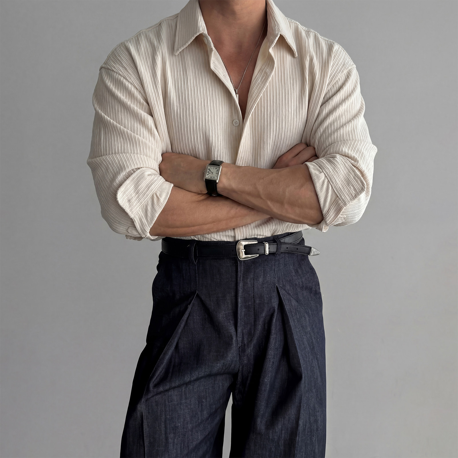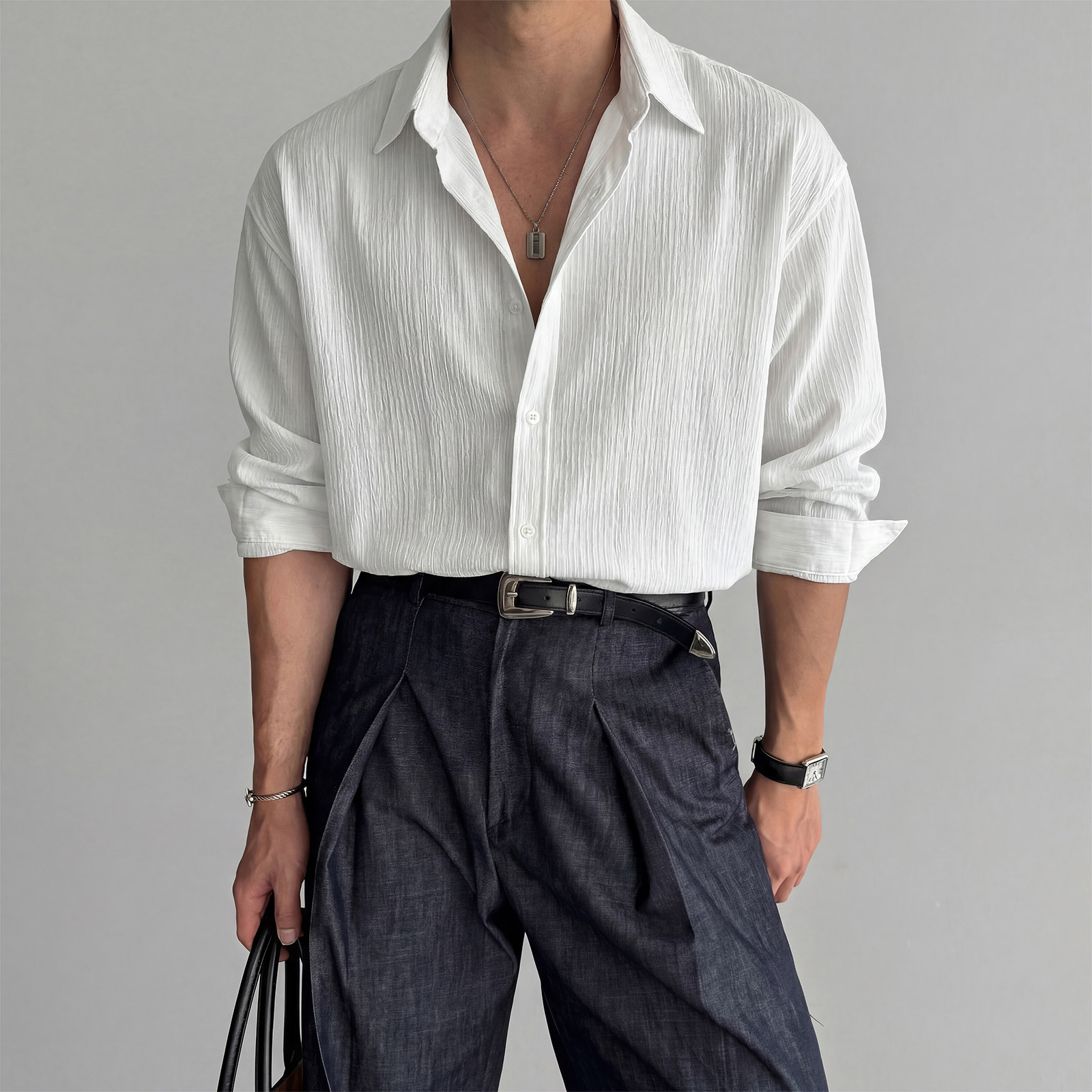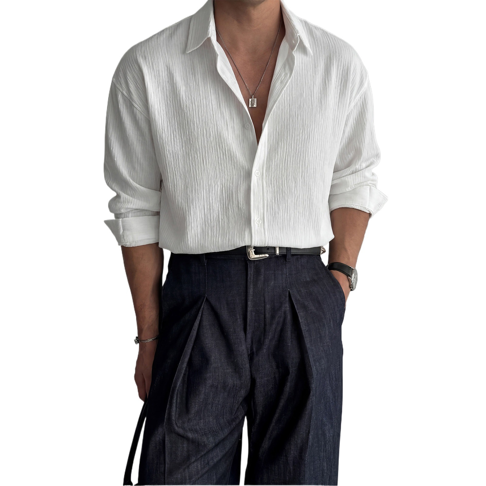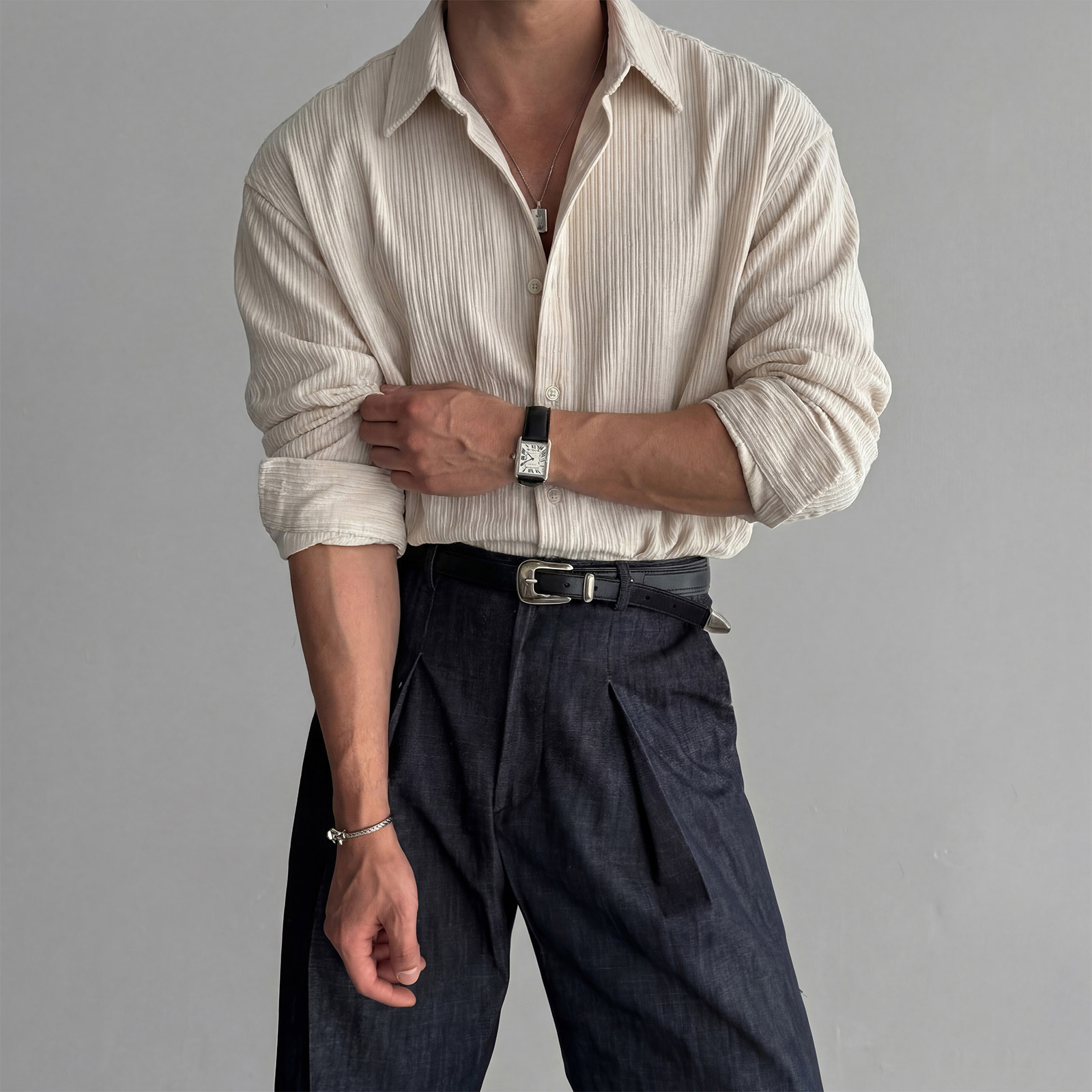 davidme肌理感条纹长袖衬衫男春秋宽松极简设计衬衣度假防晒外套