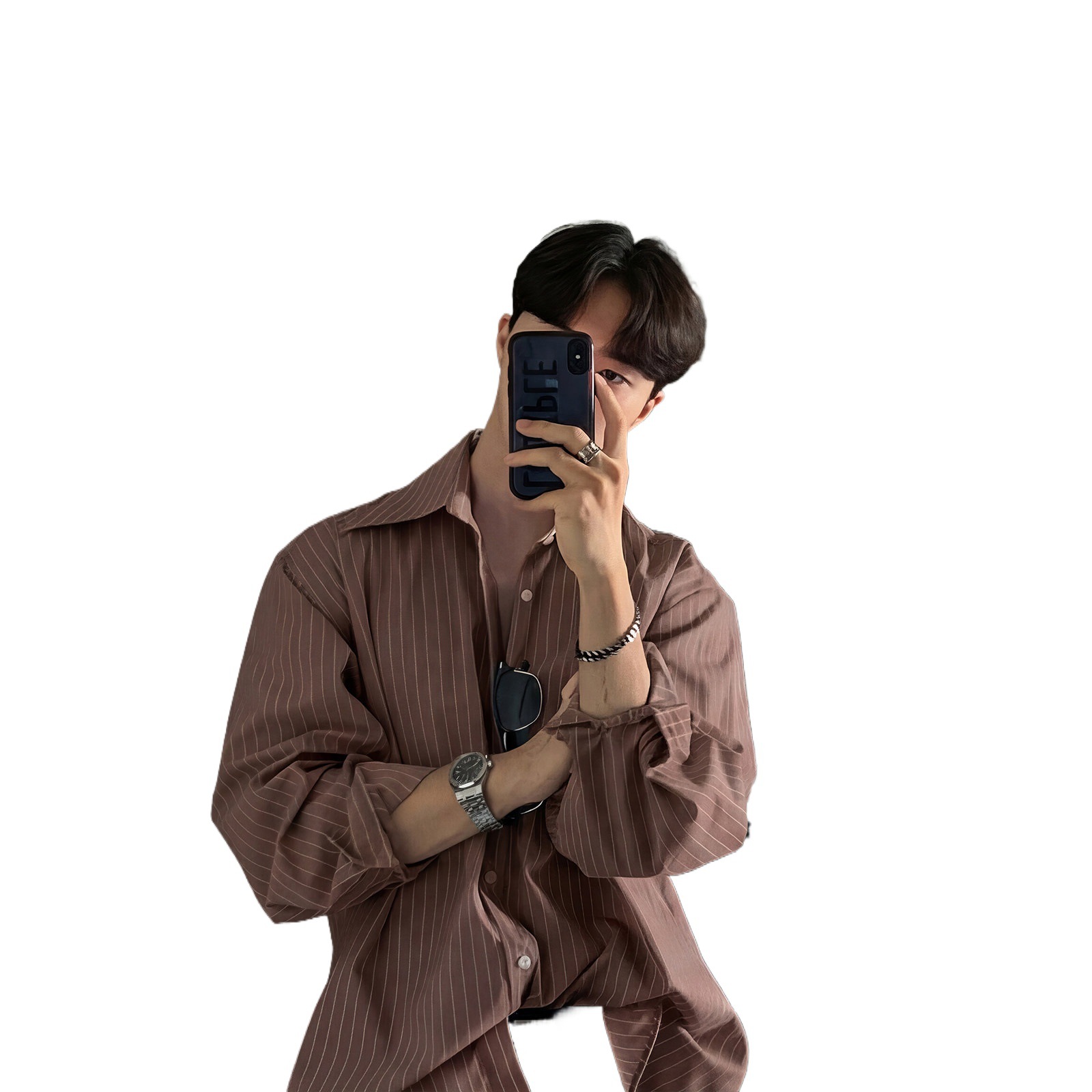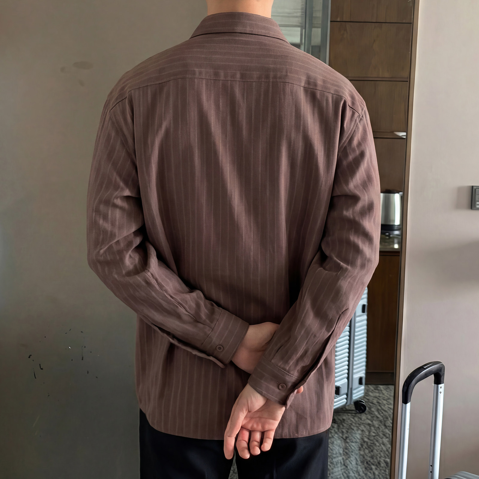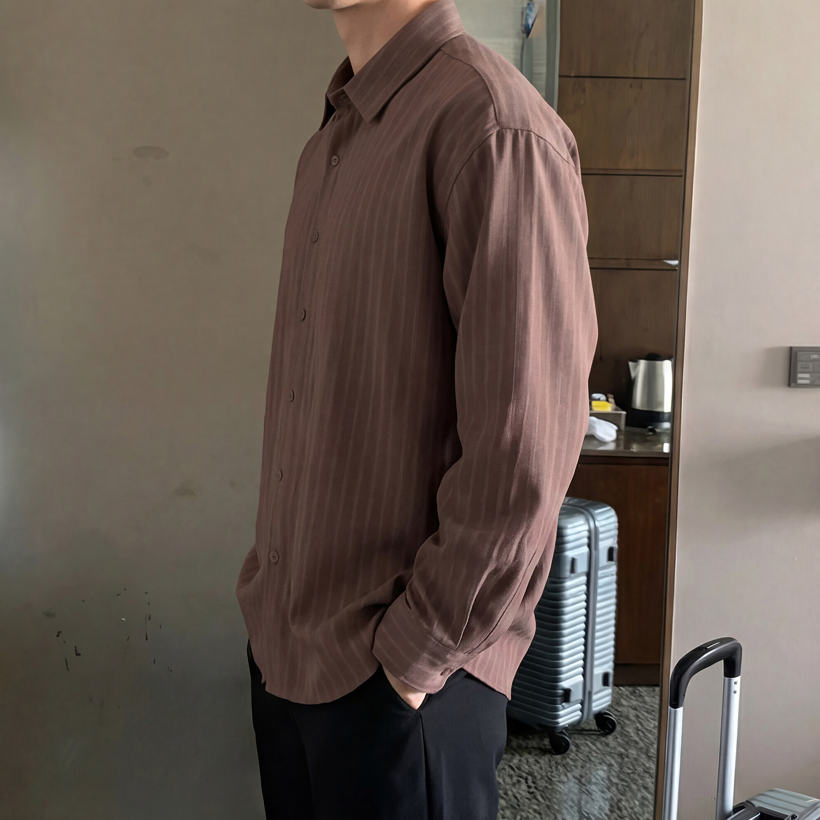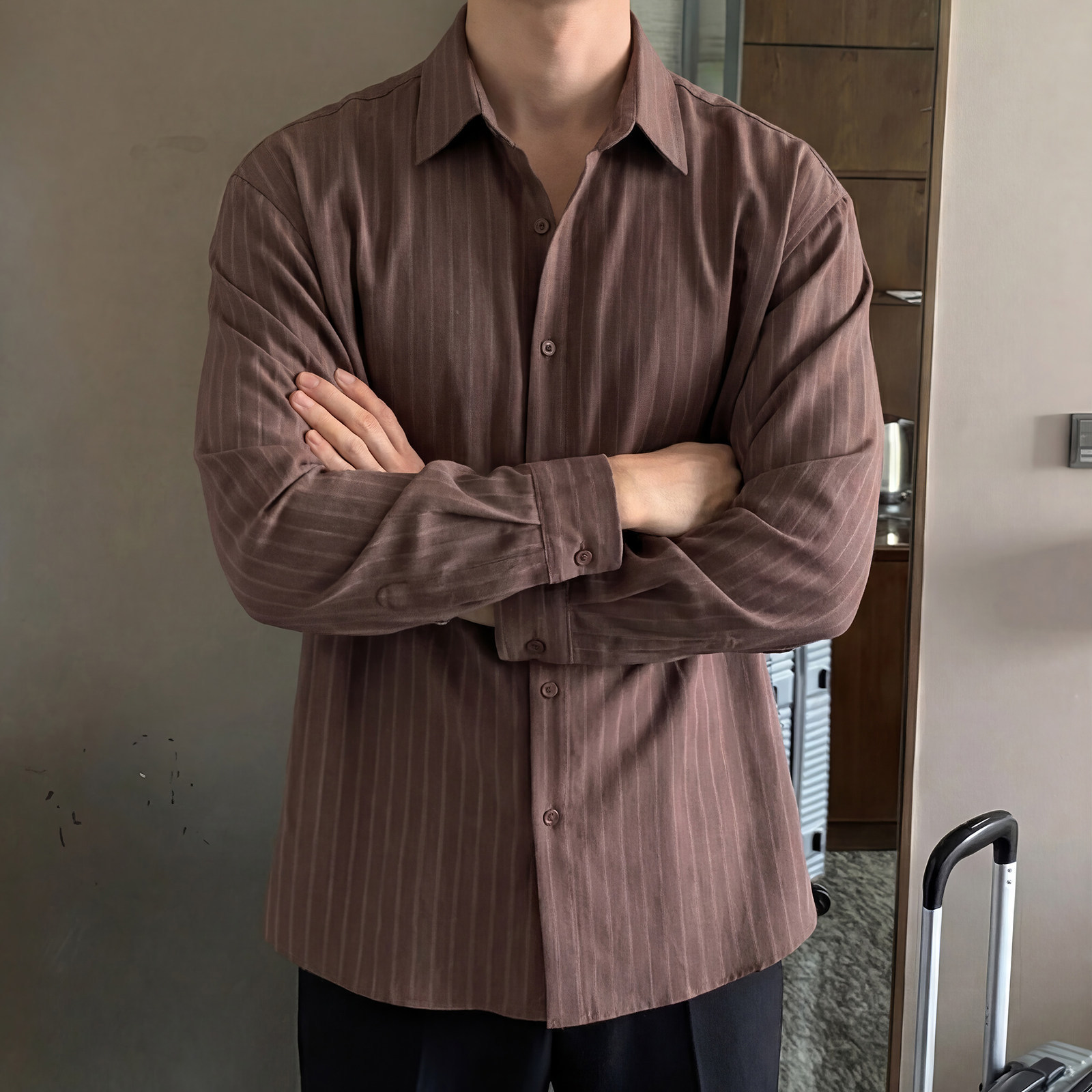 798 Design条纹棕色翻领长袖衬衫男春秋季韩系高智感免烫宽松衬衣