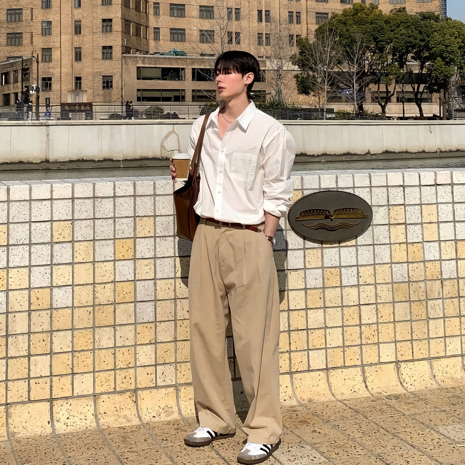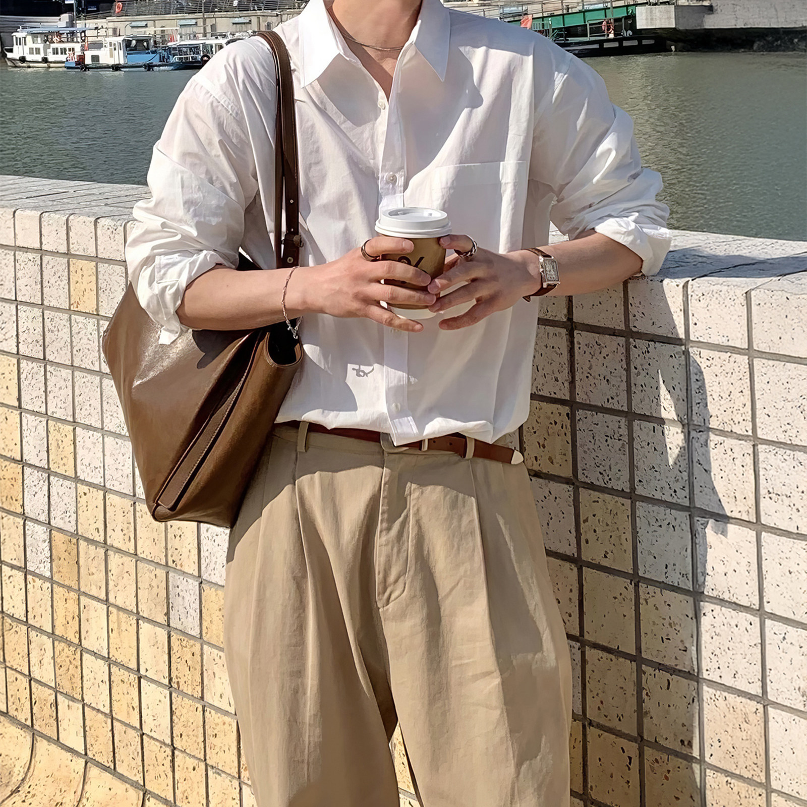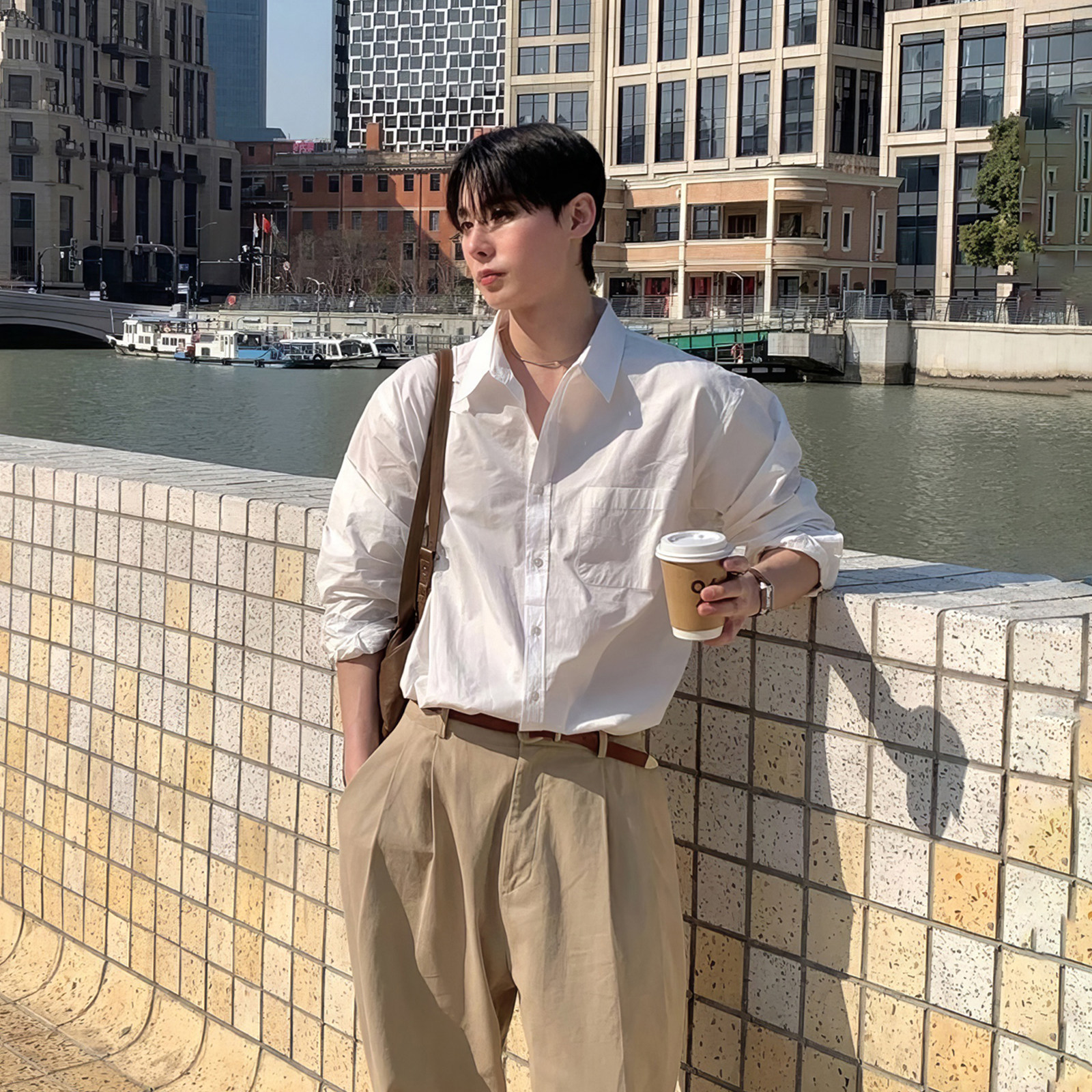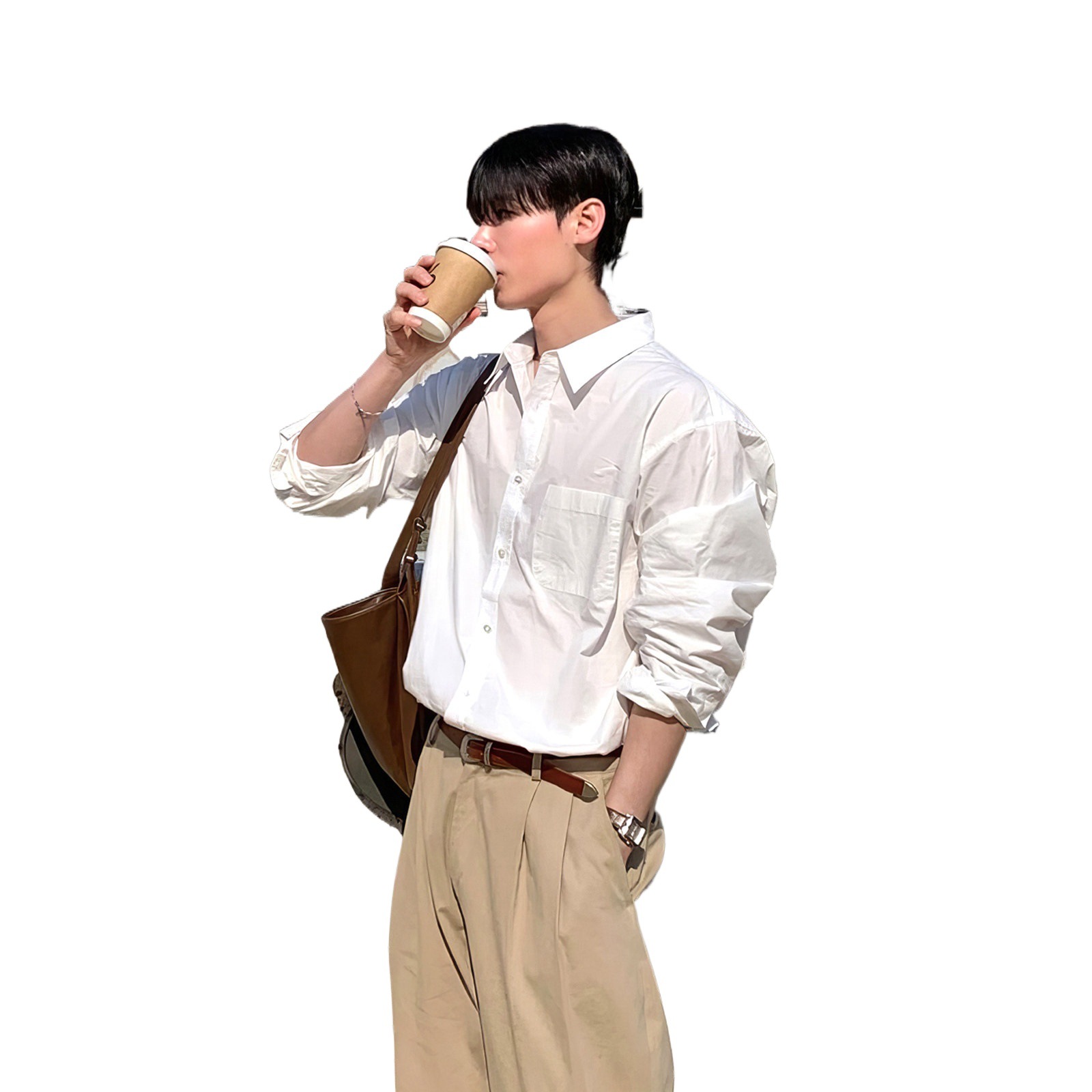davidme白色简约氛围感长袖翻领衬衫男春秋宽松休闲免烫垂感衬衣