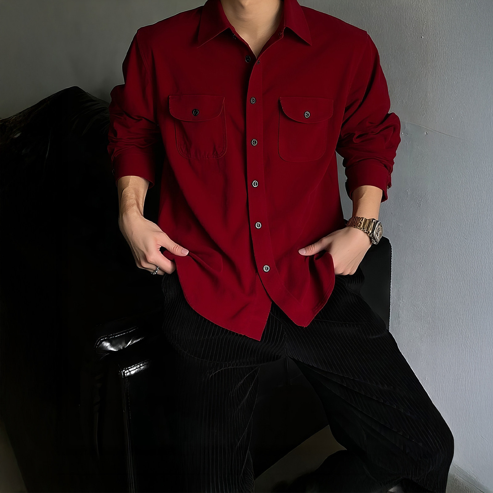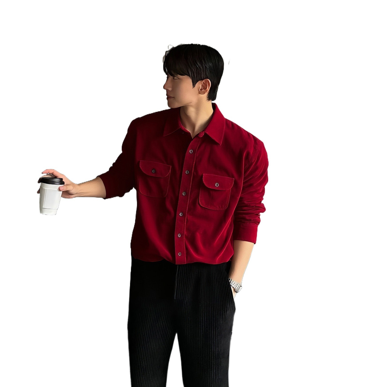 davidme新年安可拉红色灯芯绒长袖衬衫男冬季高级感重工衬衣外套