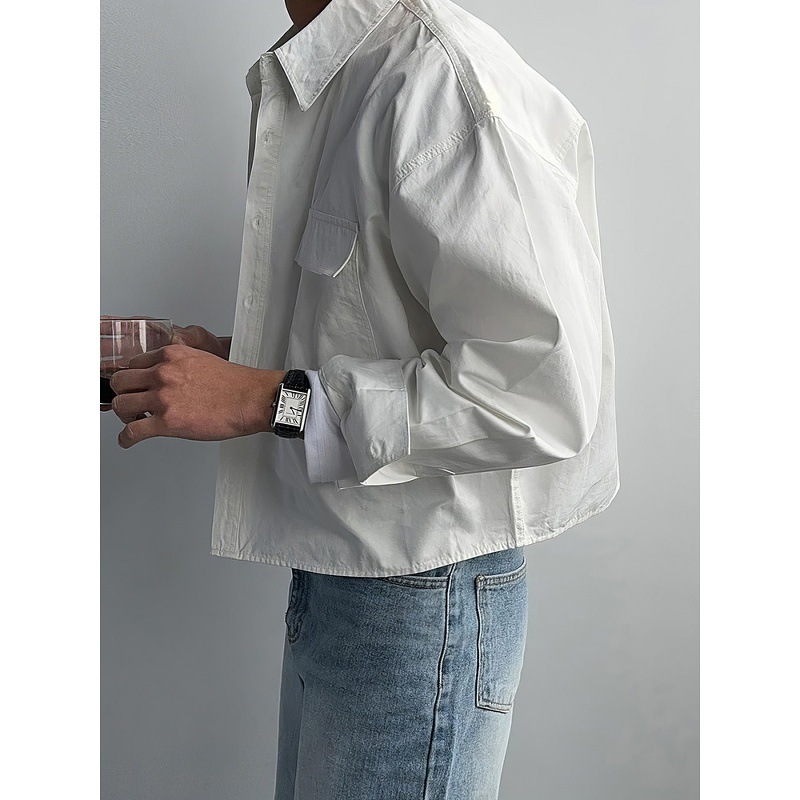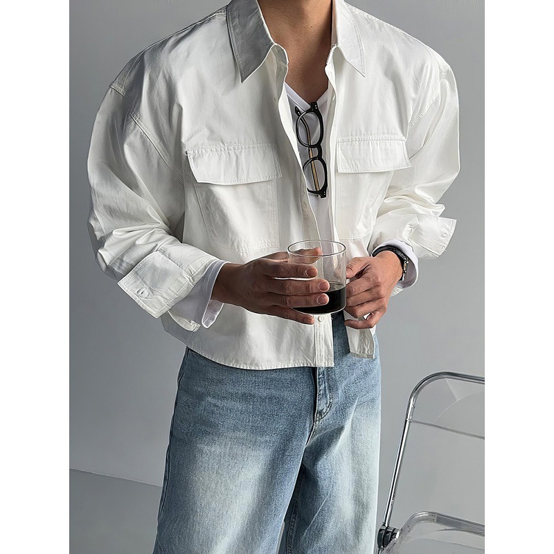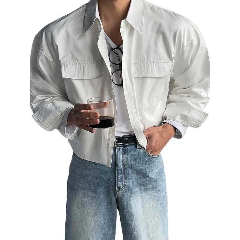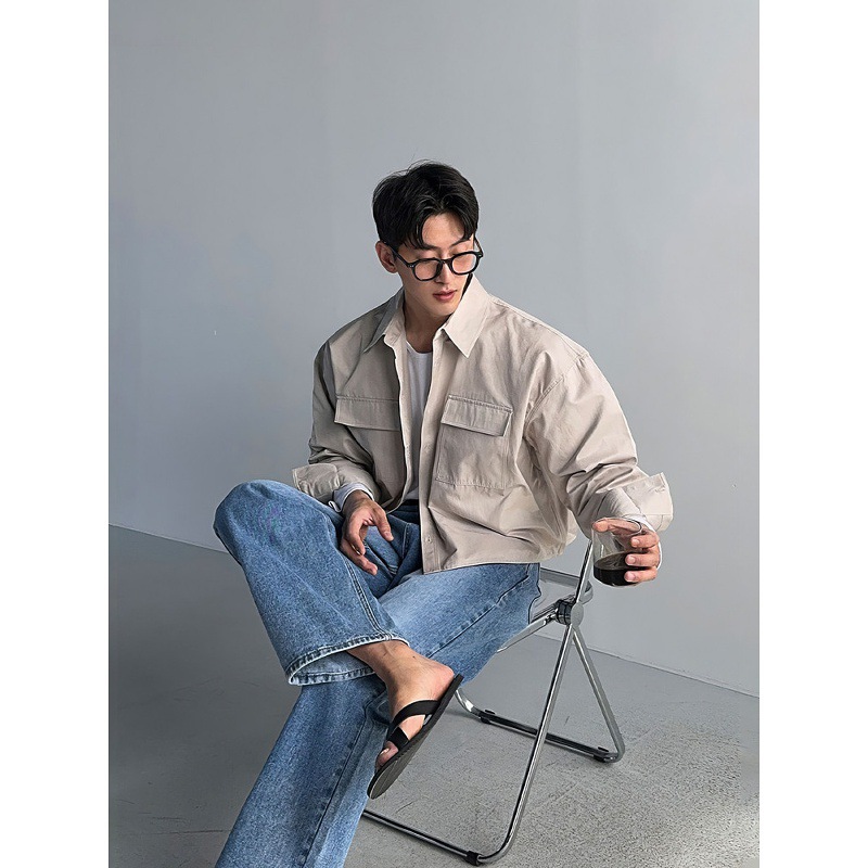 浅卡其色短款长袖衬衫外套男士春秋老钱风重工通勤多口袋衬衣夹克