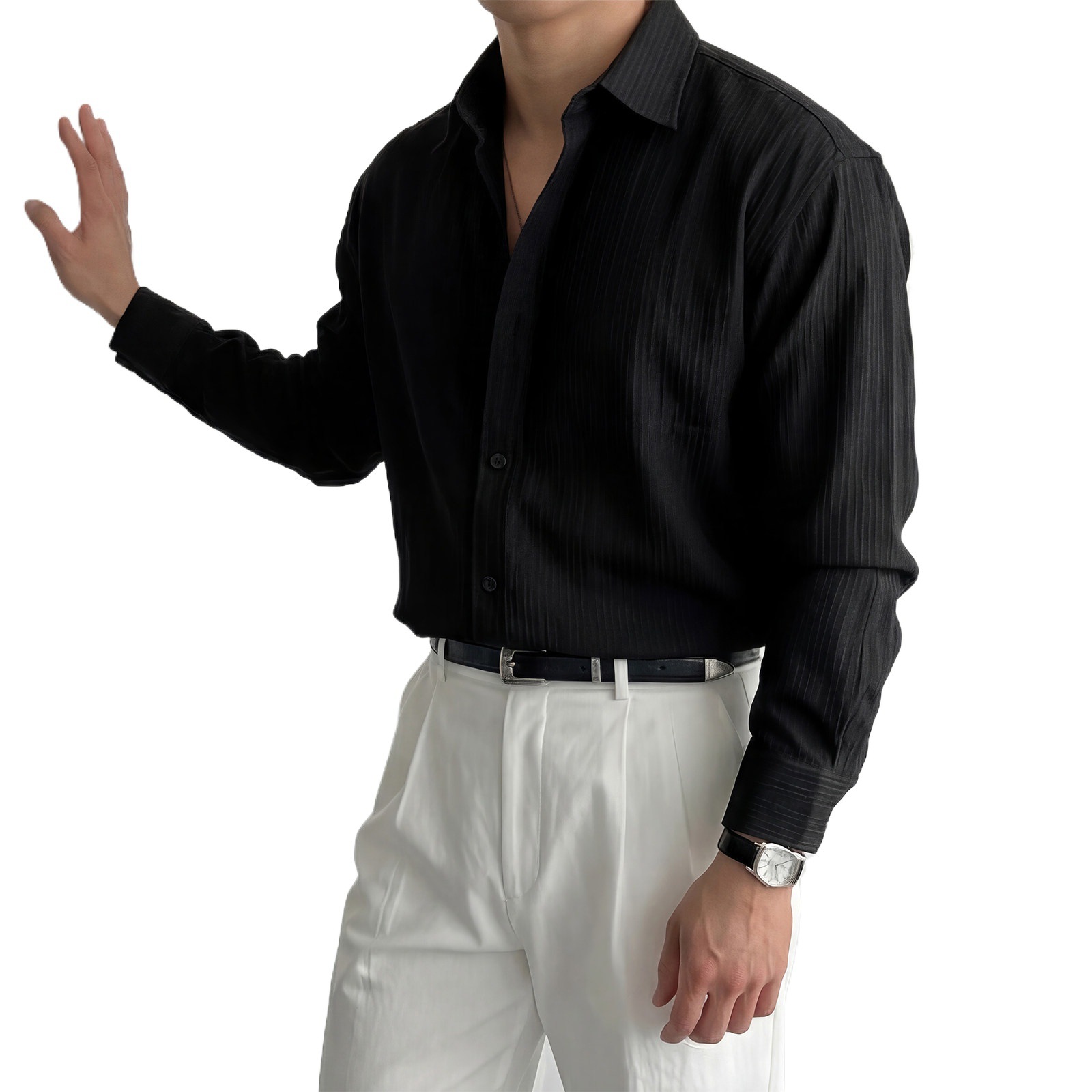 798 Design黑色条纹长袖衬衫男士轻熟风翻领宽松商务免烫衬衣外套