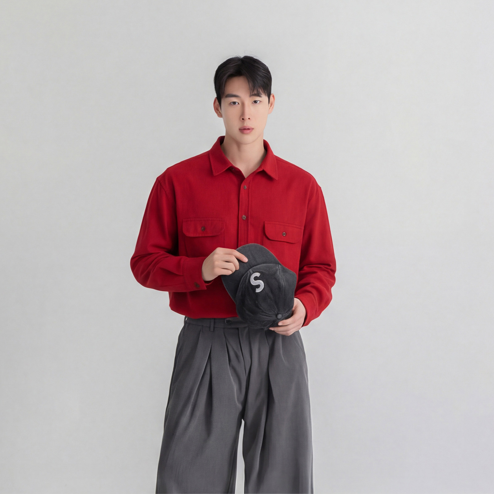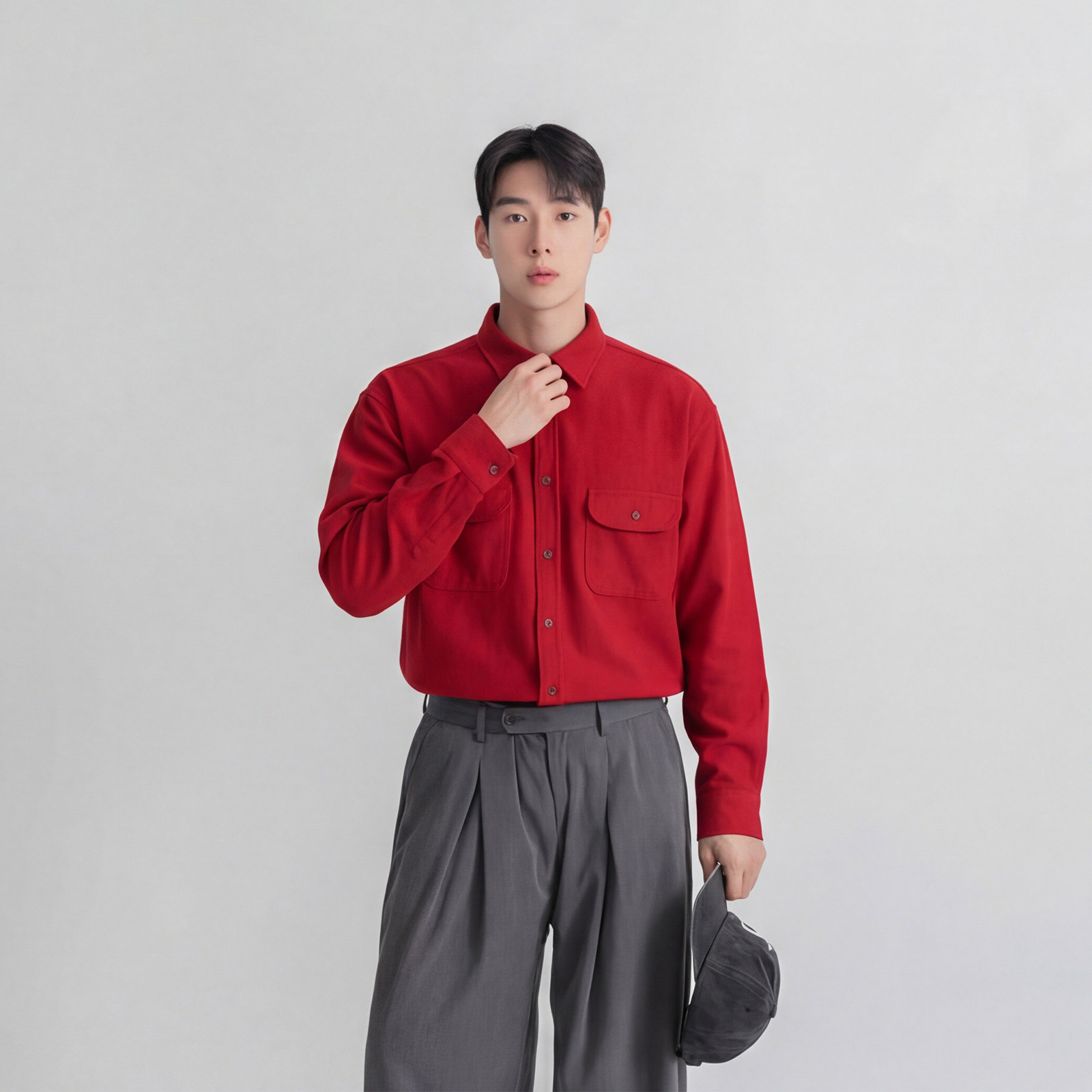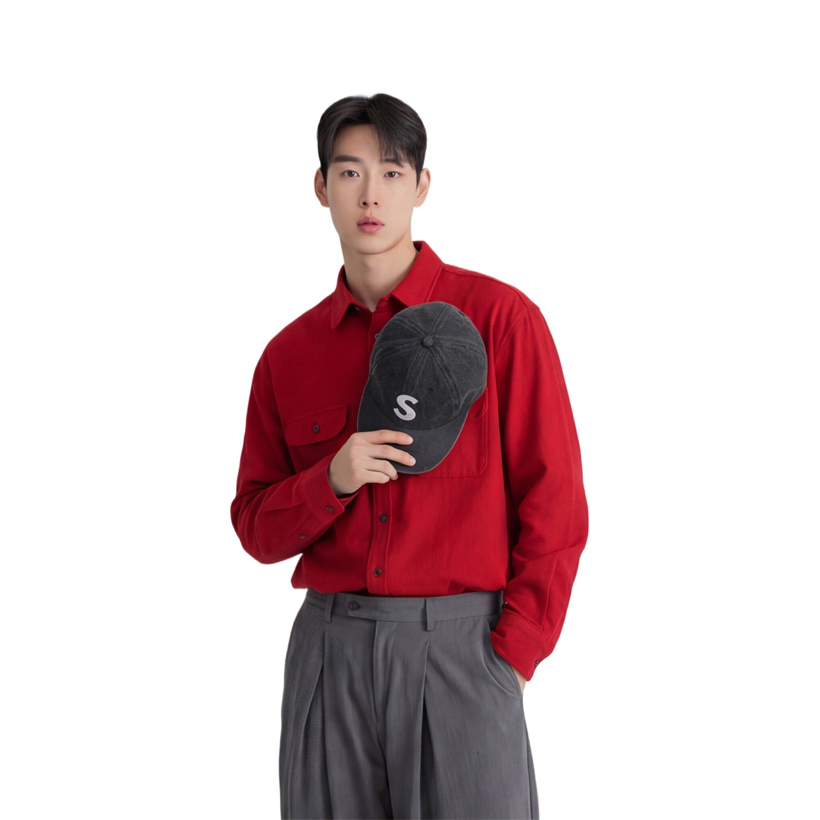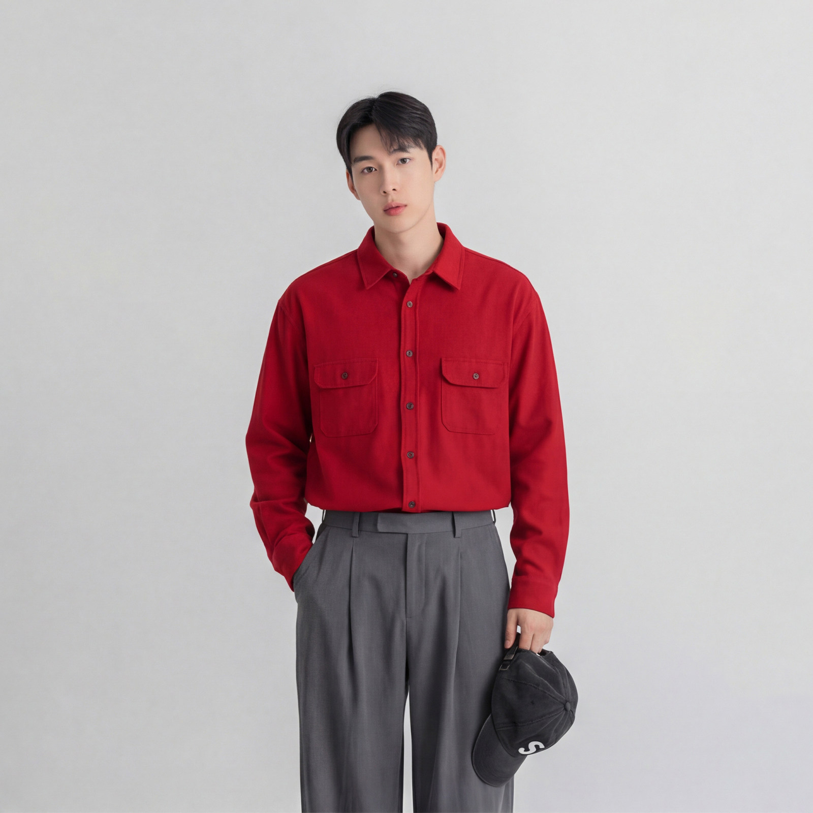798 Design本命年大红色长袖翻领灯芯绒衬衫男款新年喜庆内搭衬衣