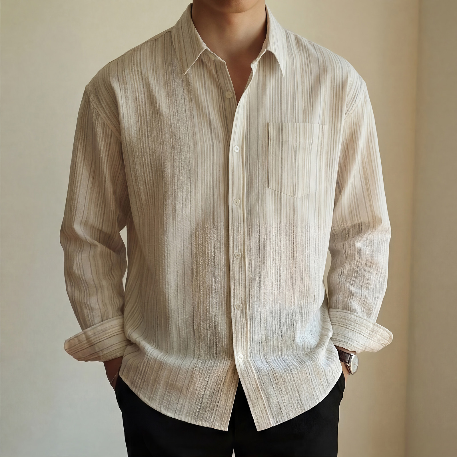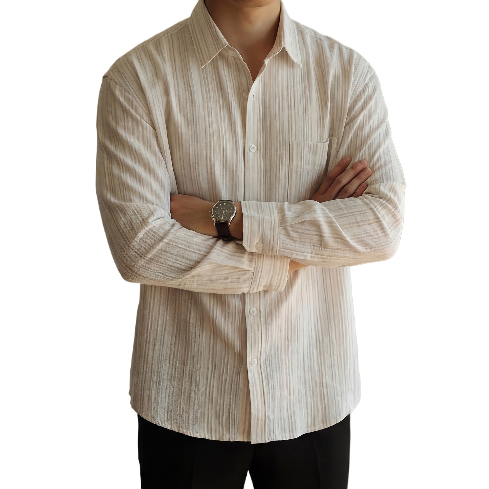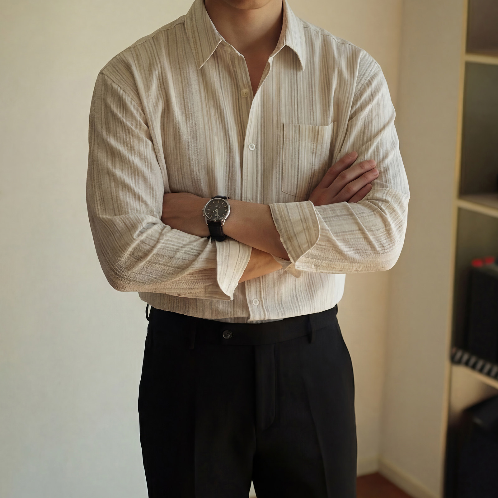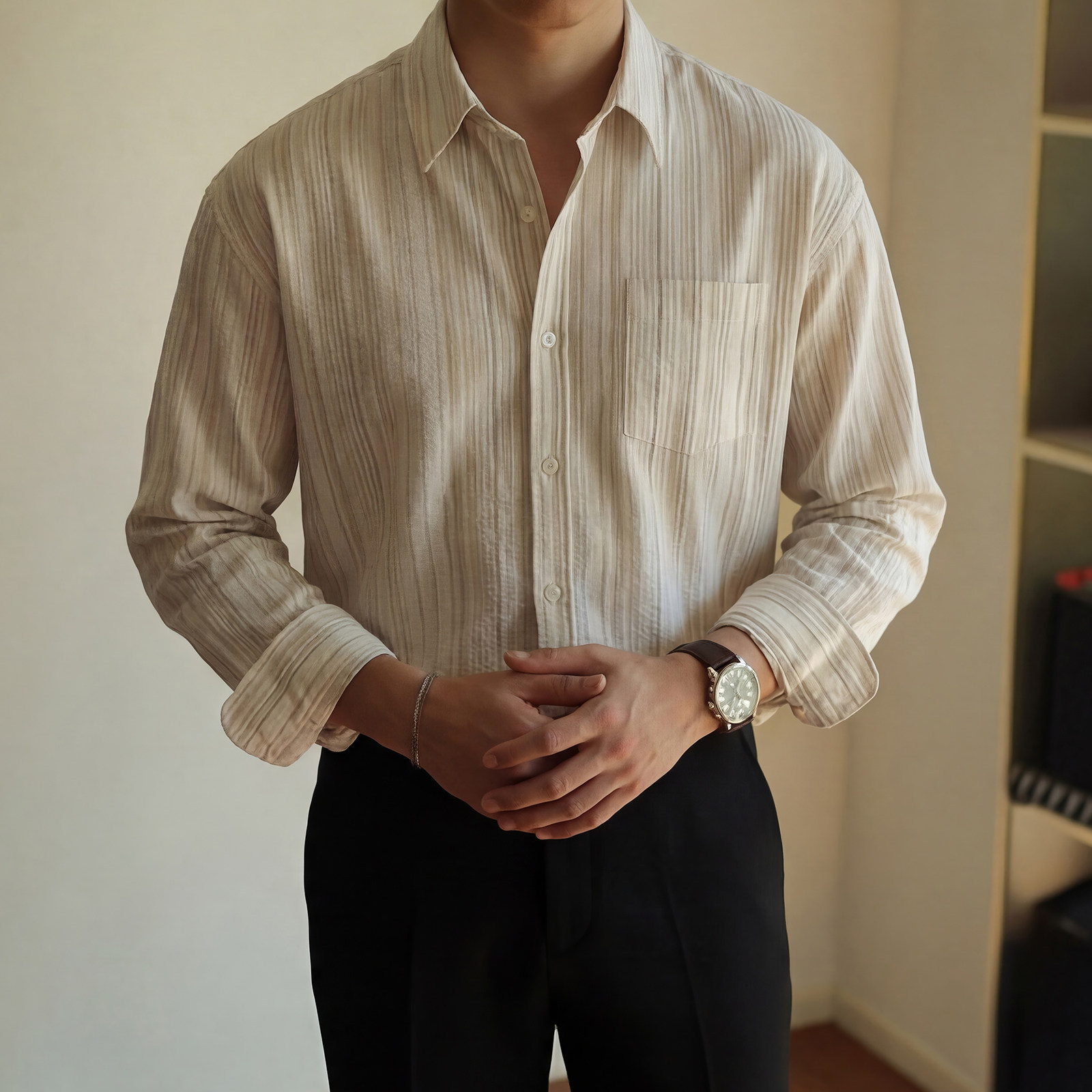 798 Design美式轻奢高级感杏色条纹长袖衬衫男老钱风商务免烫衬衣