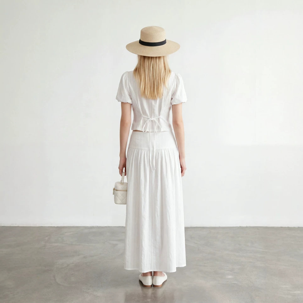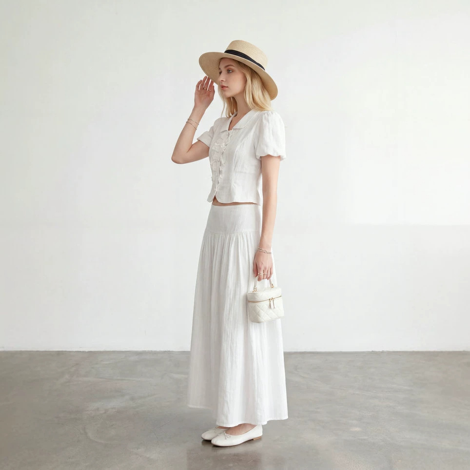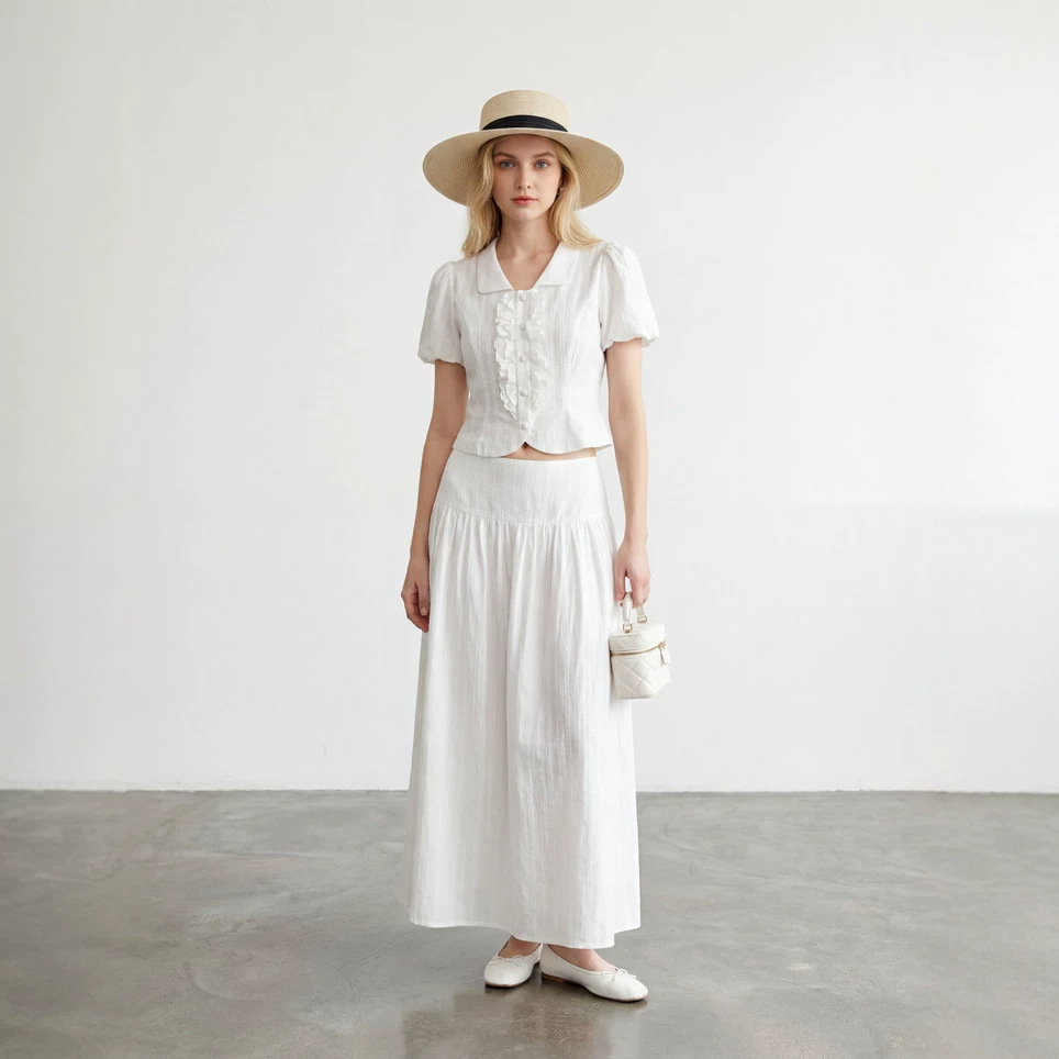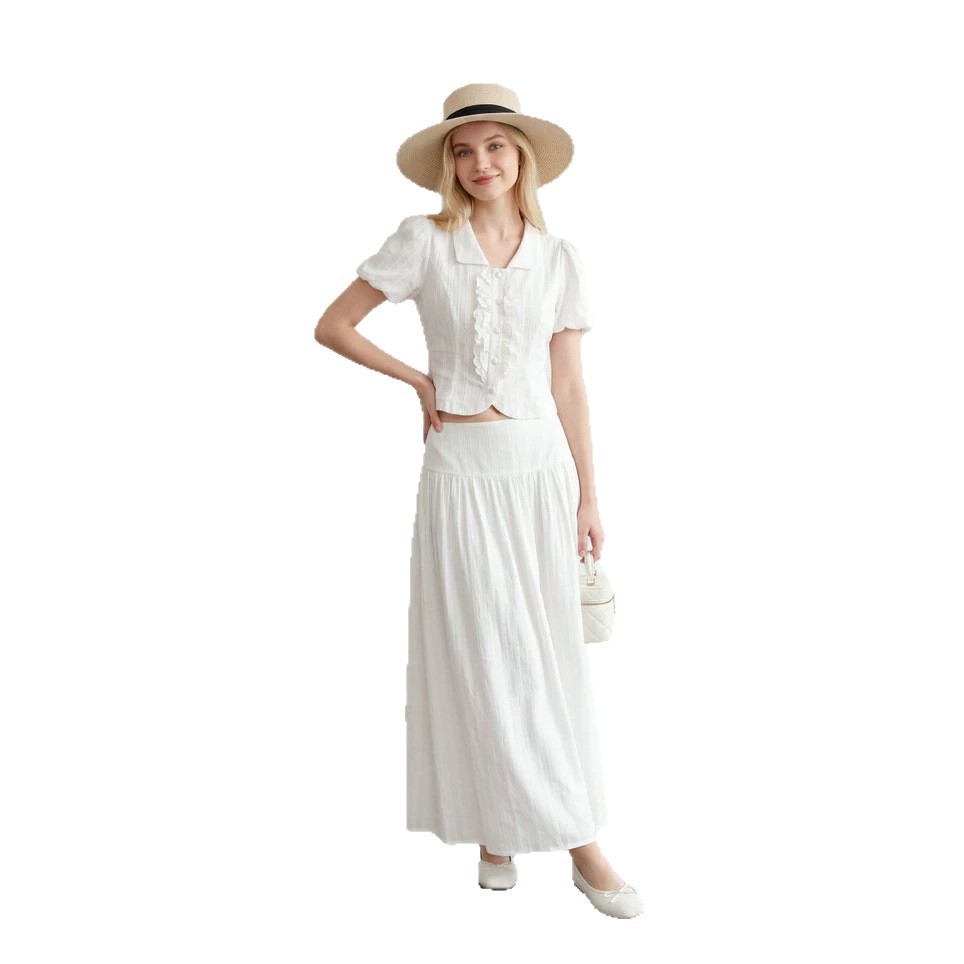 2026新款100棉法式泡泡袖荷叶边短袖白色衬衫女上衣和长裙两件套