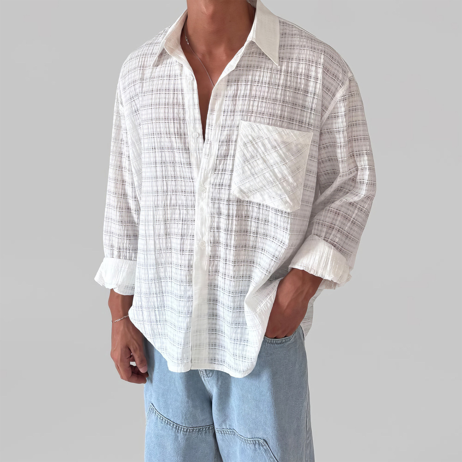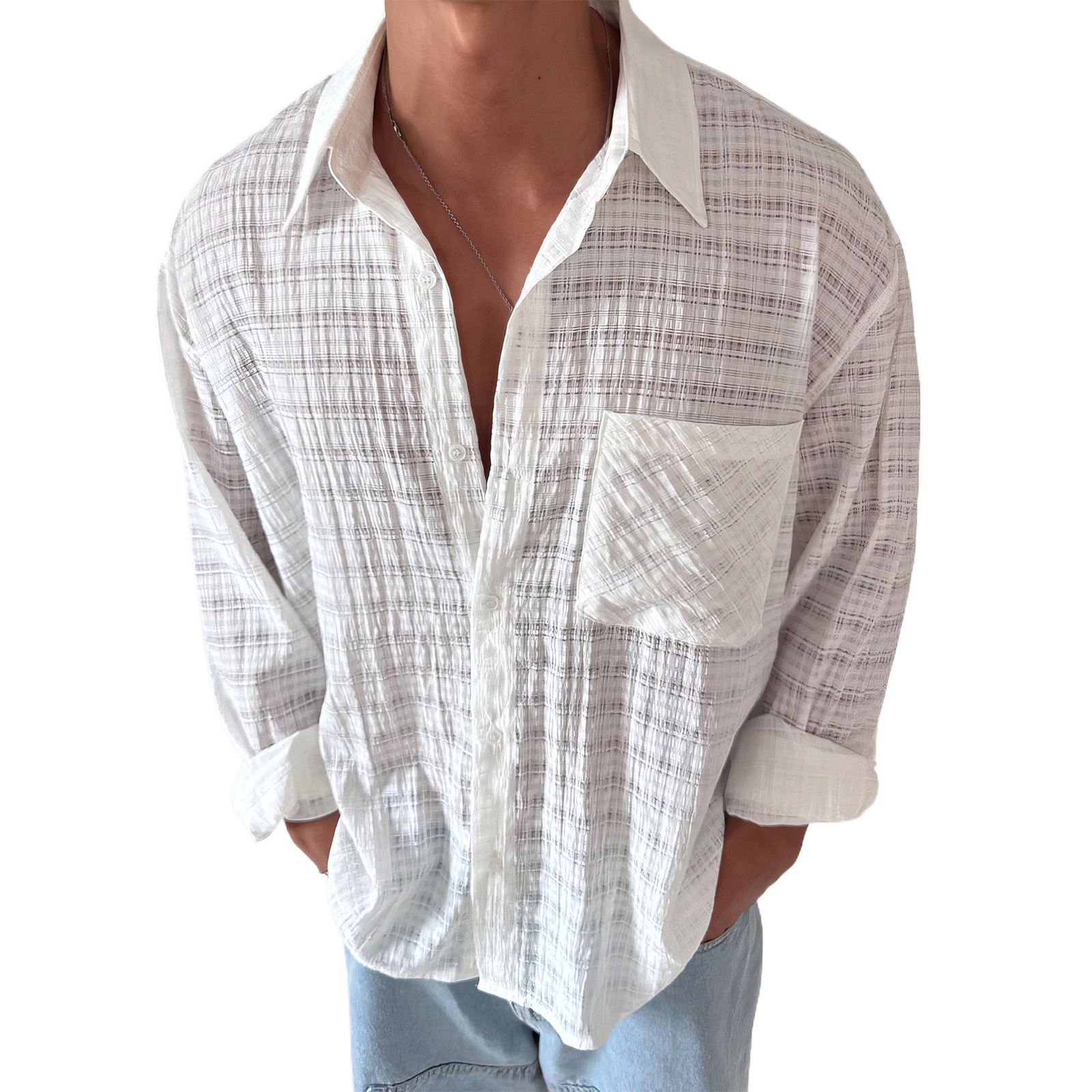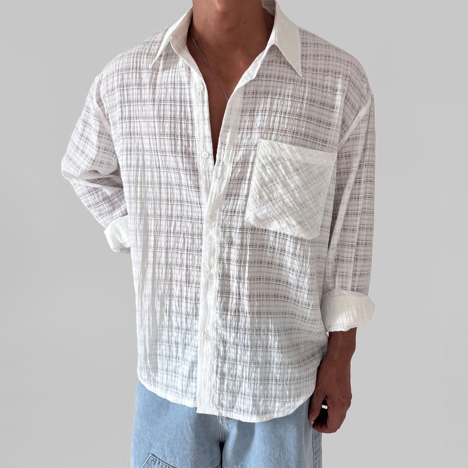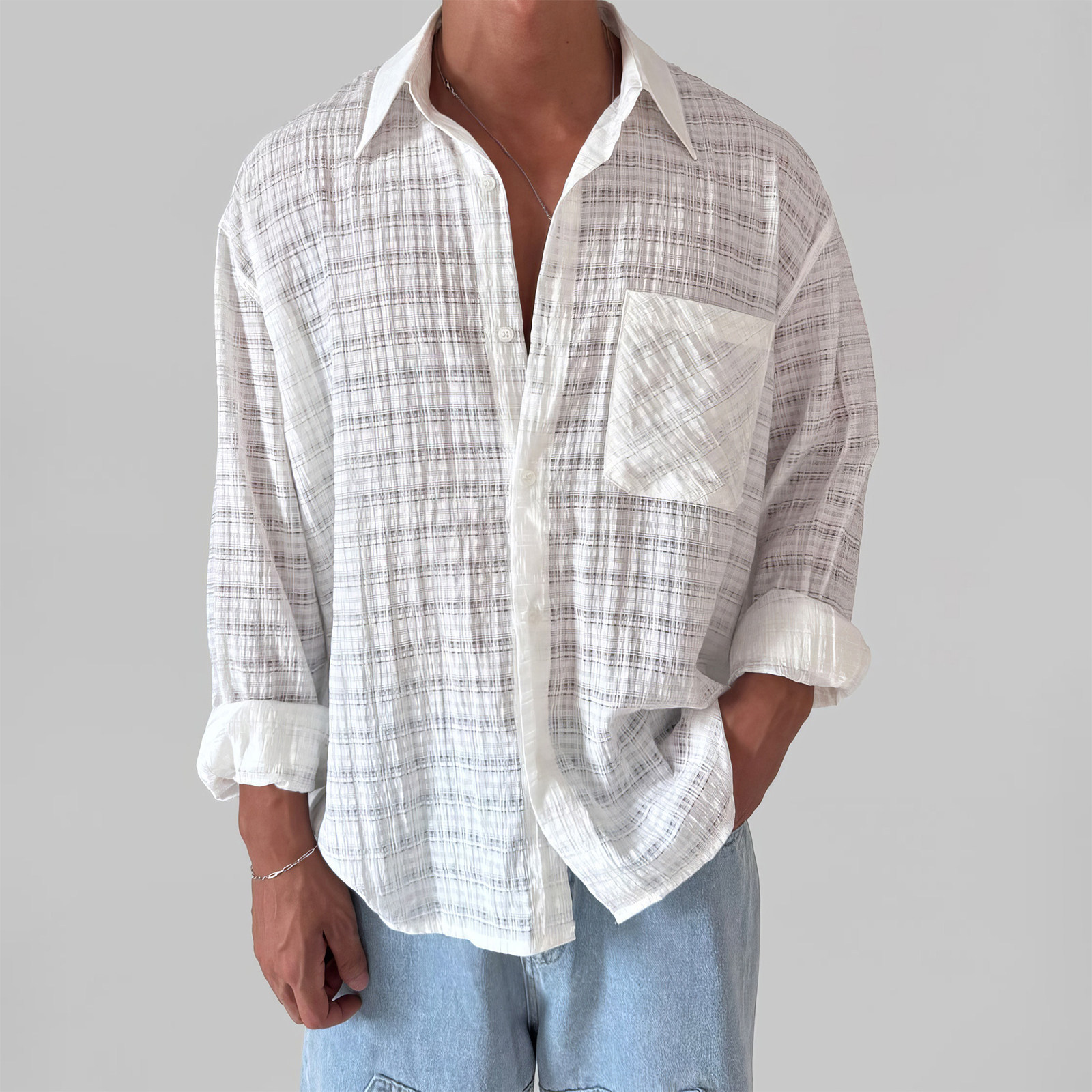 davidme白色格纹缕空长袖防晒衬衫男夏季度假慵懒松弛感薄款外套