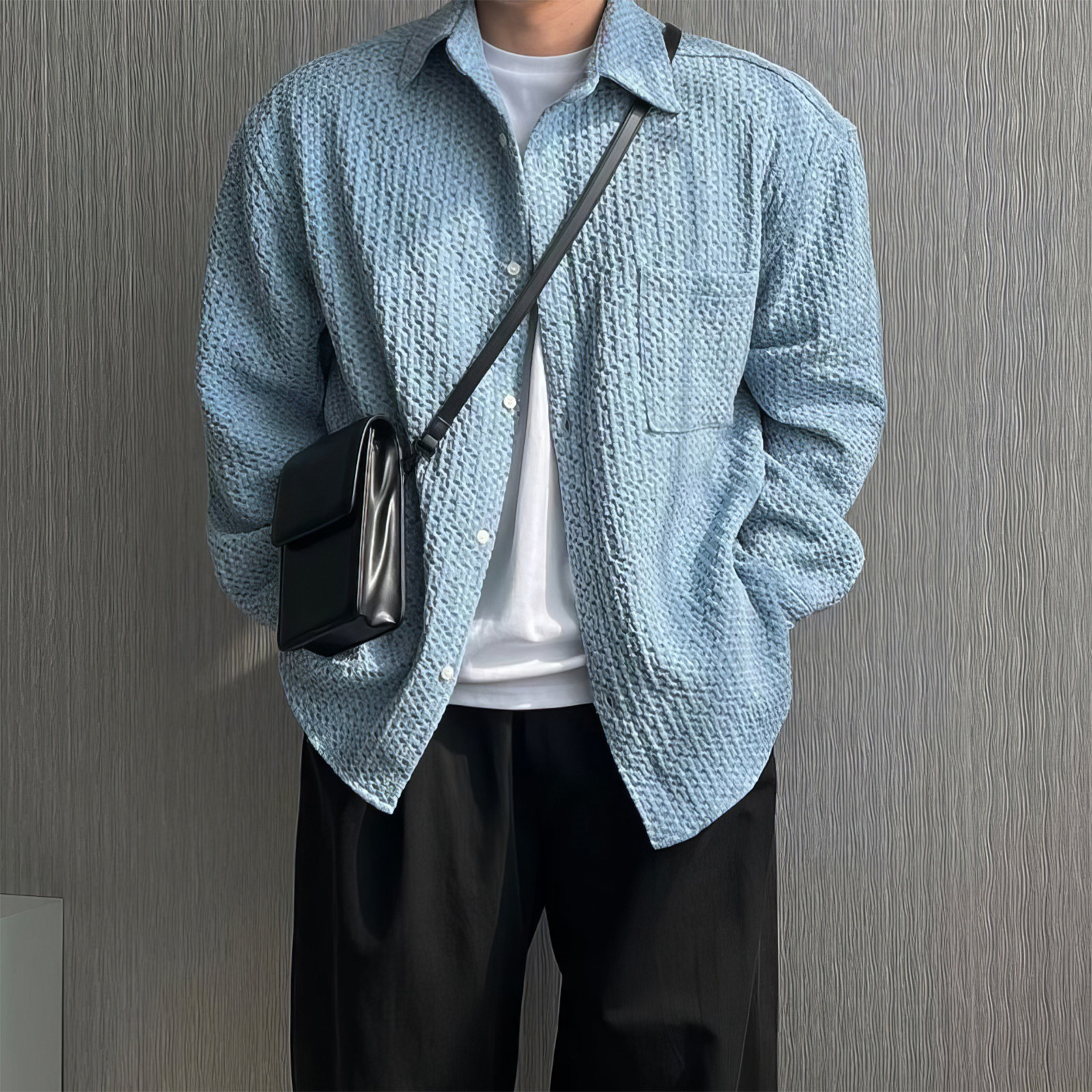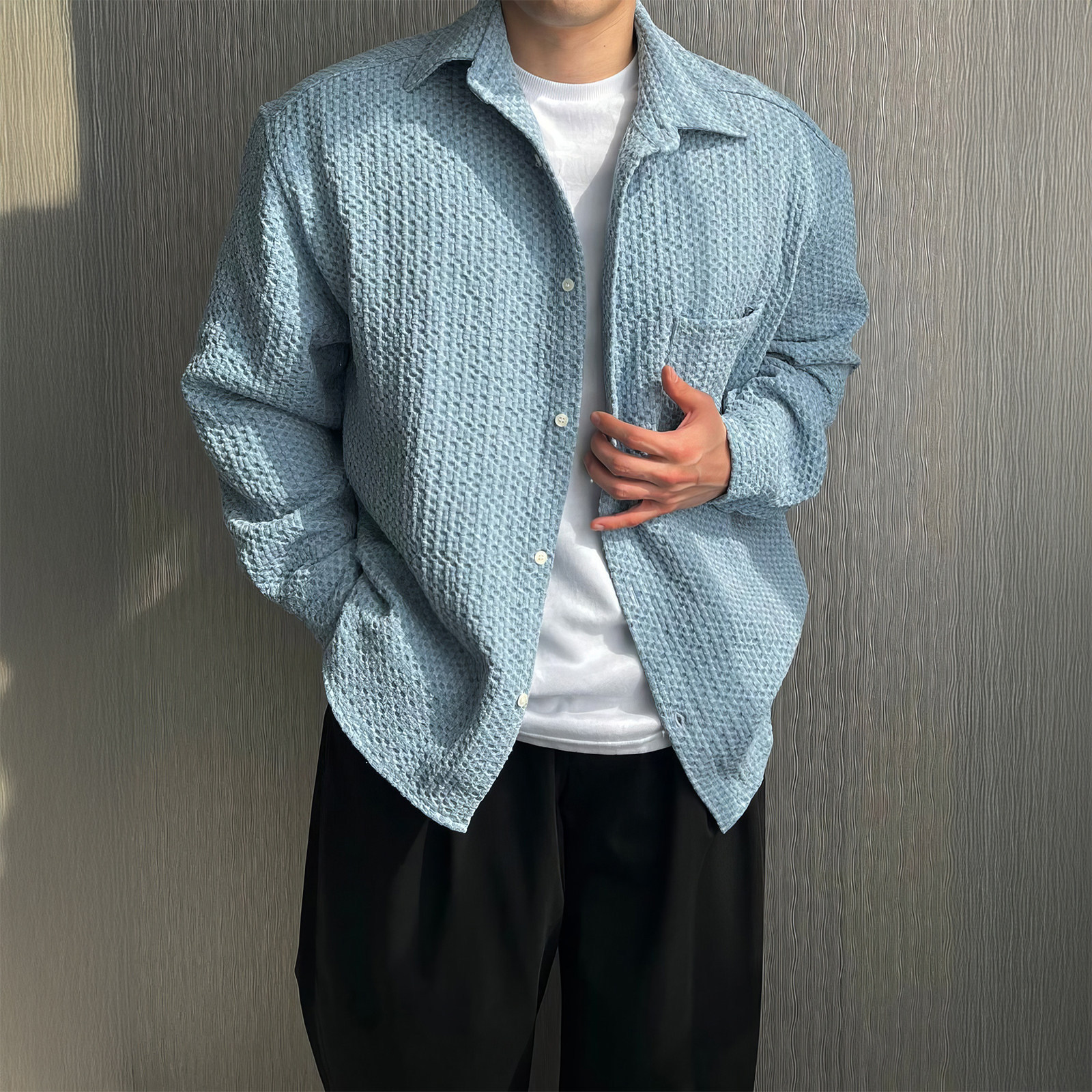 davidme立体肌理感做旧蜂窝格纹长袖牛仔衬衫男春秋文艺气质外套