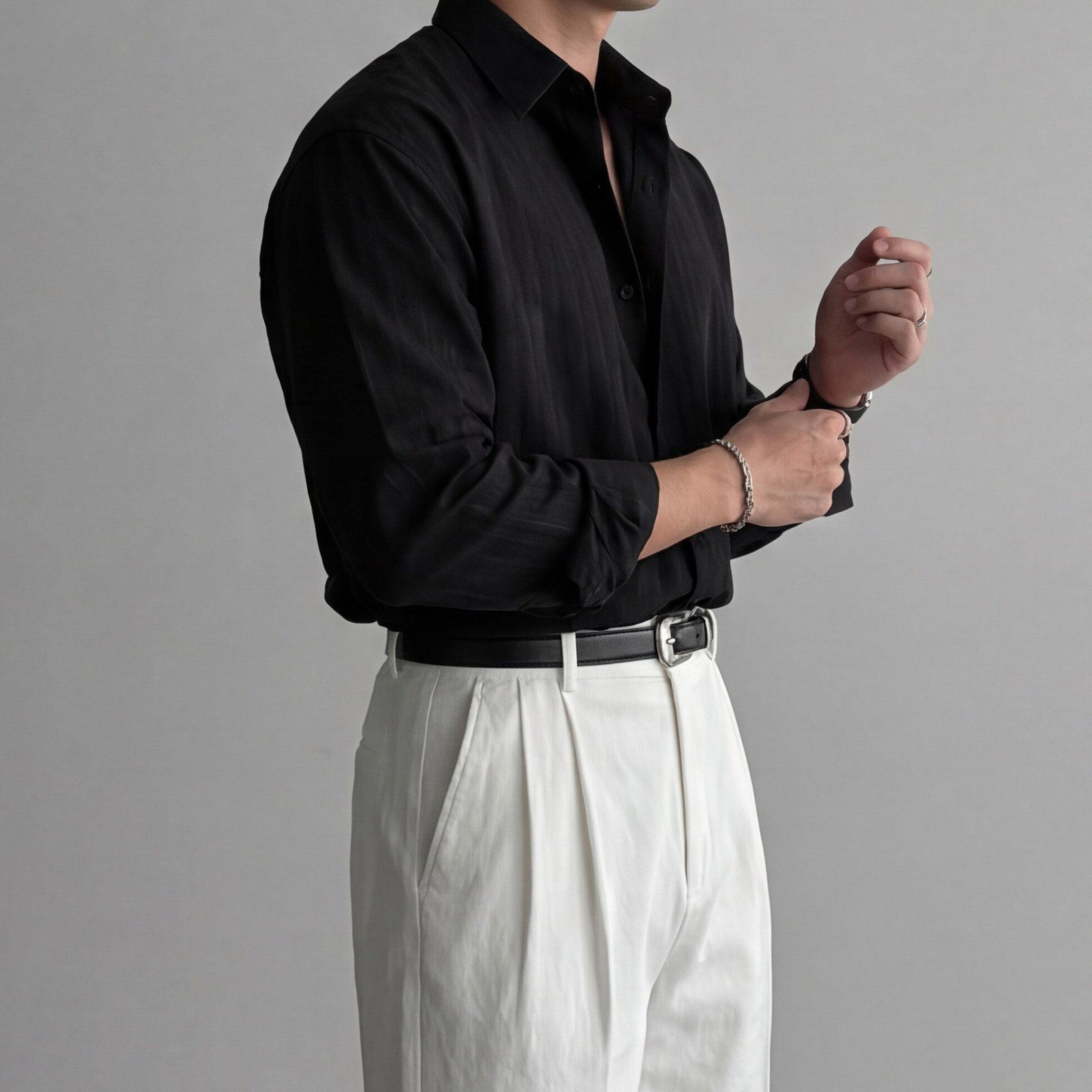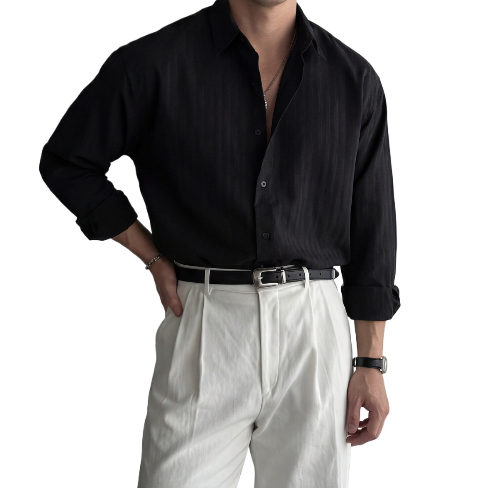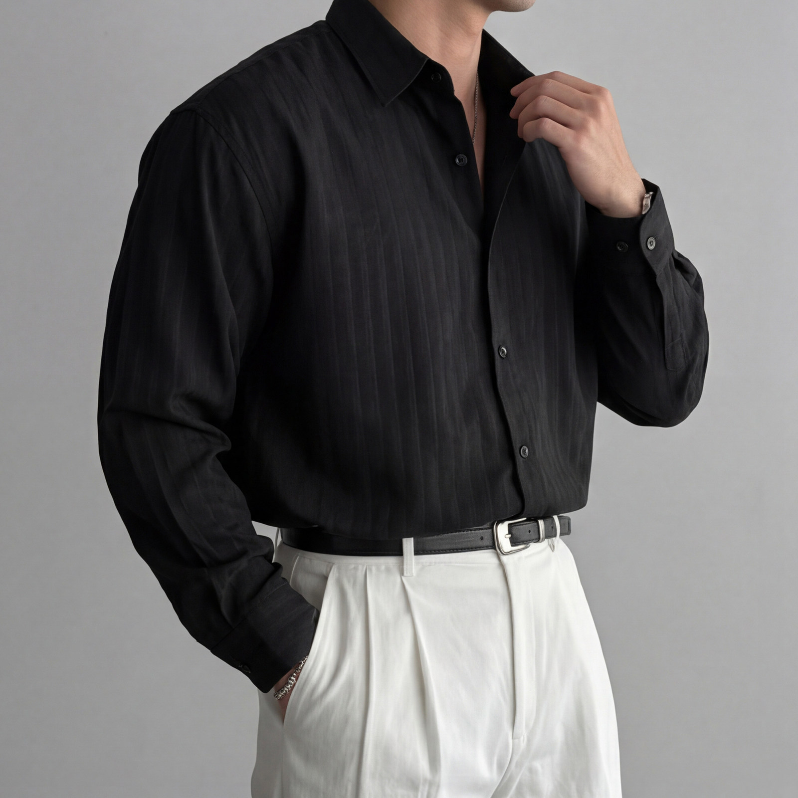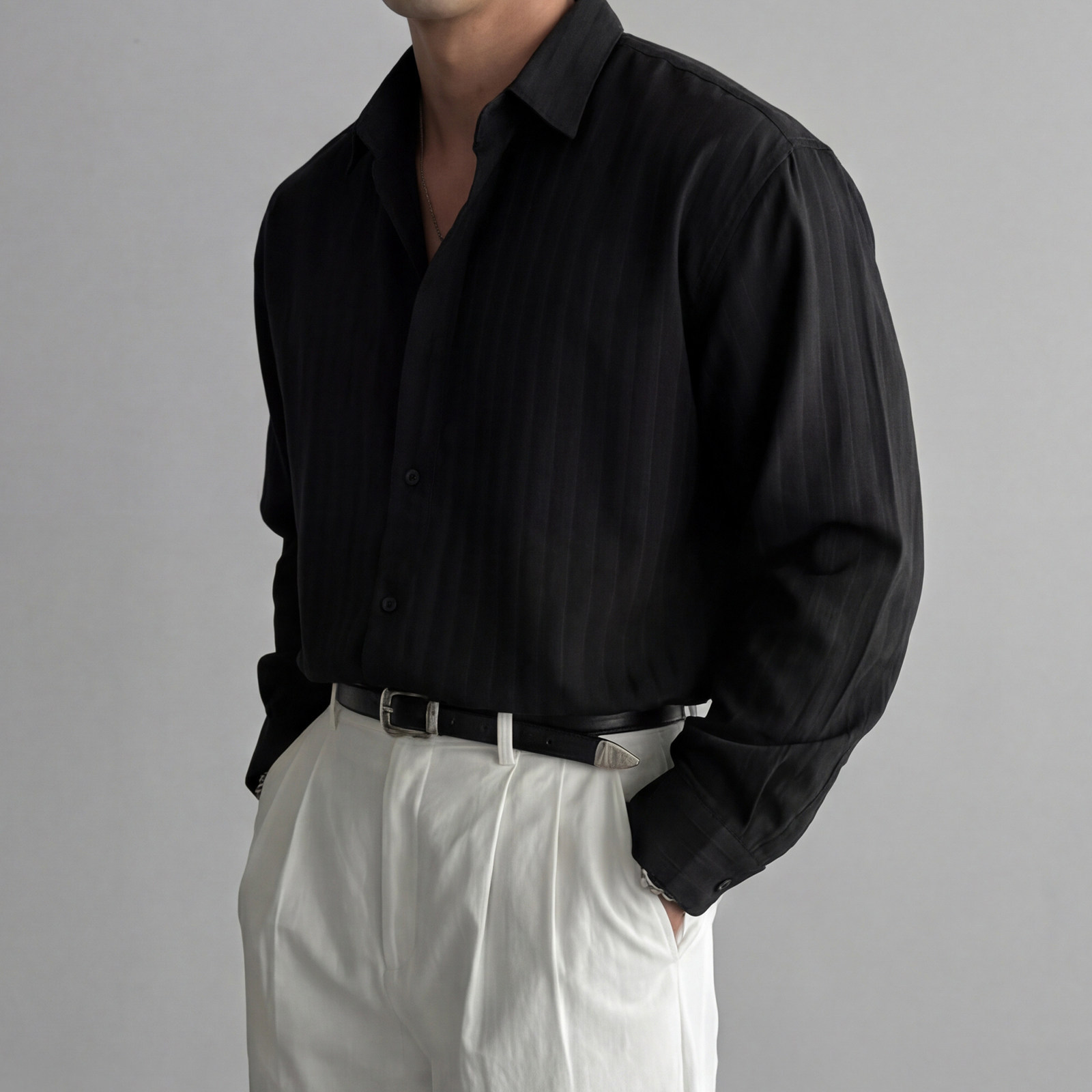 davidme黑色轻熟风条纹长袖衬衫男春秋休闲商务免烫宽松翻领衬衣