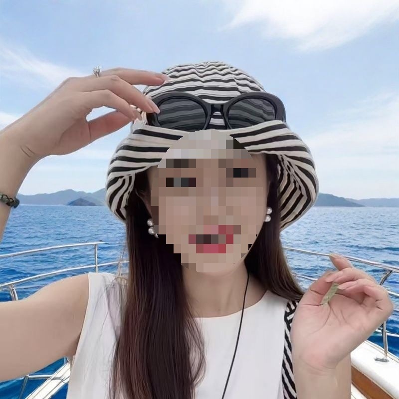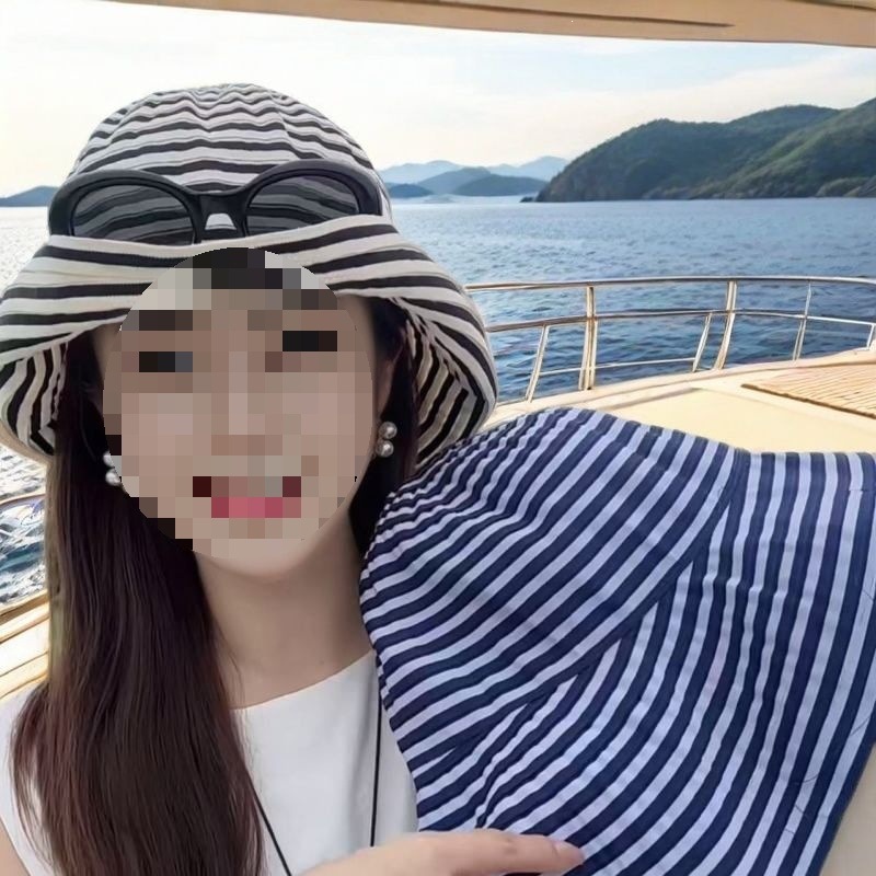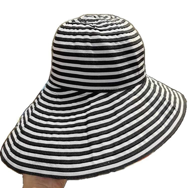 新款帽子遮阳帽防晒防紫外线女复古气质黑白条纹大帽檐太阳渔夫帽