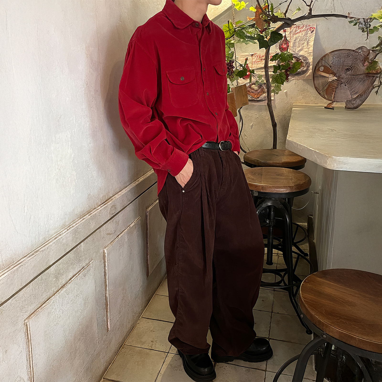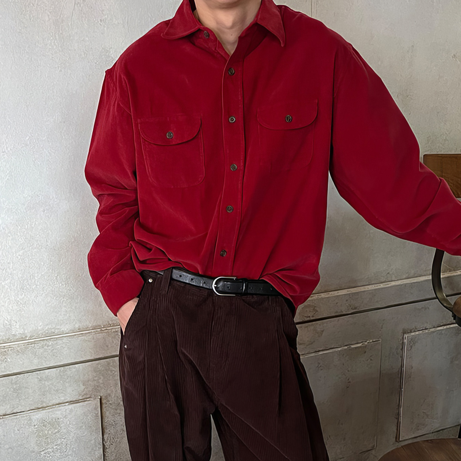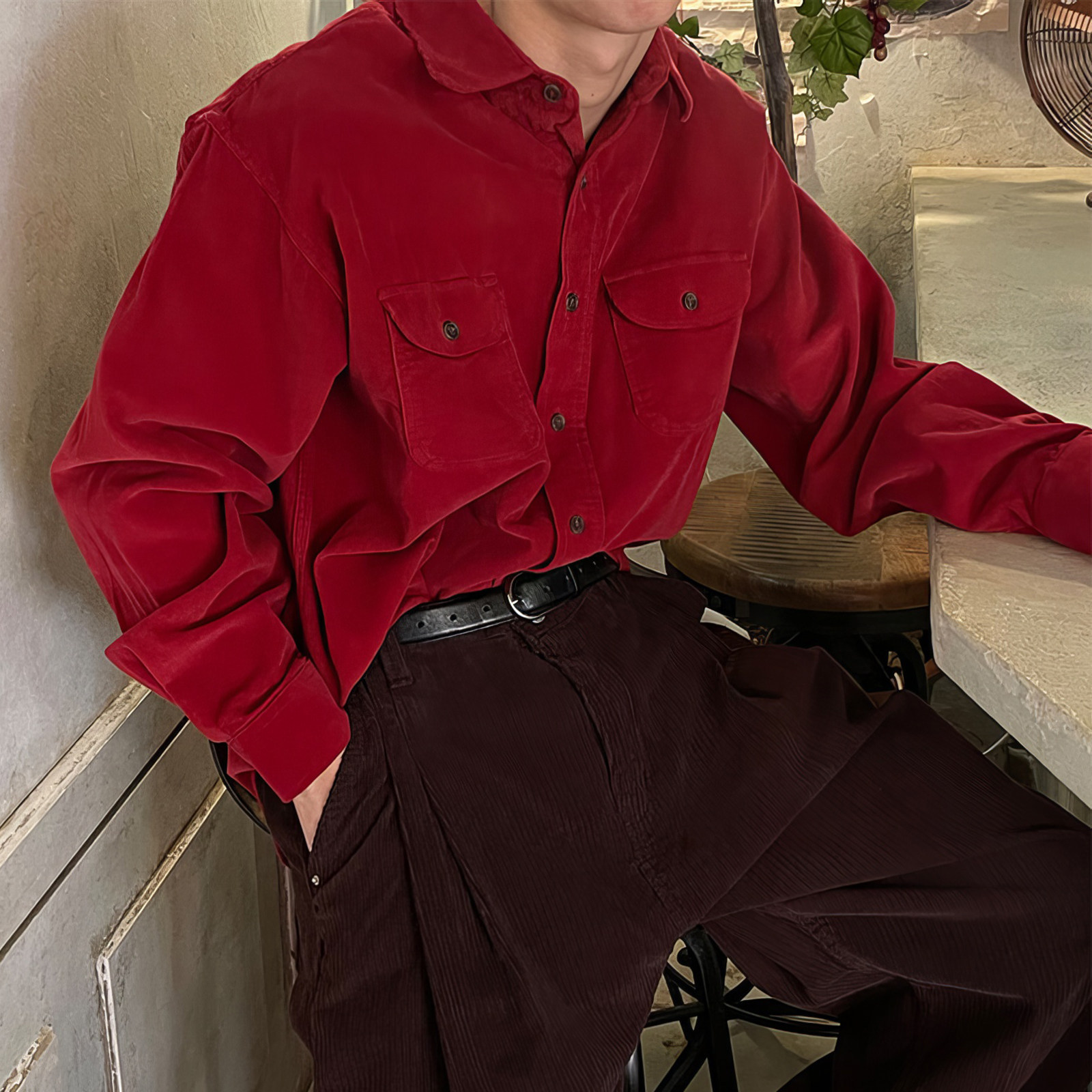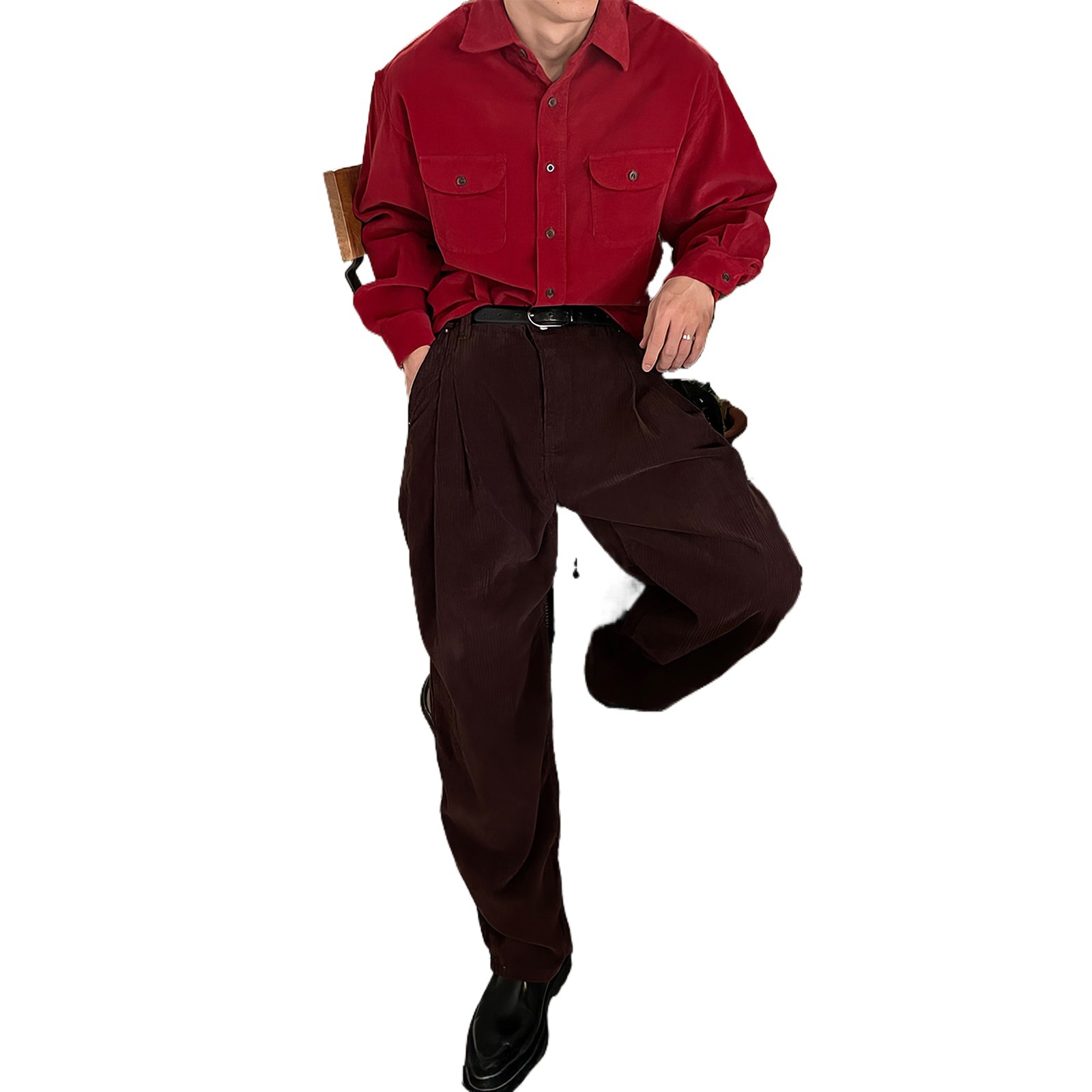 798 Design过年酒红色灯芯绒长袖衬衫男士冬季本命年内搭重磅衬衣