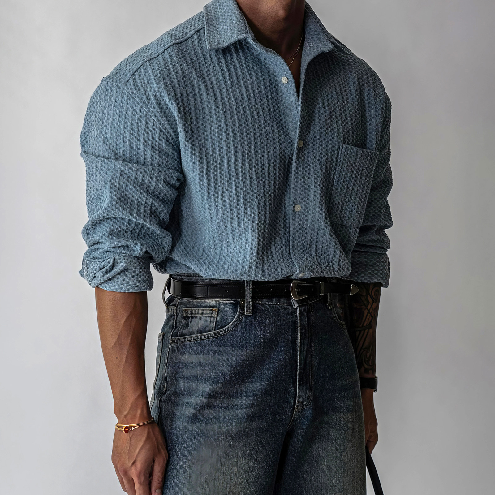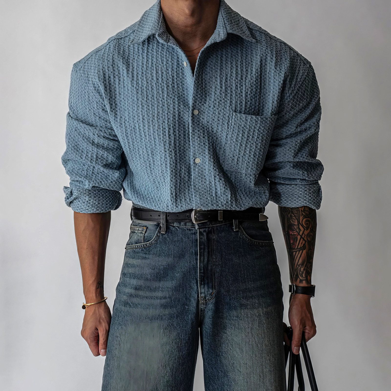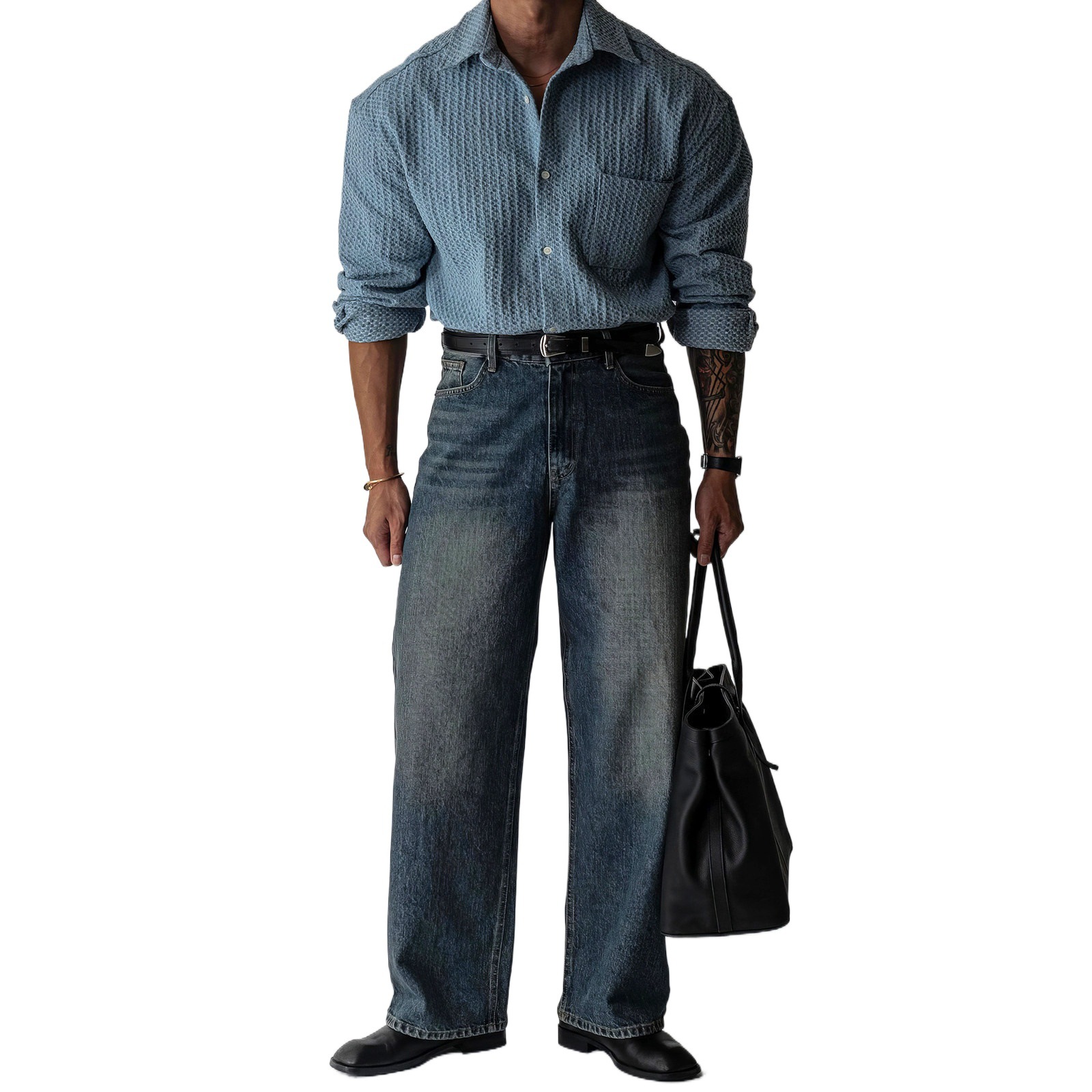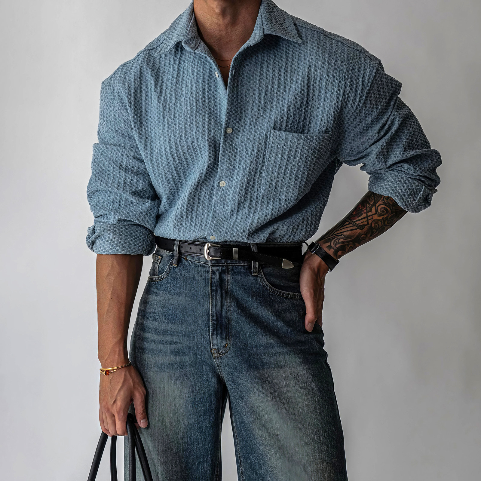 798 Design浅蓝色水洗美式长袖衬衫男士春秋轻熟风肌理感休闲衬衣
