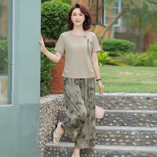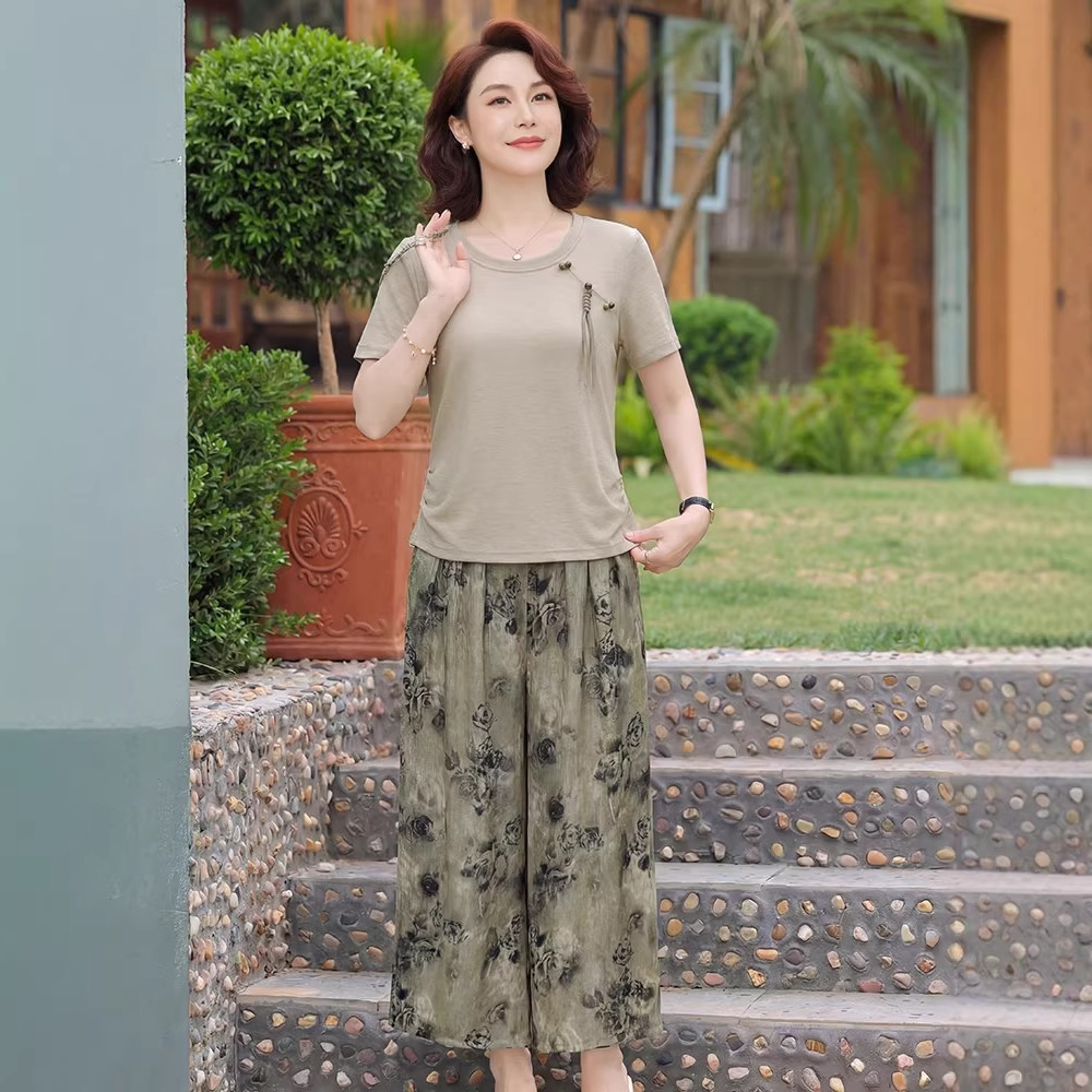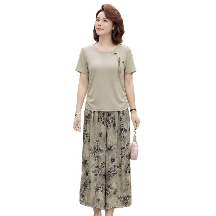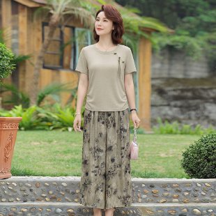 一件代发夏季妈妈装套装圆领短袖印花阔腿裤大码宽松显瘦中老年女