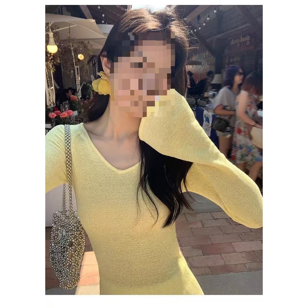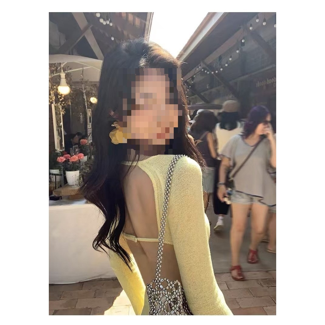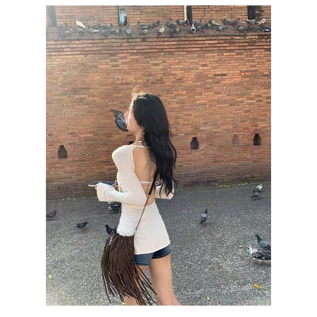 热辣背影杀 大露背领上衣女设计感微透喇叭袖毛针织恤均码欧美厚