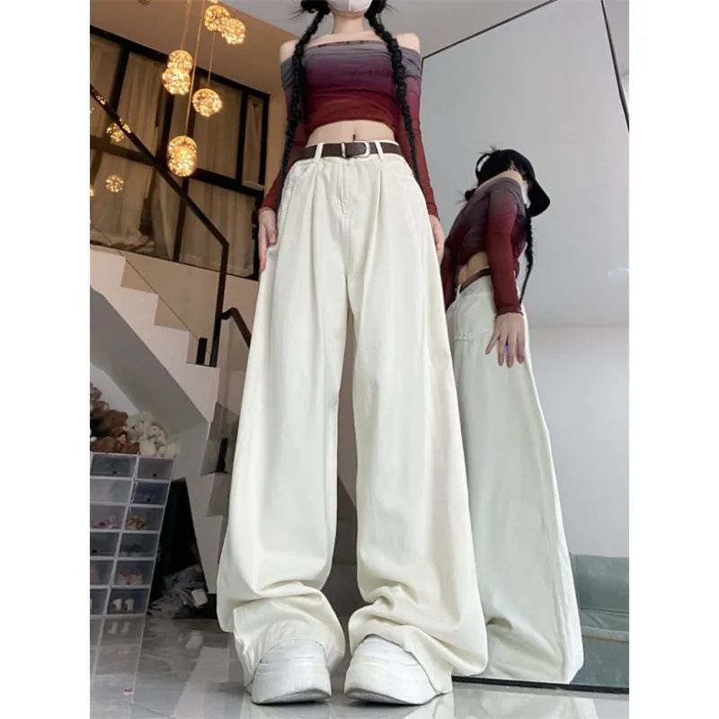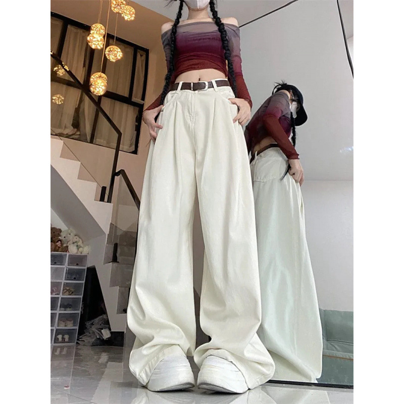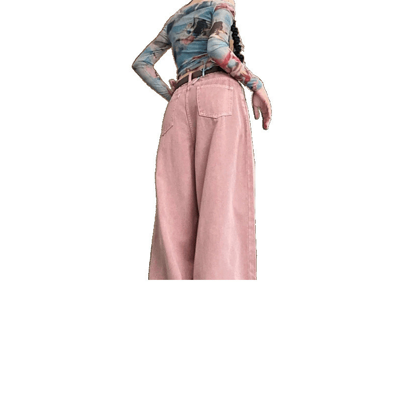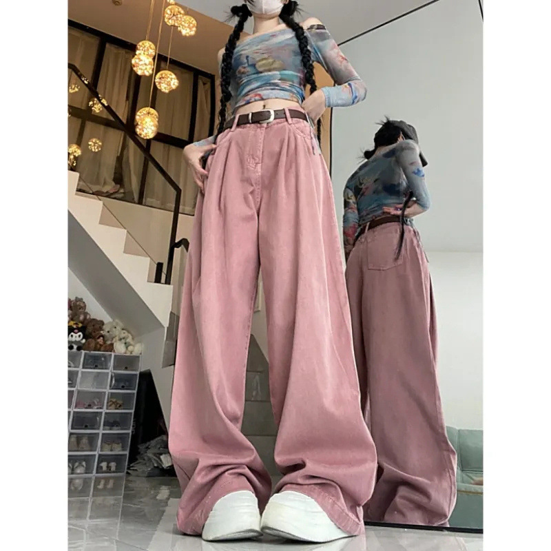 脏粉色褶皱阔腿牛仔裤女春夏季新款高腰显直筒垂感阔腿拖地裤子厚