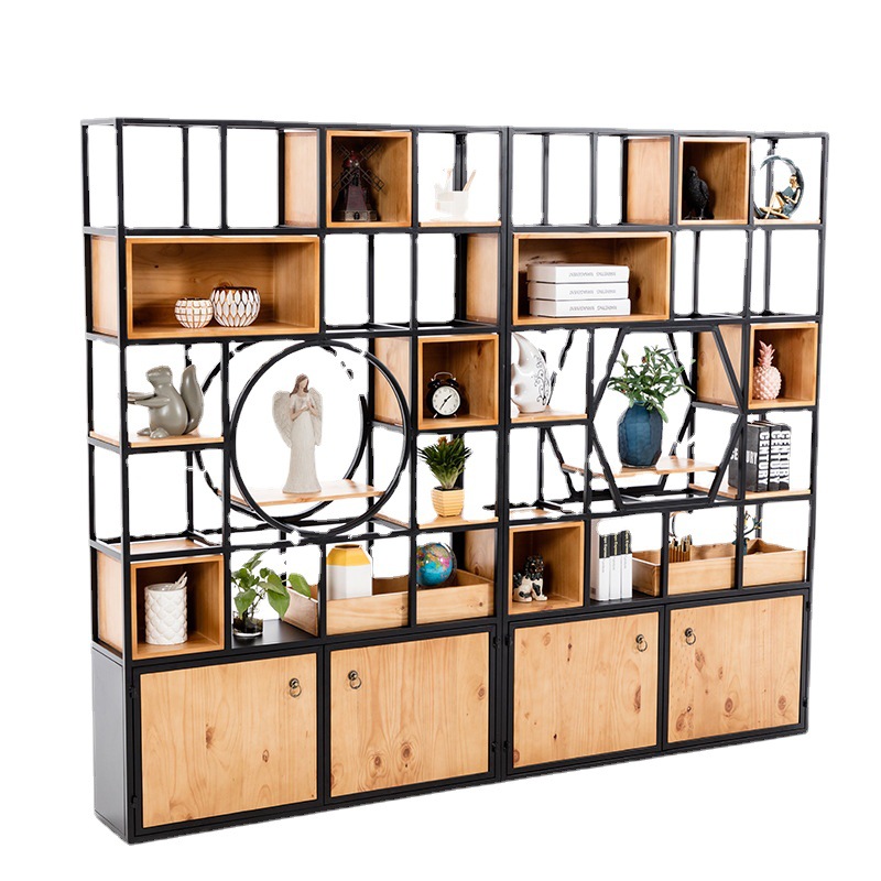 客厅落地隔断置物架美式实木书架餐厅铁艺格子展示架带木书柜