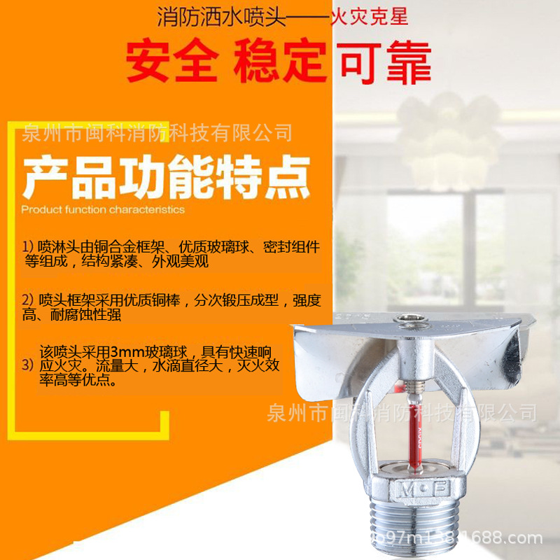 主营产品:消防器材:喷淋头,报警阀,室内消火栓,室外消火栓,湿式报警阀,预作用报警阀,雨淋阀,消防水带,七氟丙烷灭火装置,气溶胶灭火装置,消防阀门