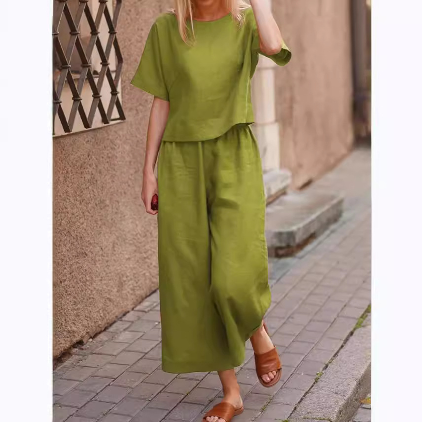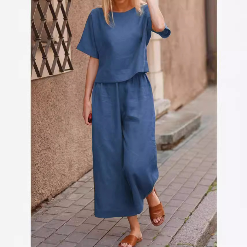 2023跨境亚马逊女装春夏新款休闲宽松纯色T恤+长裤两件套 现货