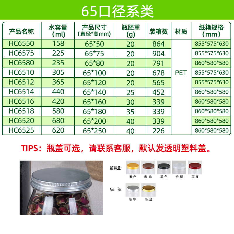 | 规格 | 直径65高度50mm瓶身20g(864个/箱) | 规格 | 直径65高度100mm瓶身20g(678个/箱) |
