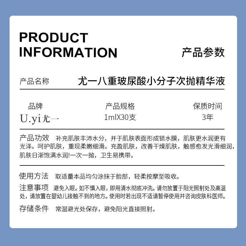 | 适用人群 | 通用 | 产品名称 | U.YI尤一玻尿酸原液补水润次抛精华液 |