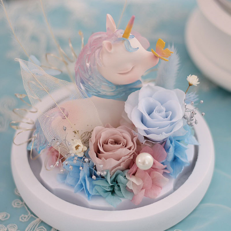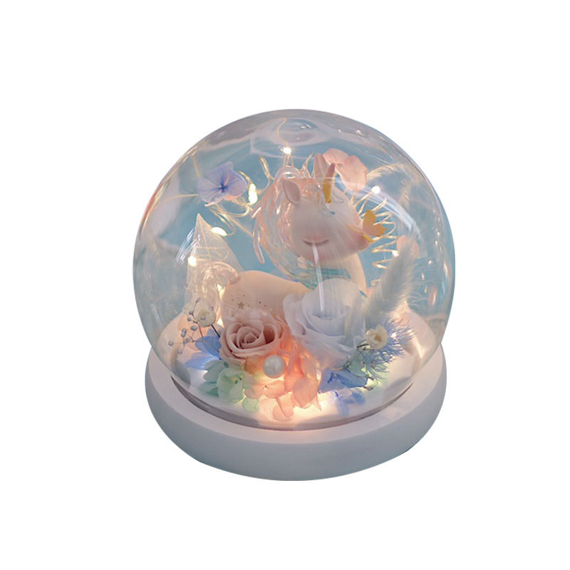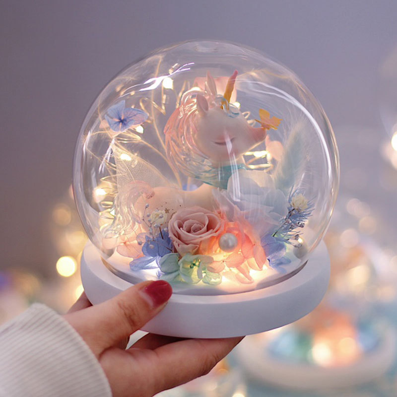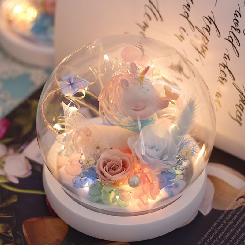 独角兽永生花摆件带灯玻璃罩情人节520六一儿童节送情侣闺蜜生日