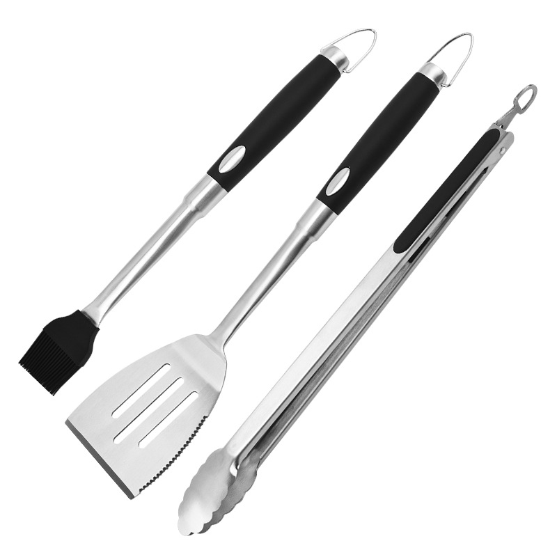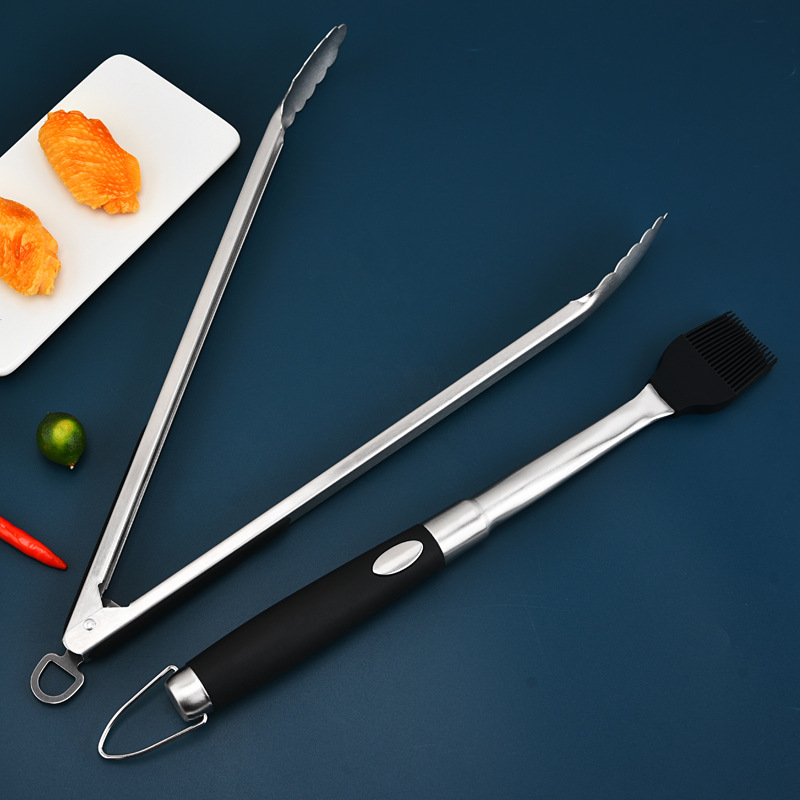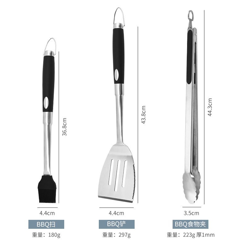 BBQ食物夹四件套装烧烤扫烧烤铲带牙刀手柄包橡塑户外烤具不锈钢