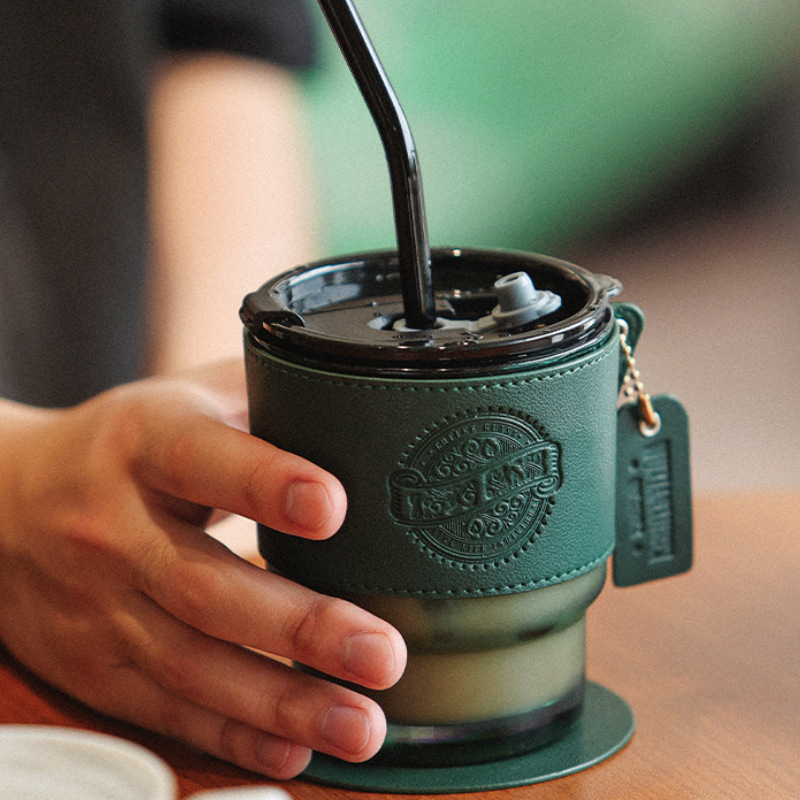 新款竹节杯皮革400ml咖啡杯套ins抖音热款吸管玻璃杯套送同色杯垫