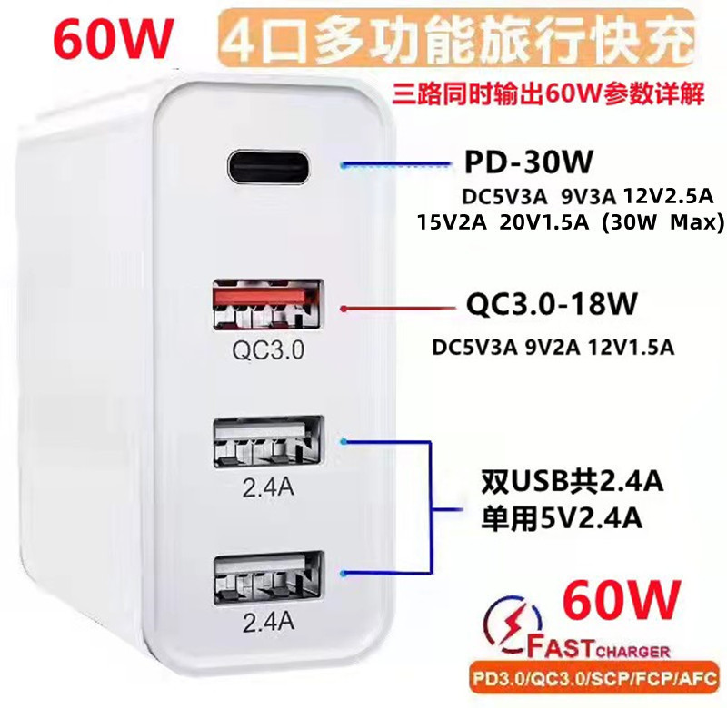 pd充电器 48W高通协议4USB快充充电头 48W四口pd+qc3.0手机适配器