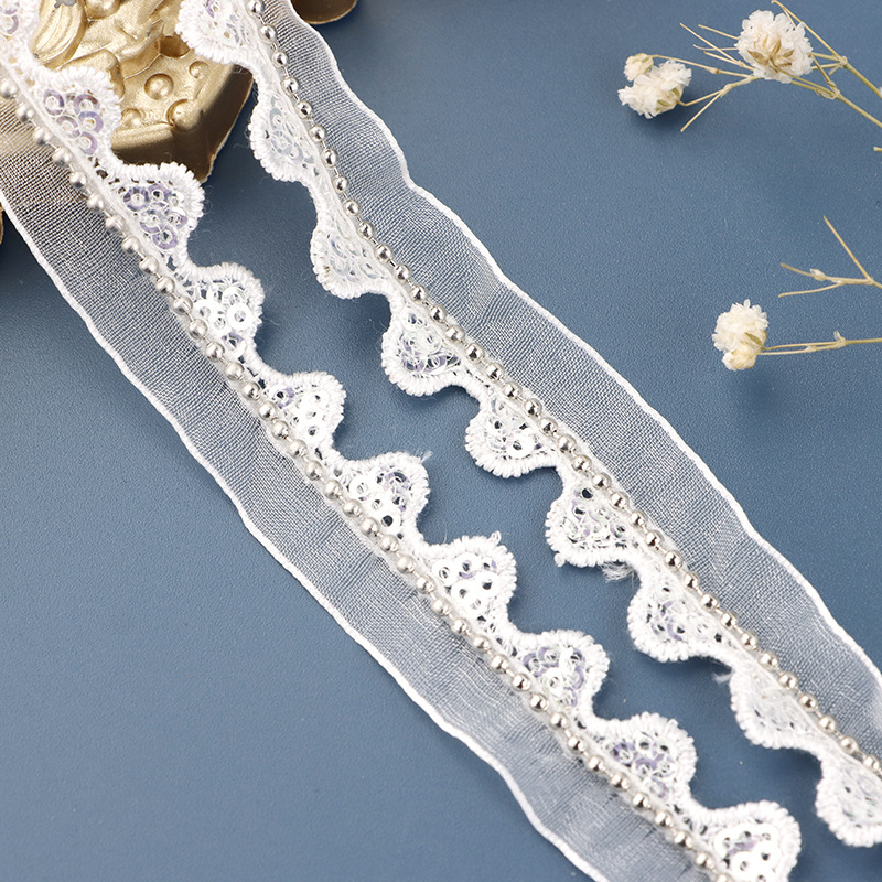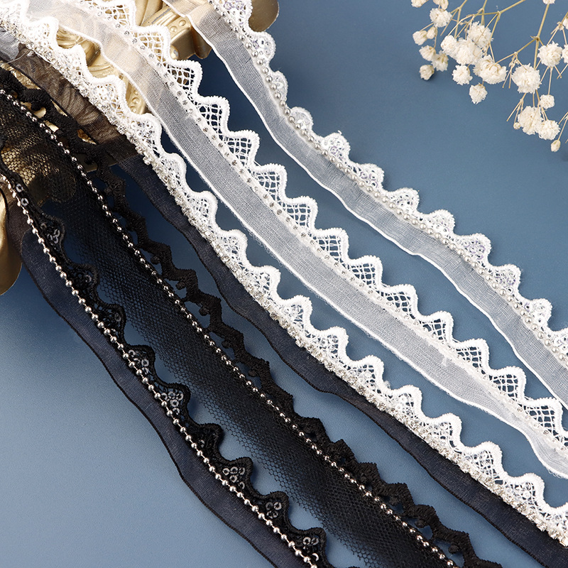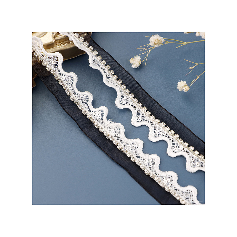 | 规格型号 | 2cm黑丝带白水溶花边加爪钻 | 规格型号 | 2cm白色丝带水溶花边加2mm圆珠 |