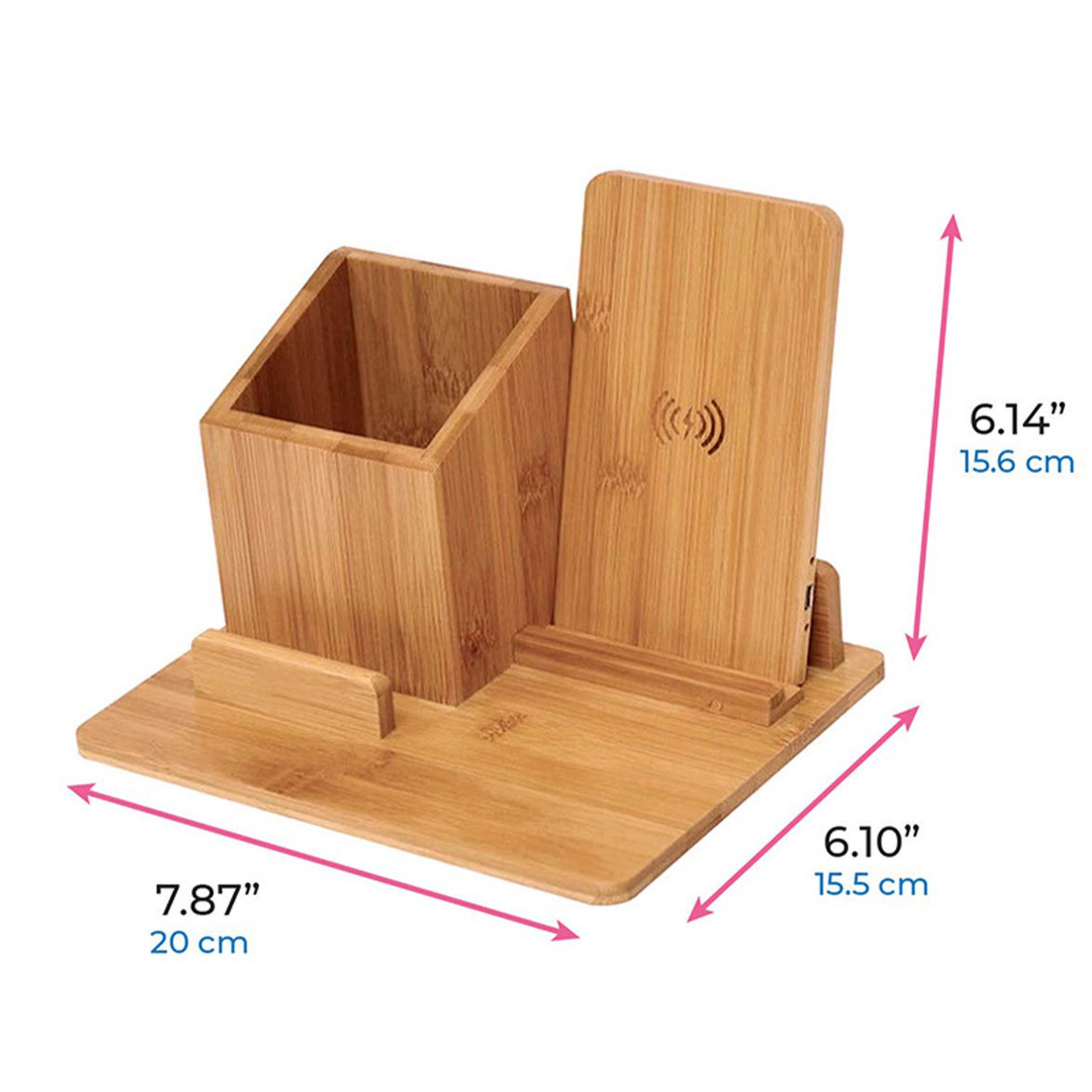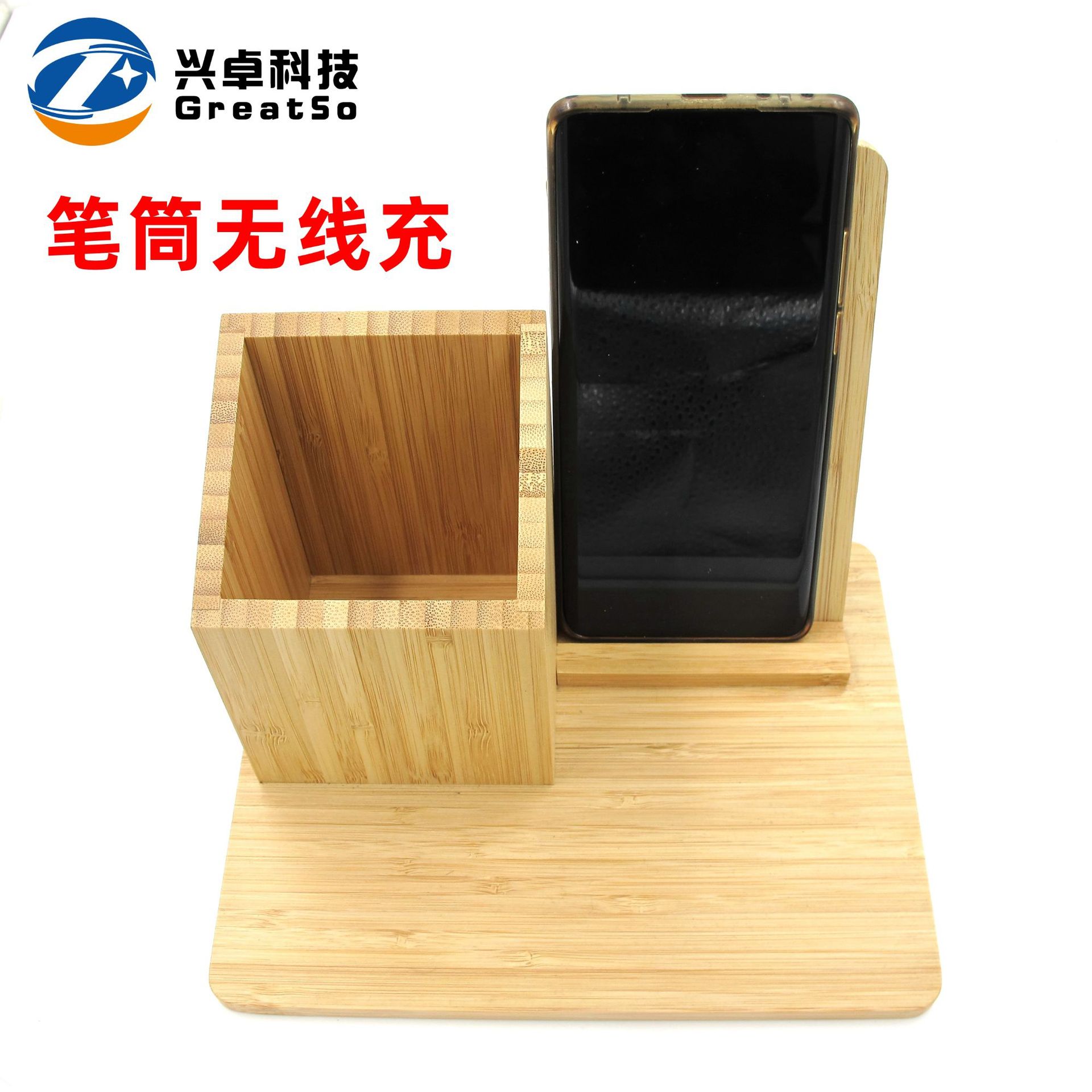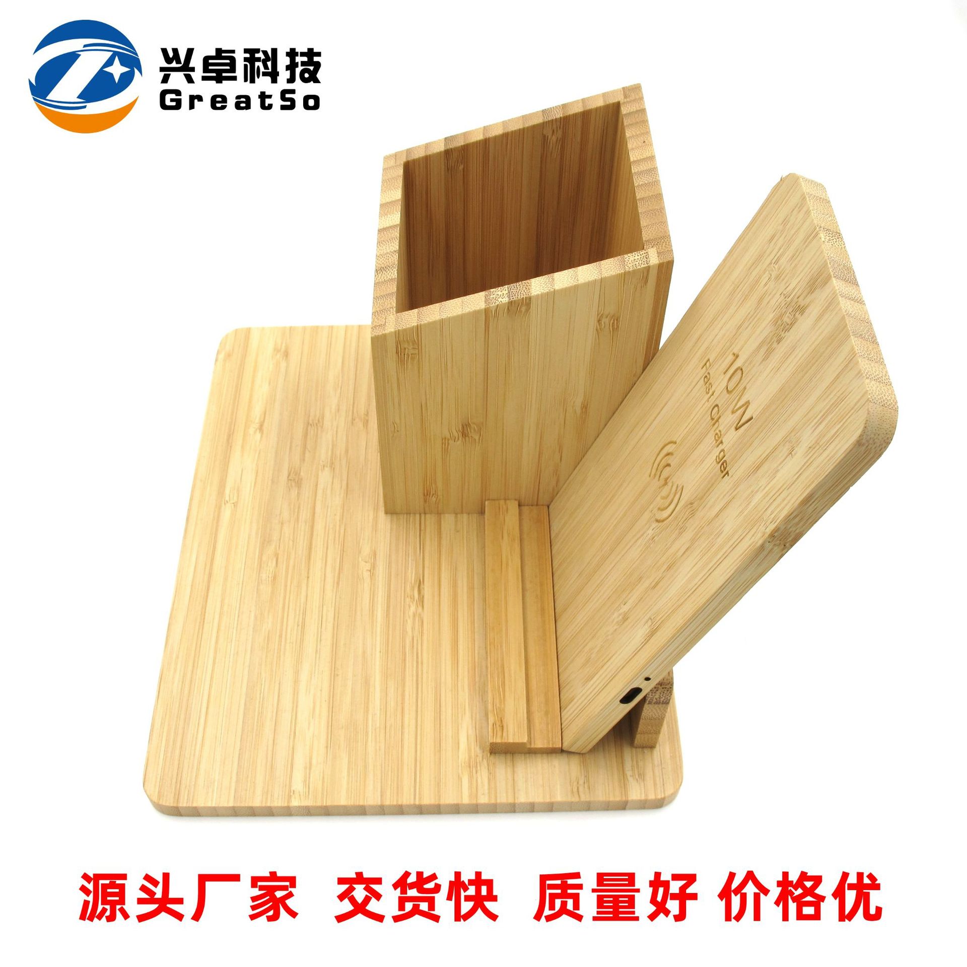 桌面竹木材质笔筒无线充手机支架10W 带收纳盒无线充功能