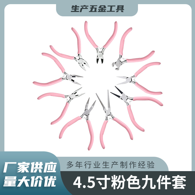 4.5寸粉色九件套多功能钳子珠宝钳首饰diy钢丝钳圆嘴钳斜嘴钳