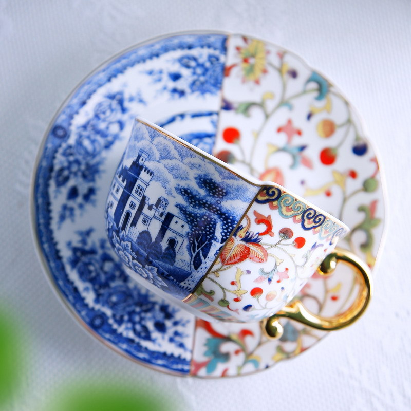新中式礼物金把不规则咖啡杯碟斗彩青花玫瑰陶瓷杯两杯两碟礼盒装