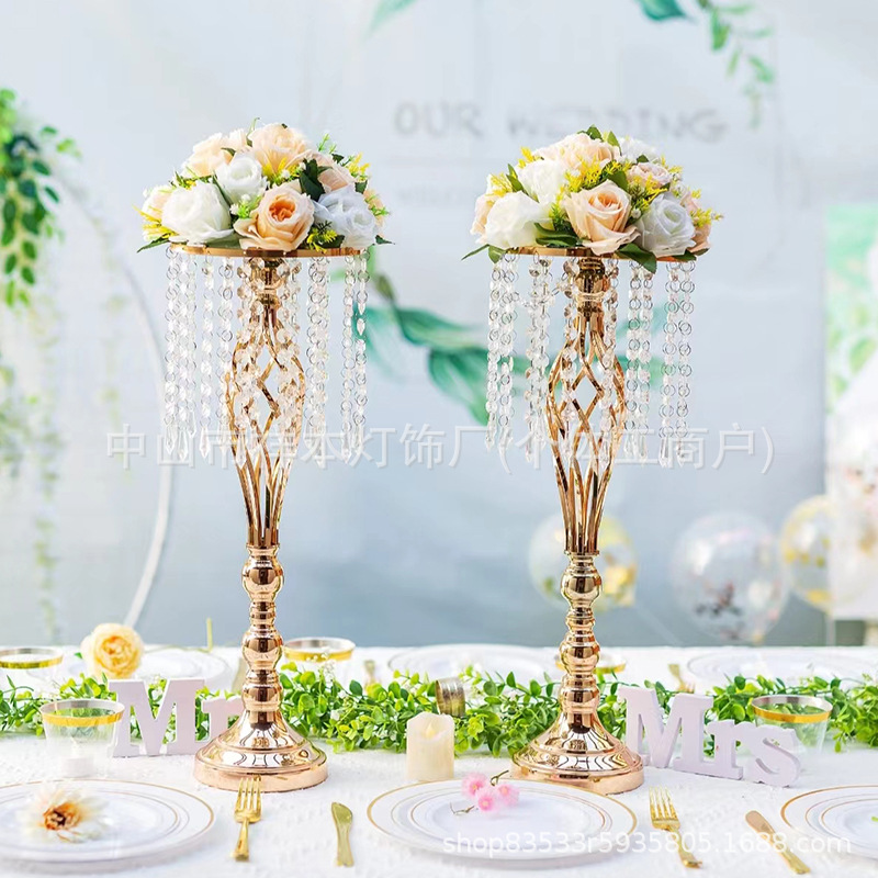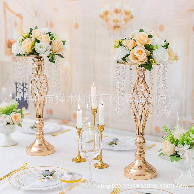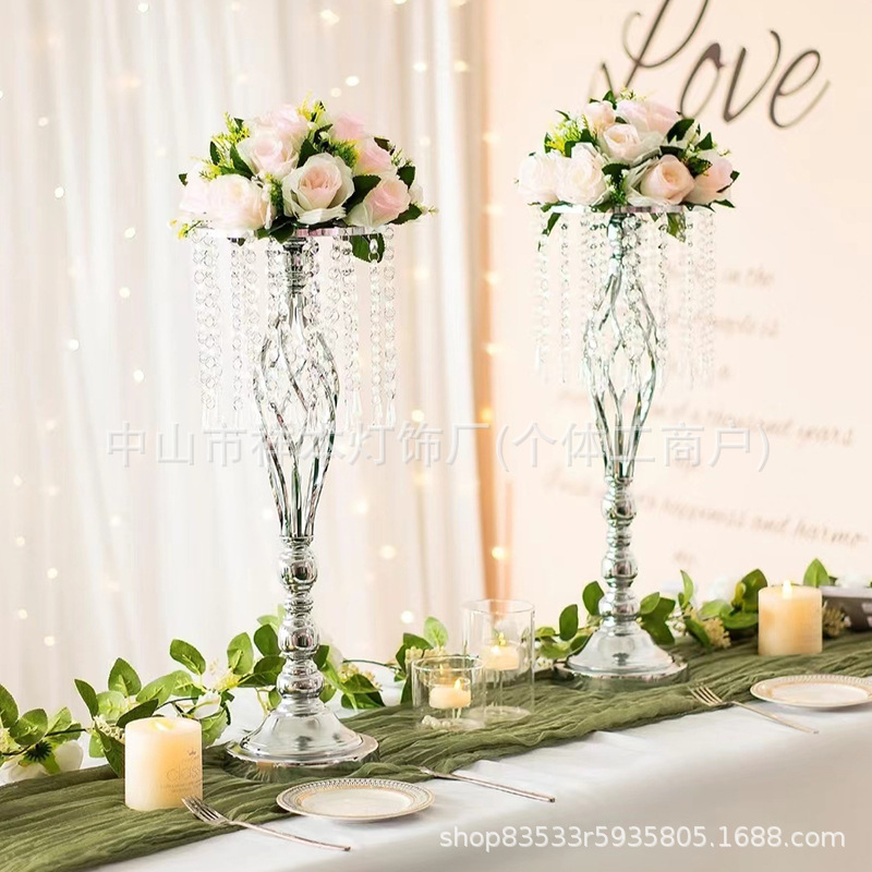 亚马逊电镀铁艺花架花器造型 欧式水晶挂珠麻花烛台 婚庆摆件供应
