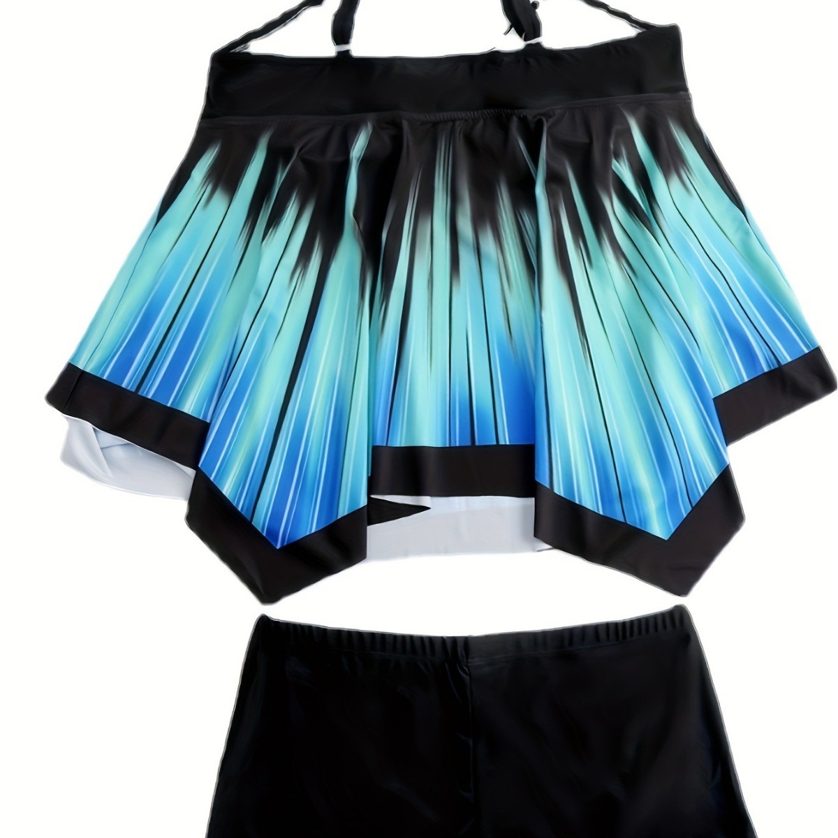 2024加肥蓝黑印花保守遮肚分体短裤防晒速干沙滩泳衣女欧美保守