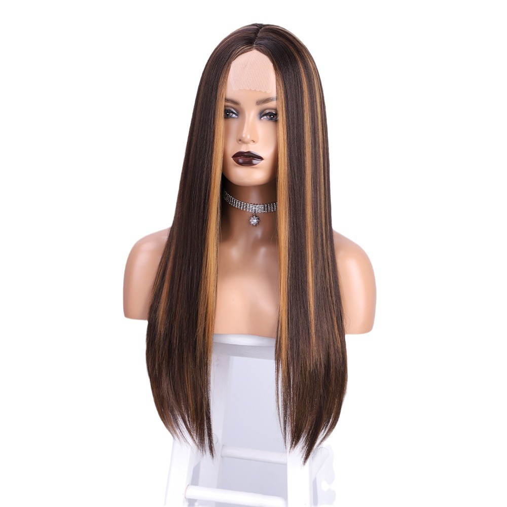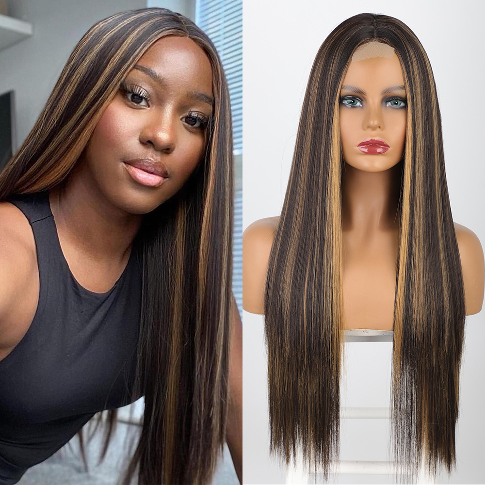 欧美女士热销长直发化纤高温丝小蕾丝highlight wig钢琴色假发套
