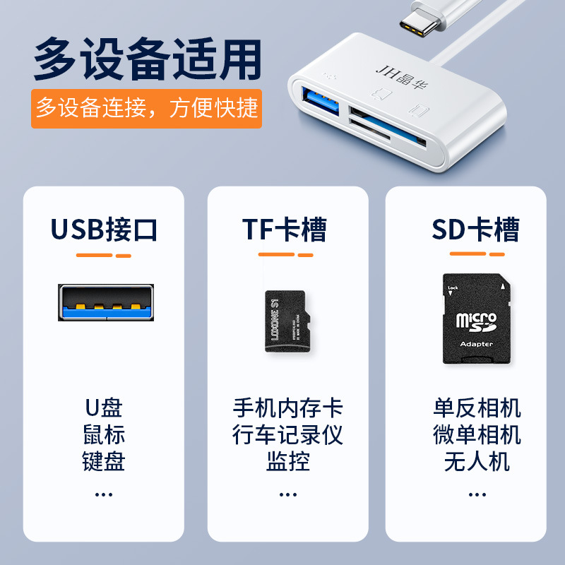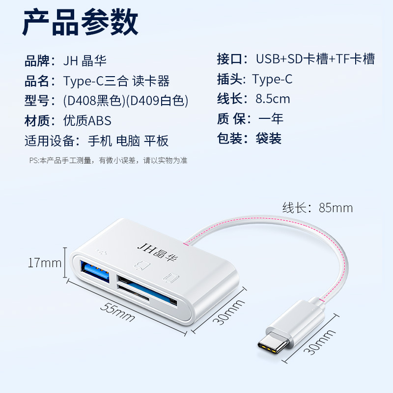 | 颜色 | D409 Type-C/TF/SD/接U盘读卡器白色 | 颜色 | D408 Type-C/TF/SD/接U盘读卡器黑色 |