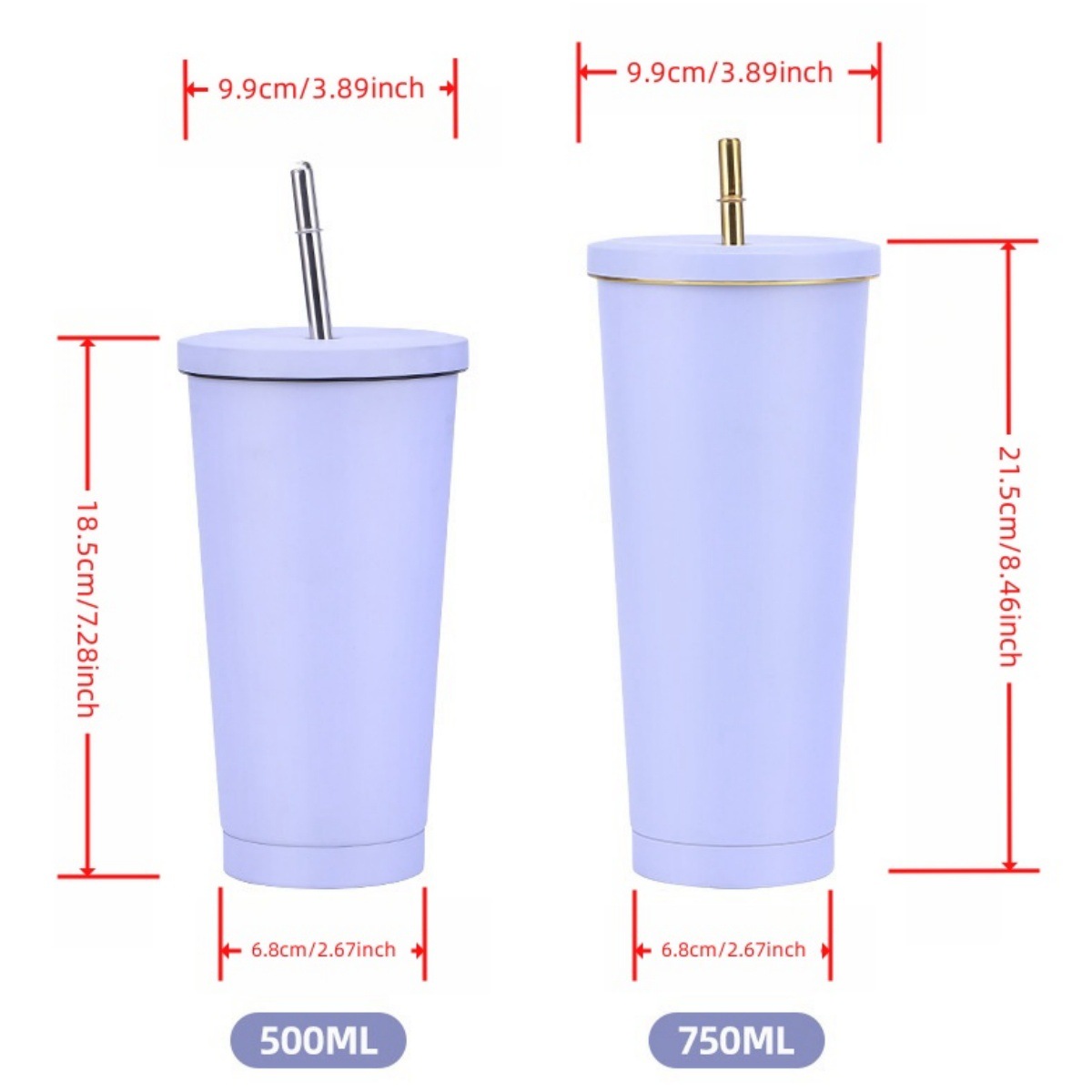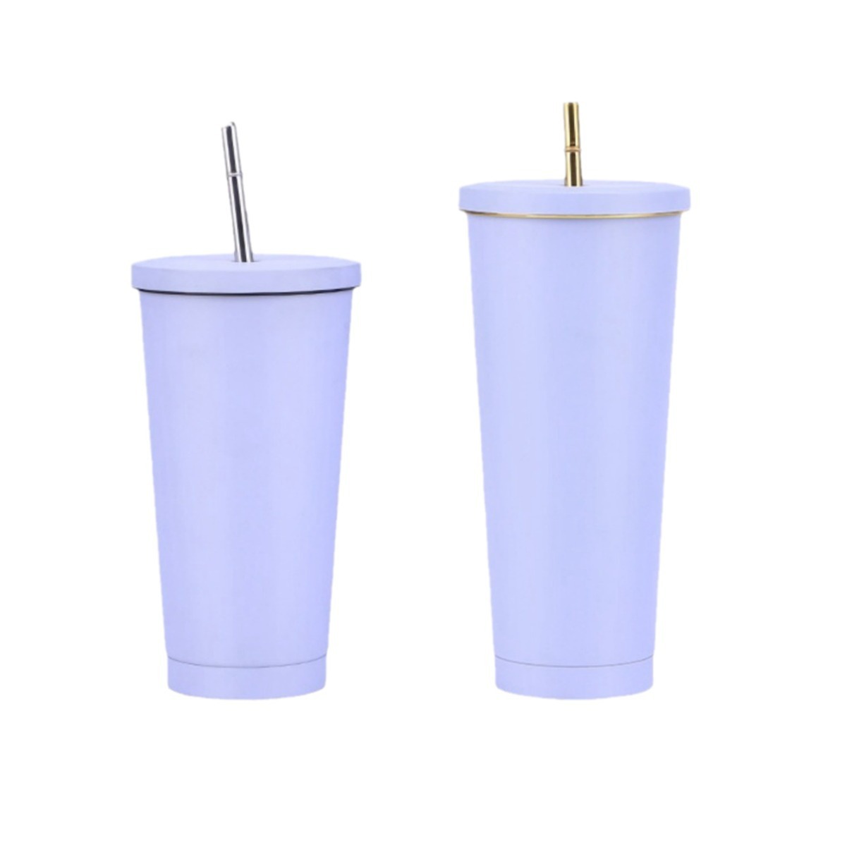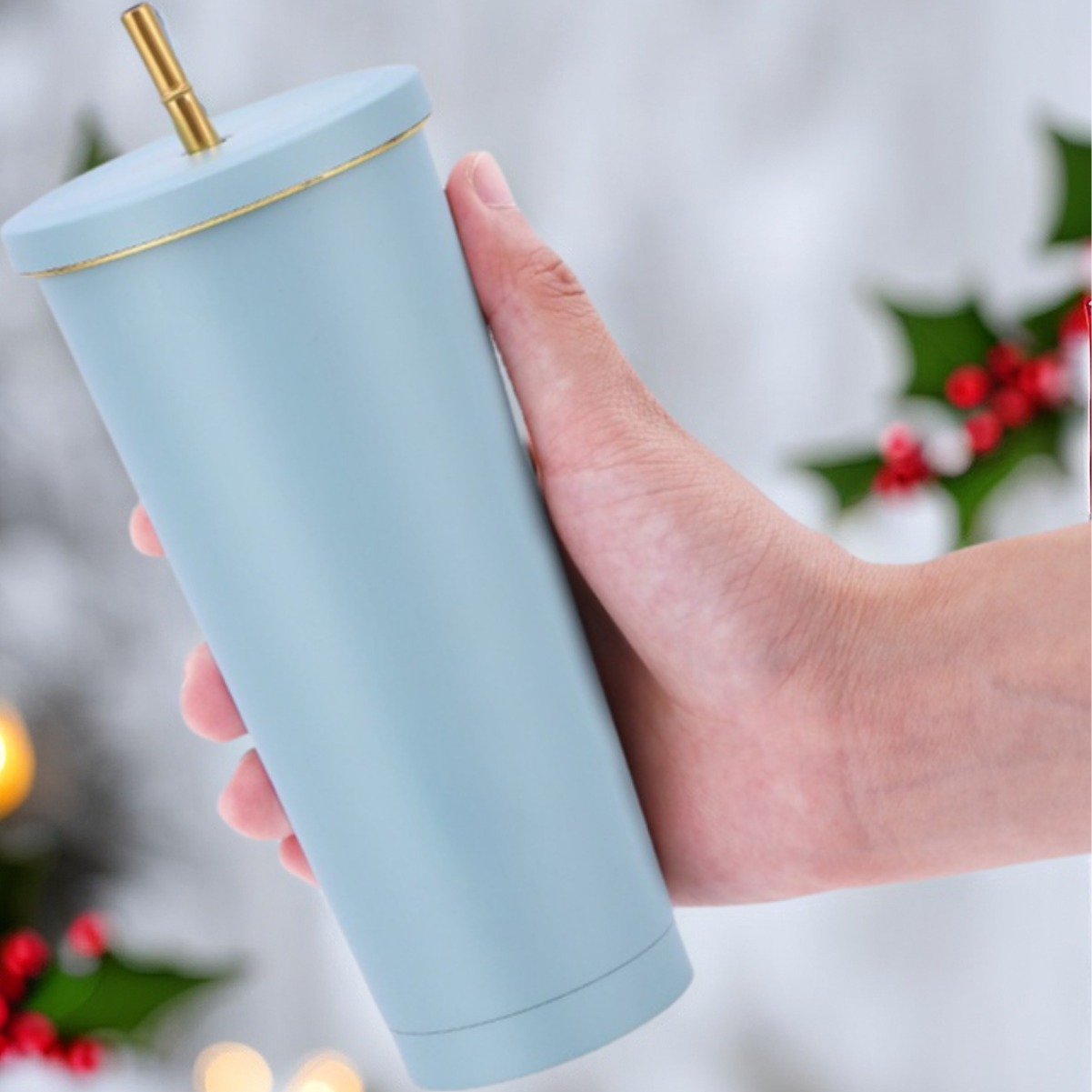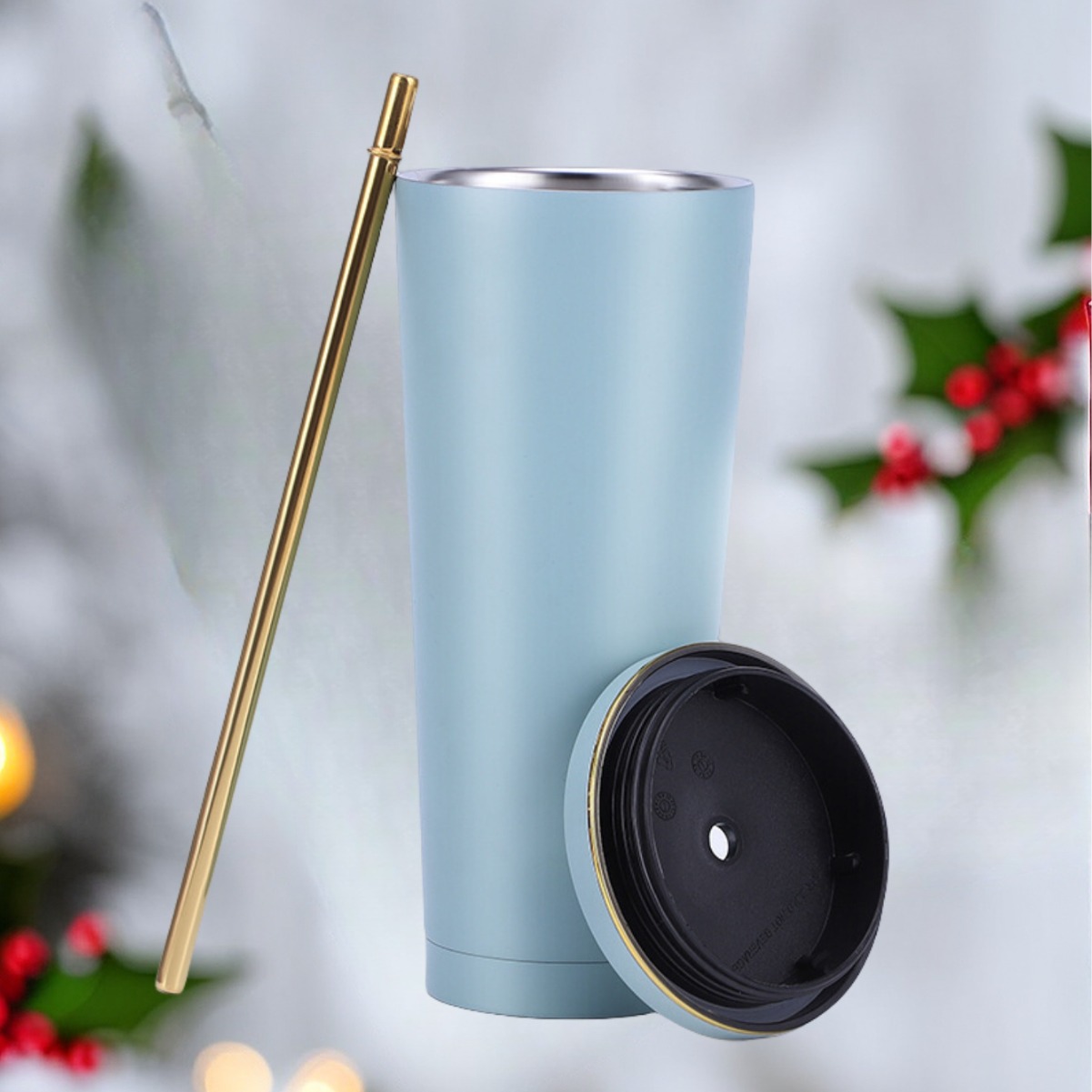 吸管金边保温杯创意真空吸管杯户外车载便携随 行咖啡杯