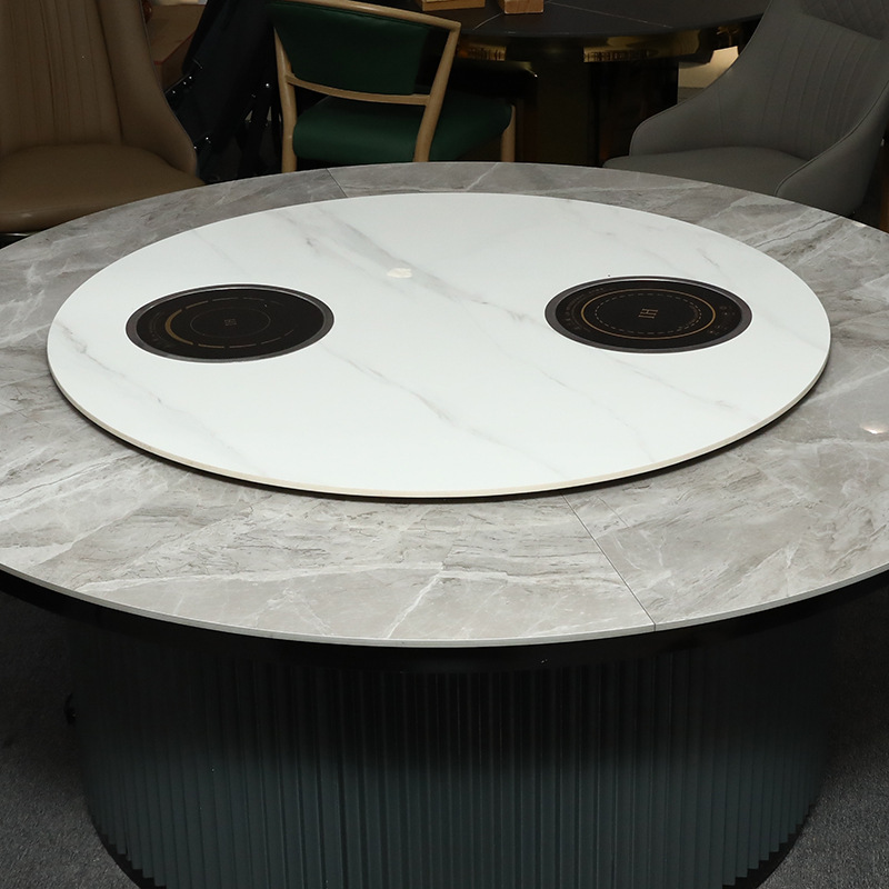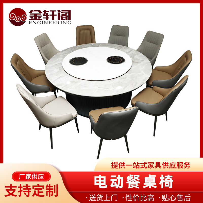 电动餐桌椅大理石岩板桌面餐厅饭店包厢大圆桌大理石转盘新中式