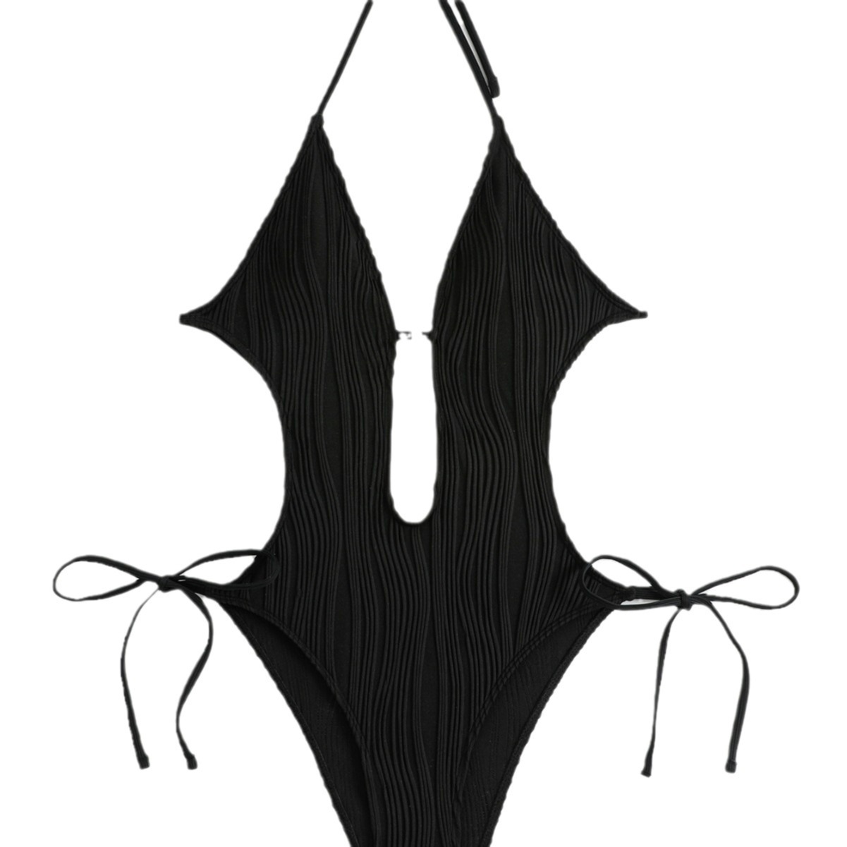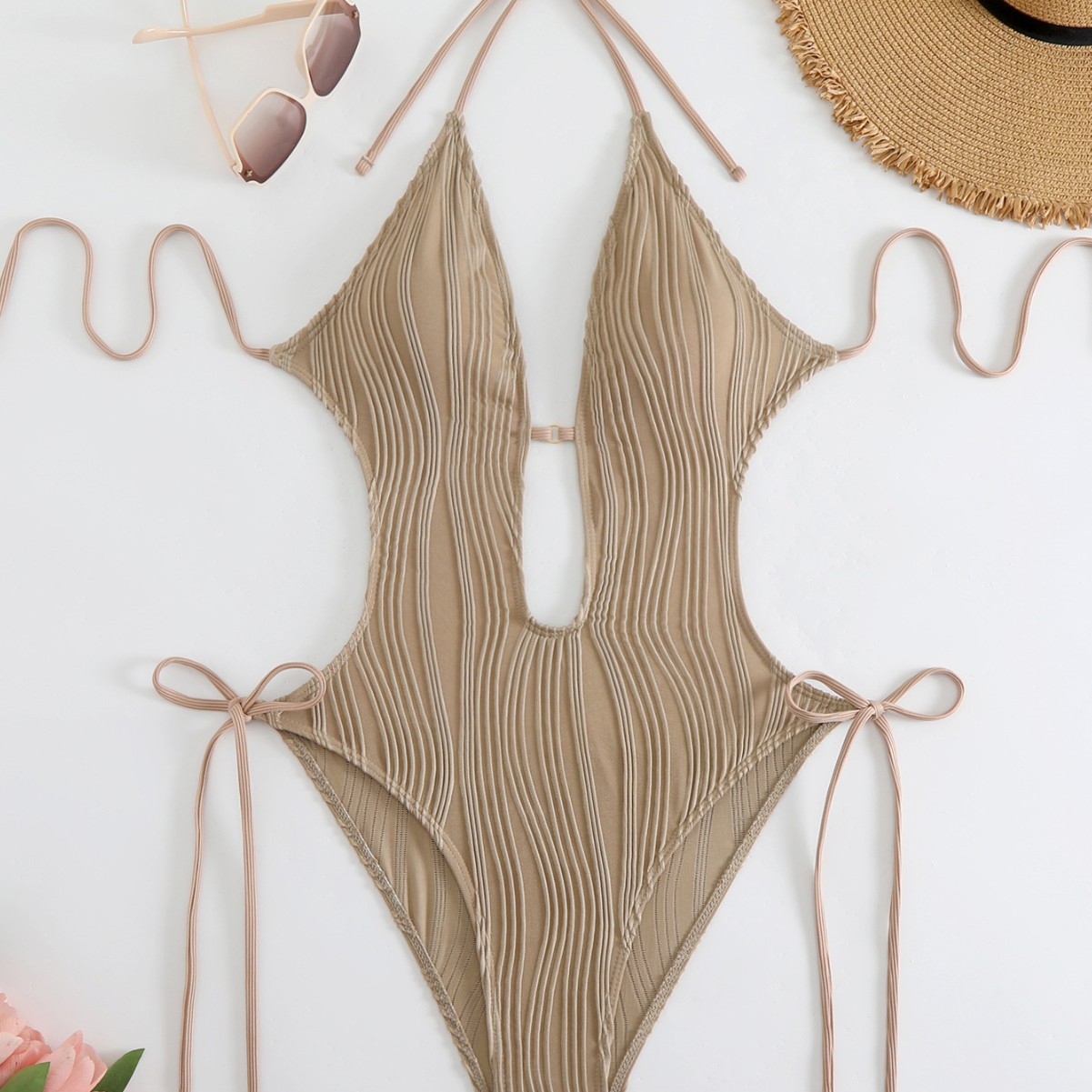 欧美外贸时尚爆款泳衣一件式镂空绑带露背泳装热卖纯色比基尼现货