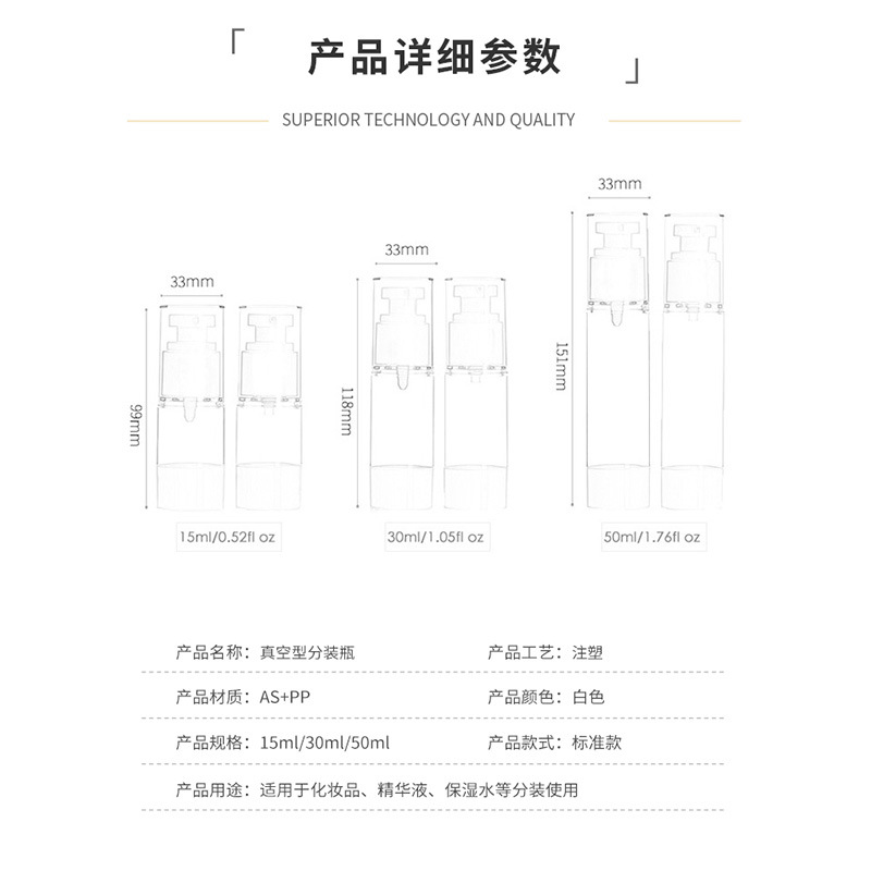 规格型号 | 50;圆头喷雾真空瓶;聚丙烯PP | | 规格型号 | 50;圆头乳液真空瓶;聚丙烯PP |