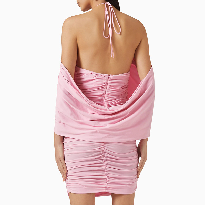 跨境欧美明星同款派对演出性感轻礼服卡肩挂脖褶皱修身包臀连衣裙
